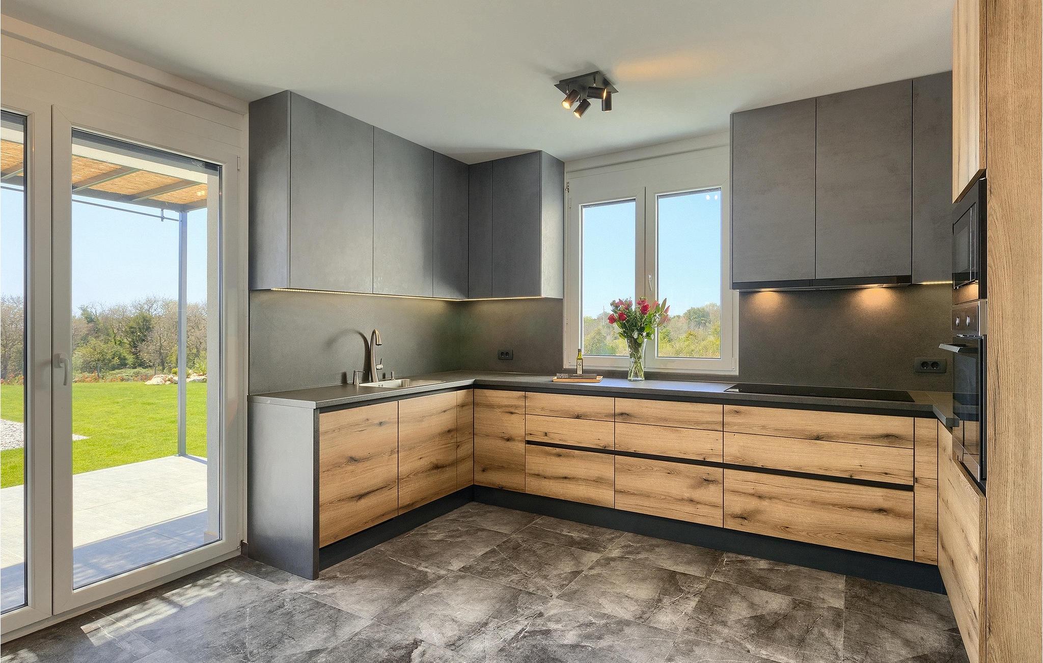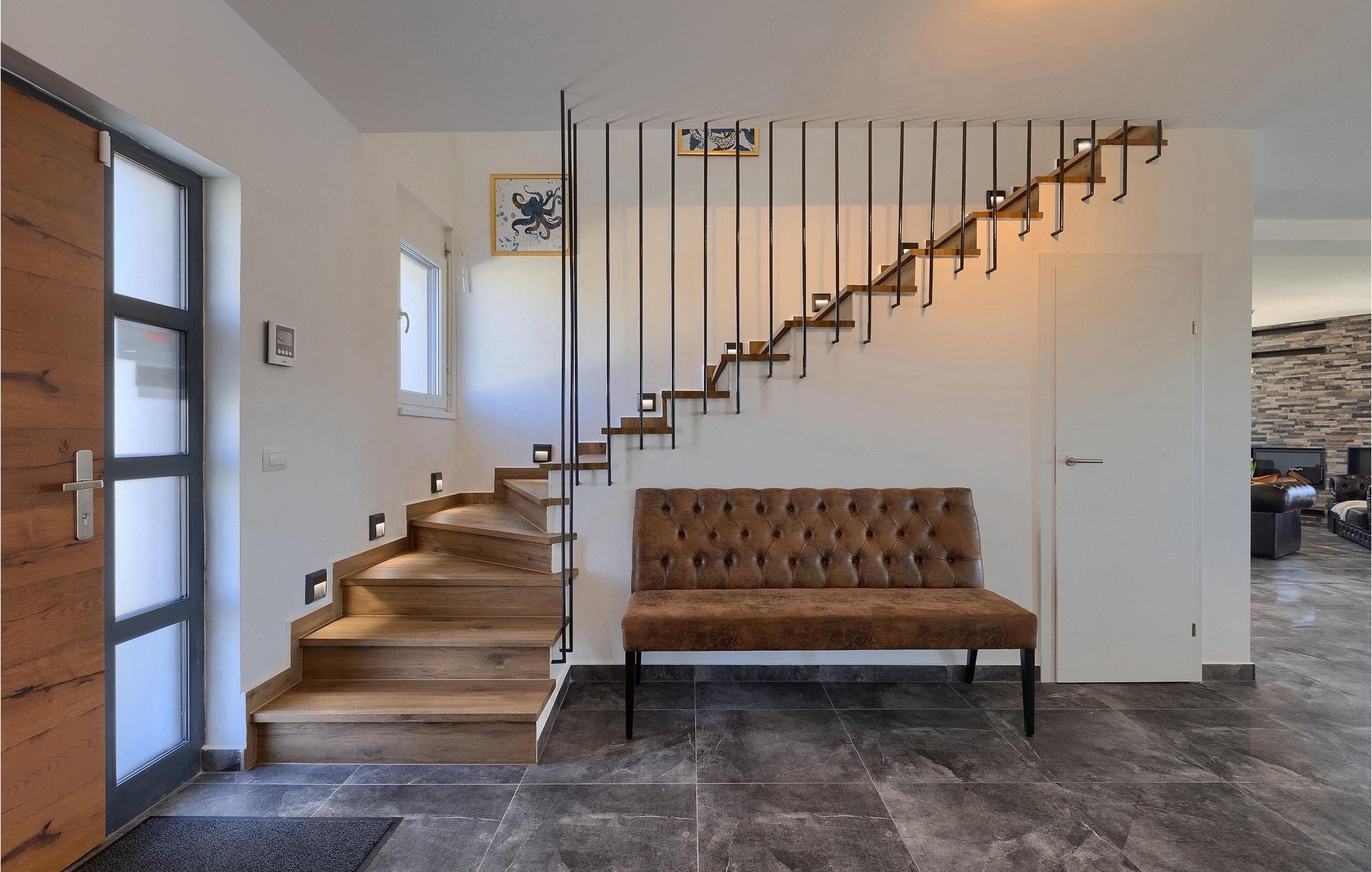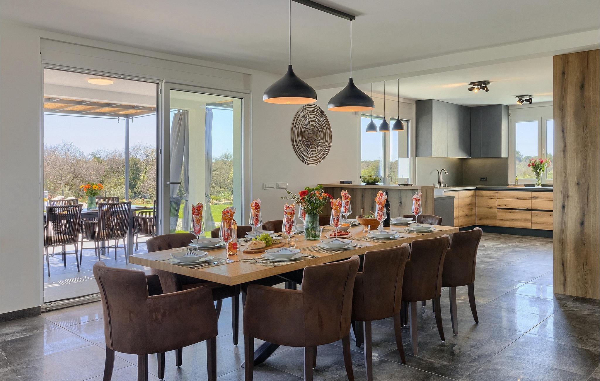 Gå ind i husets indre fra terrassen, som vil forbløffe dig! Det smagfuldt indrettede interiør er moderne og elegant, men der er samtidig sørget for at bevare et stykke tradition. Interessante detaljer og materialer minder om traditionel istrisk konstruktion.