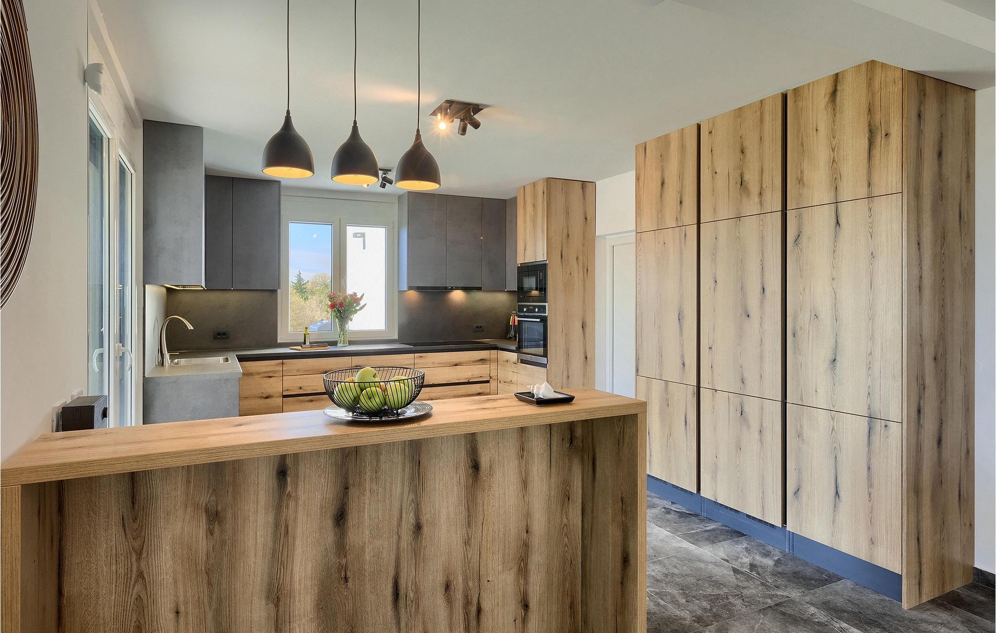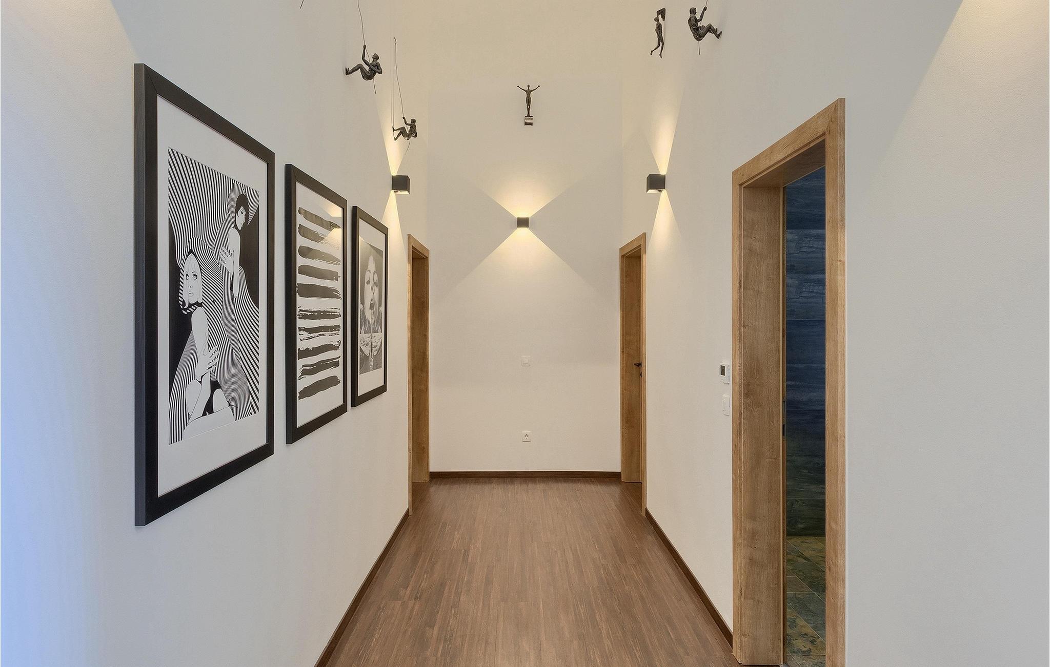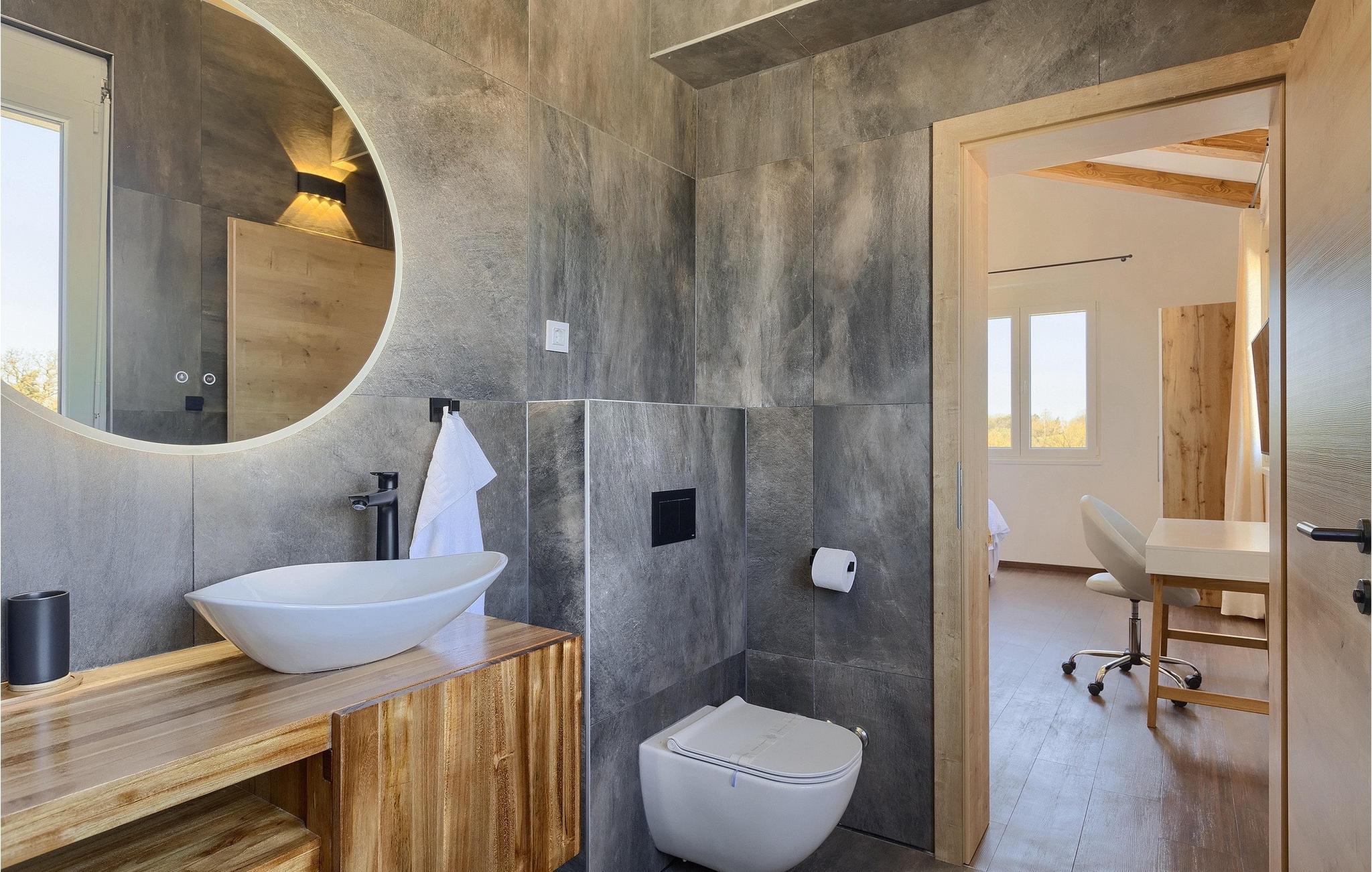 Gå ind i husets indre fra terrassen, som vil forbløffe dig! Det smagfuldt indrettede interiør er moderne og elegant, men der er samtidig sørget for at bevare et stykke tradition. Interessante detaljer og materialer minder om traditionel istrisk konstruktion.