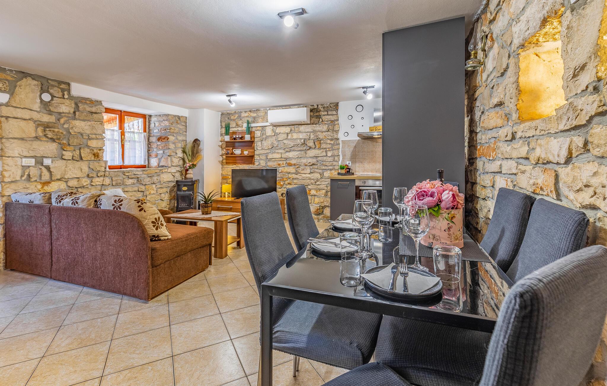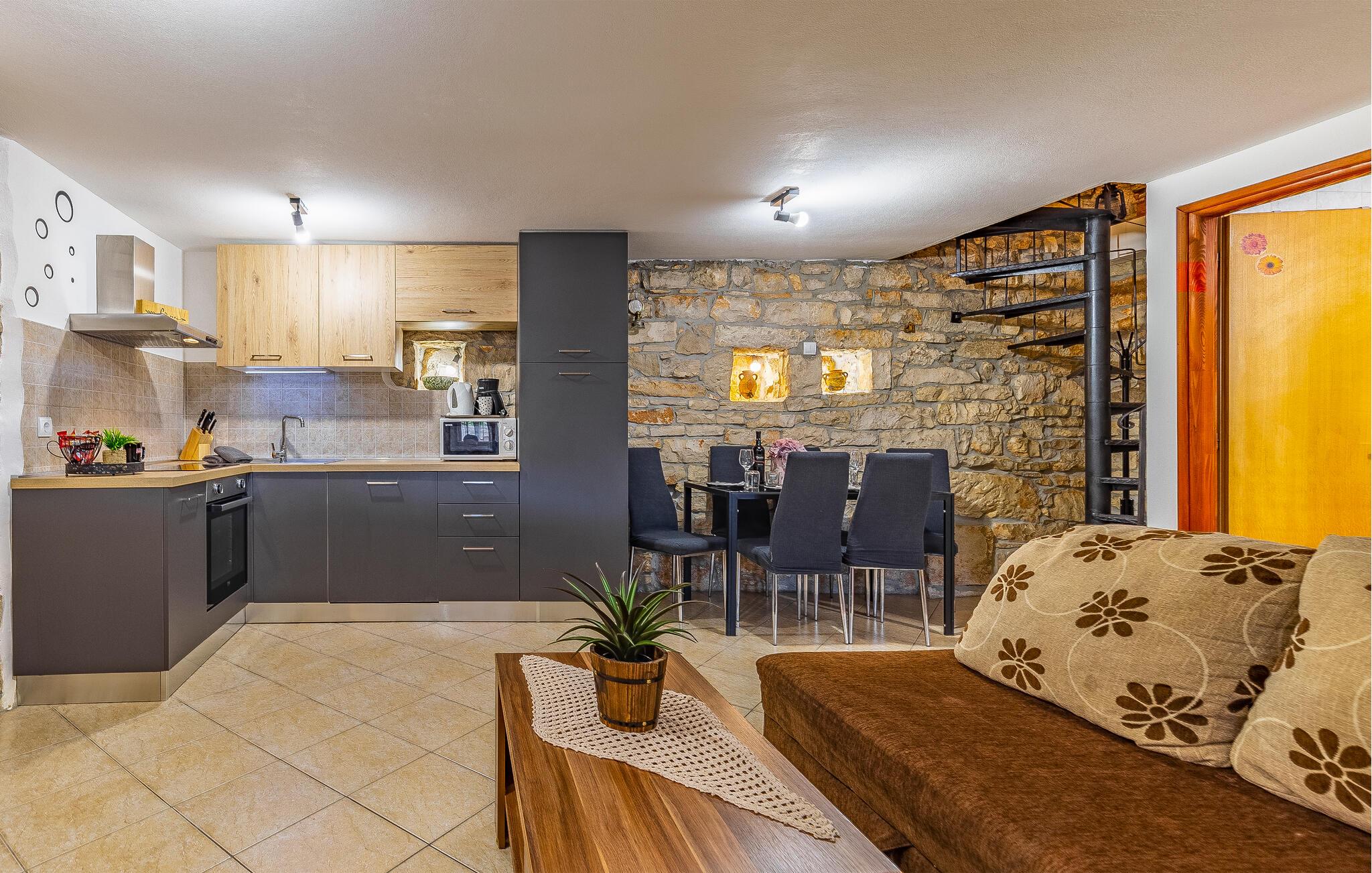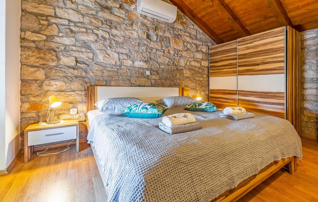 Dette dobbelthus i isstrisk stil ligger i Peruški. Ferieboligen blev møbleret med stor opmærksomhed på detaljer og strækker sig over to etager, som er forbundet med en vindeltrappe. Opholdsstuen med køkken og badeværelse ligger i stueetagen, mens der er to soveværelser på øverste etage. Der er også en lille indhegnet gårdsplads med en overdækket terrasse til din rådighed, hvor du helt sikkert vil slappe af, mens de små leger ubekymret. Om aftenen kan du forkæle dine kære med mange lækre specialiteter fra grillen.