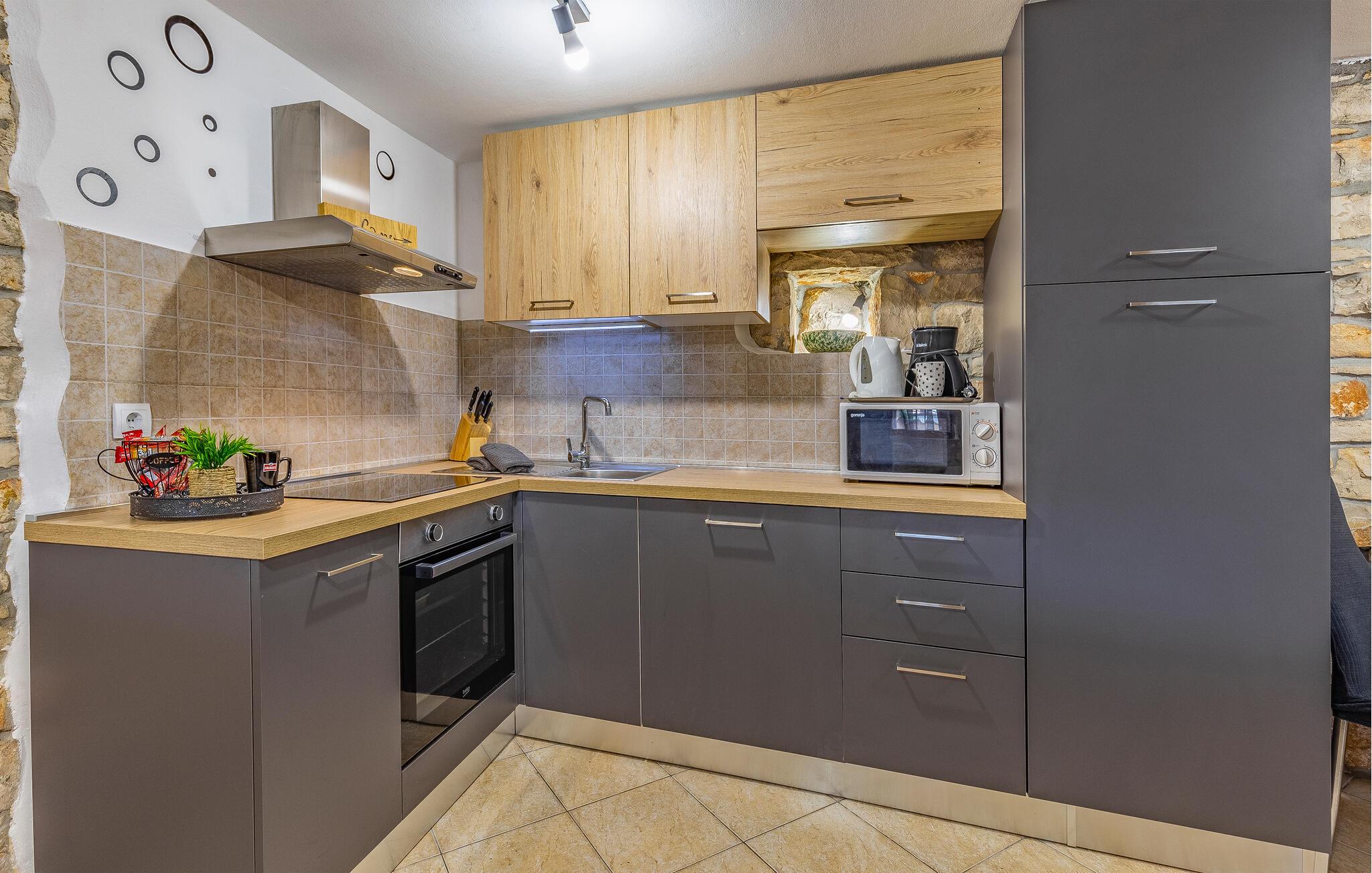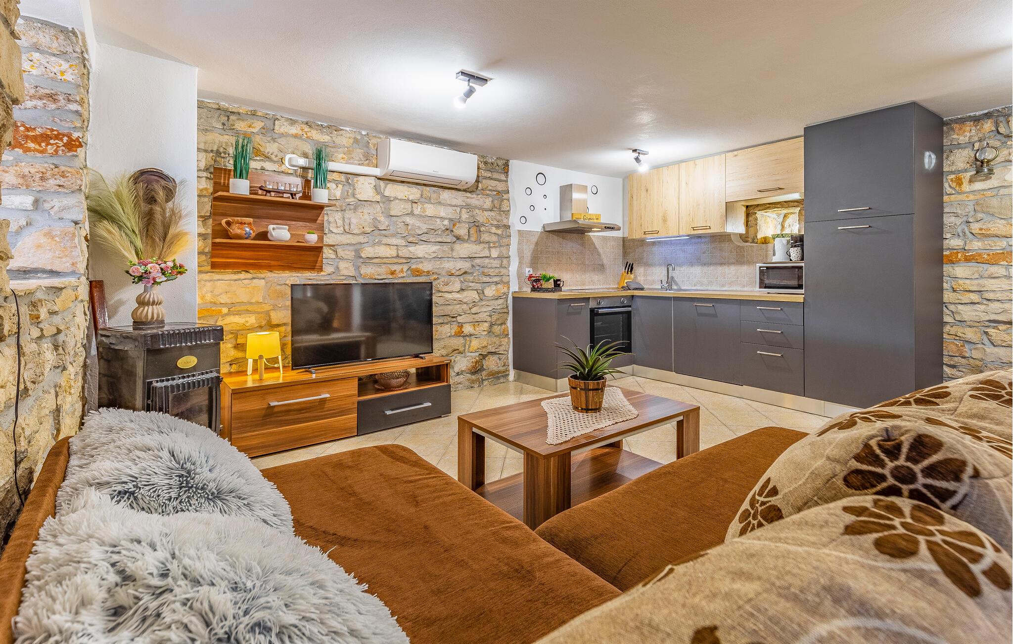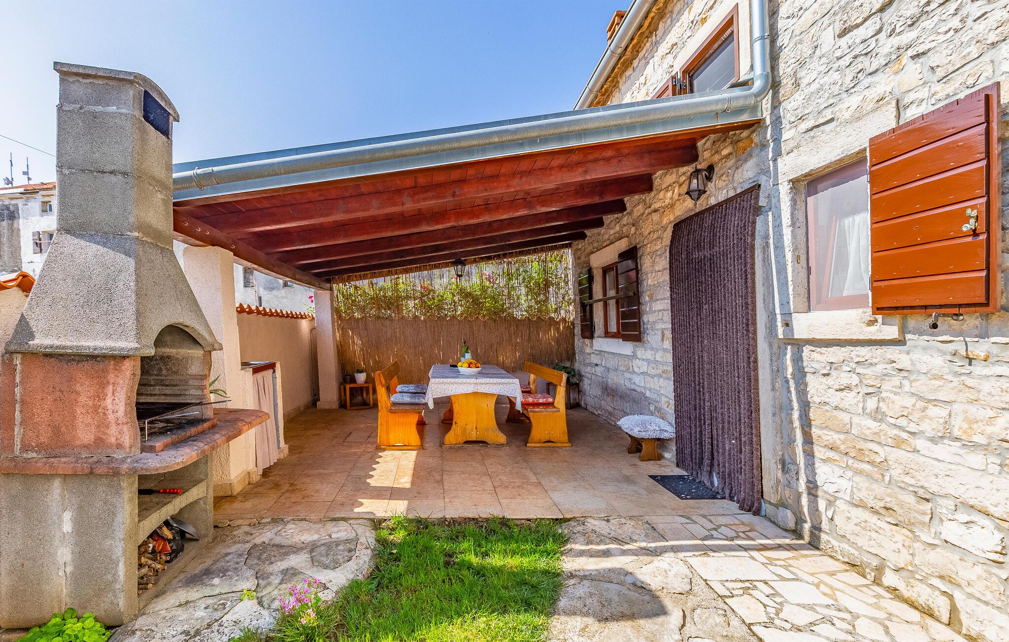 Dette dobbelthus i isstrisk stil ligger i Peruški. Ferieboligen blev møbleret med stor opmærksomhed på detaljer og strækker sig over to etager, som er forbundet med en vindeltrappe. Opholdsstuen med køkken og badeværelse ligger i stueetagen, mens der er to soveværelser på øverste etage. Der er også en lille indhegnet gårdsplads med en overdækket terrasse til din rådighed, hvor du helt sikkert vil slappe af, mens de små leger ubekymret. Om aftenen kan du forkæle dine kære med mange lækre specialiteter fra grillen.