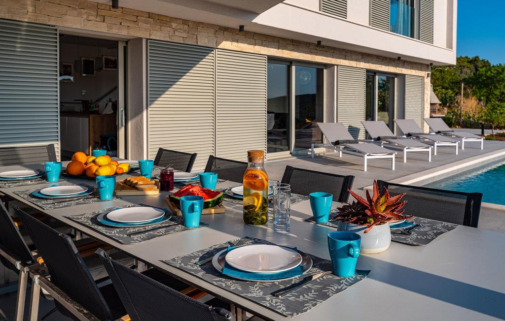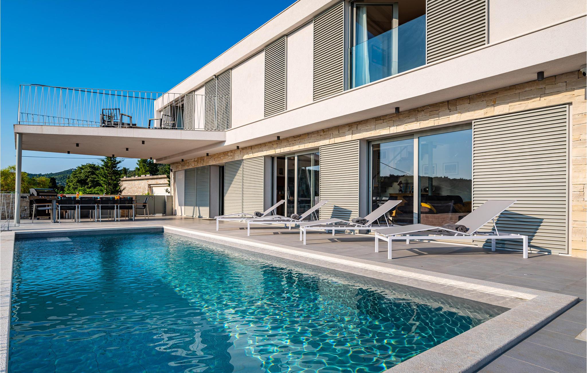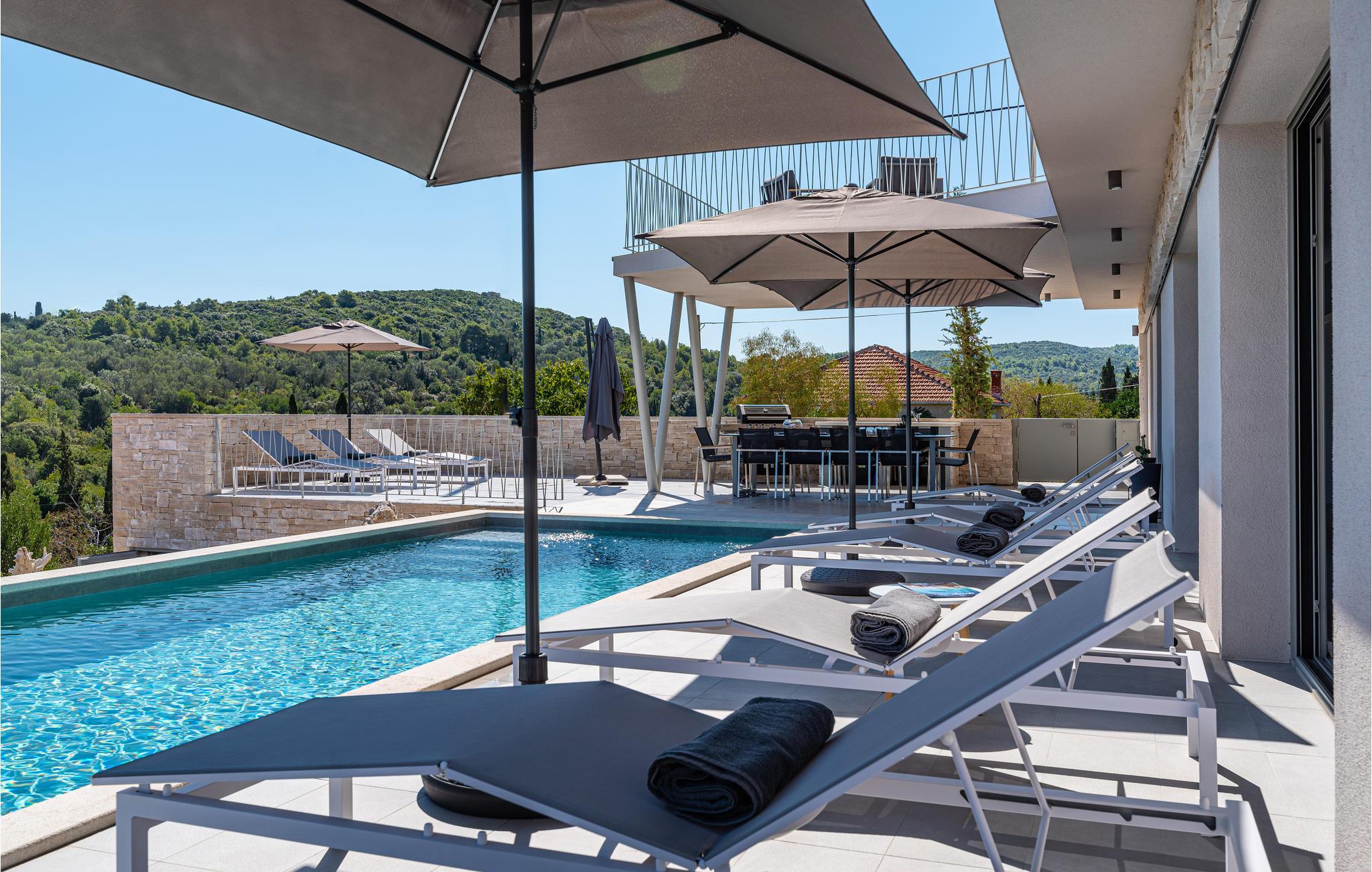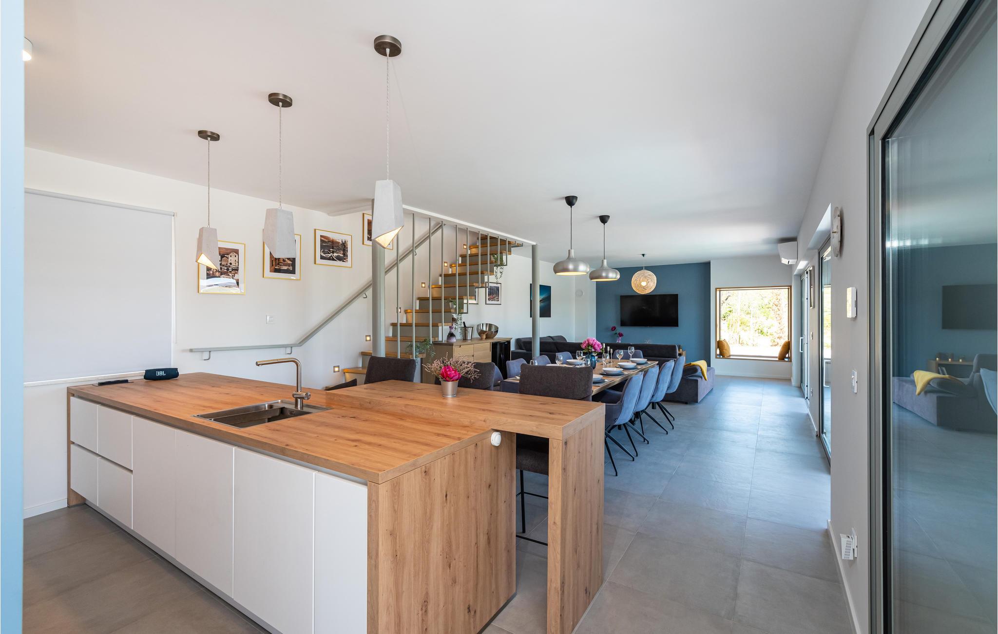 Denne ekstraordinære villa med moderne arkitektur lægger op til en uforglemmelig ferie. Den åbne planløsning i stueetagen kombinerer køkkenet, spisestuen og stuen for at skabe en luftig ramme, der fører direkte ud til solterrassen med pool. Hver etage har sin egen terrasse, hvor I kan nyde de rolige omgivelser. Poolen lover en forfriskning på varme dage, mens børnene leger i haven. Om aftenen kan I tilberede grillede specialiteter udendørs og afslutte dagen med at slappe af.