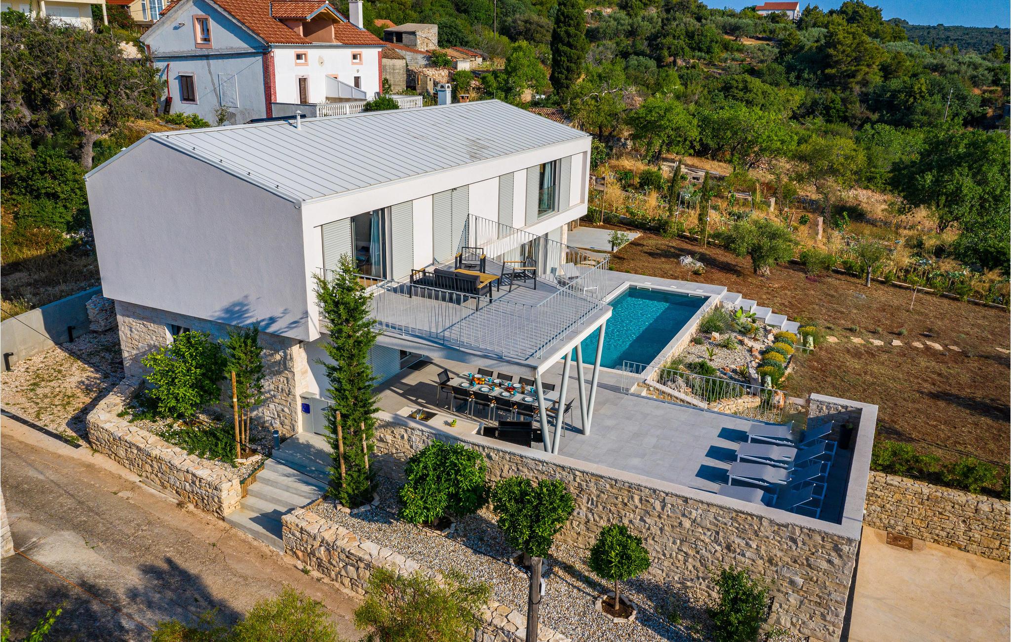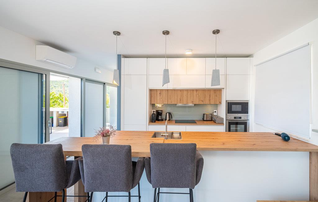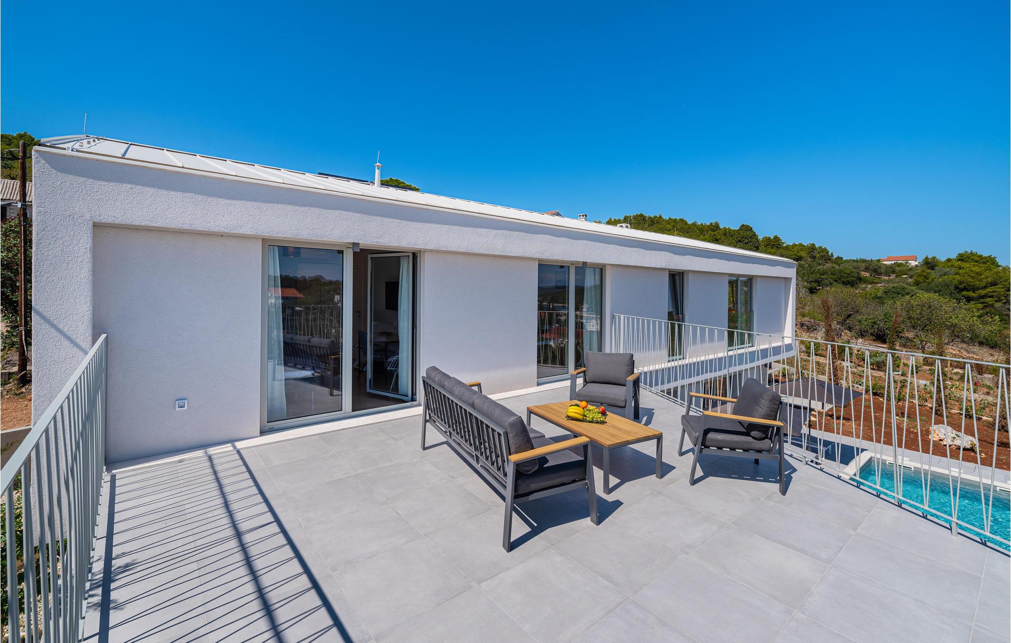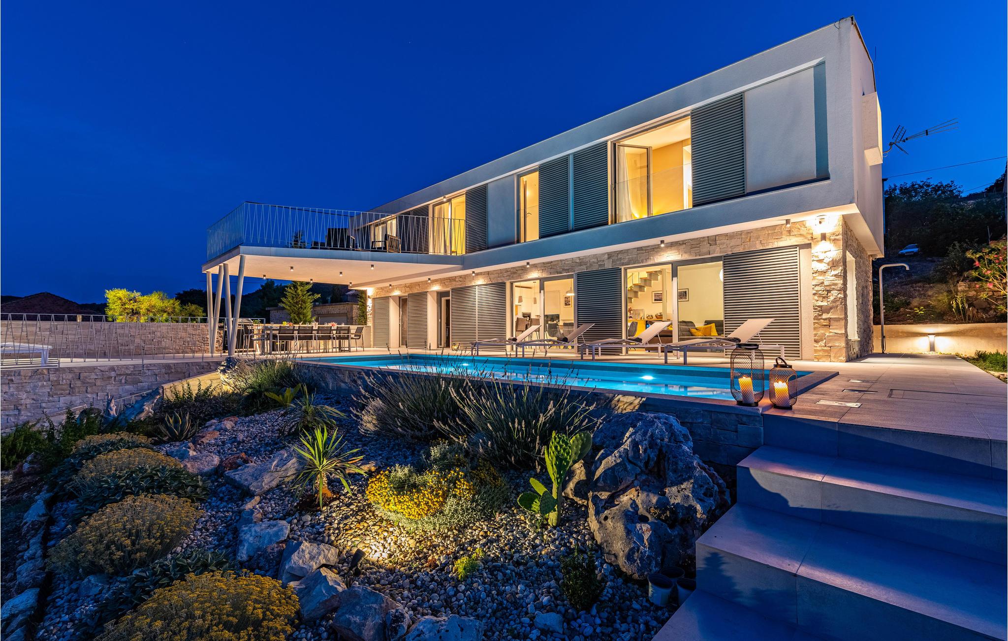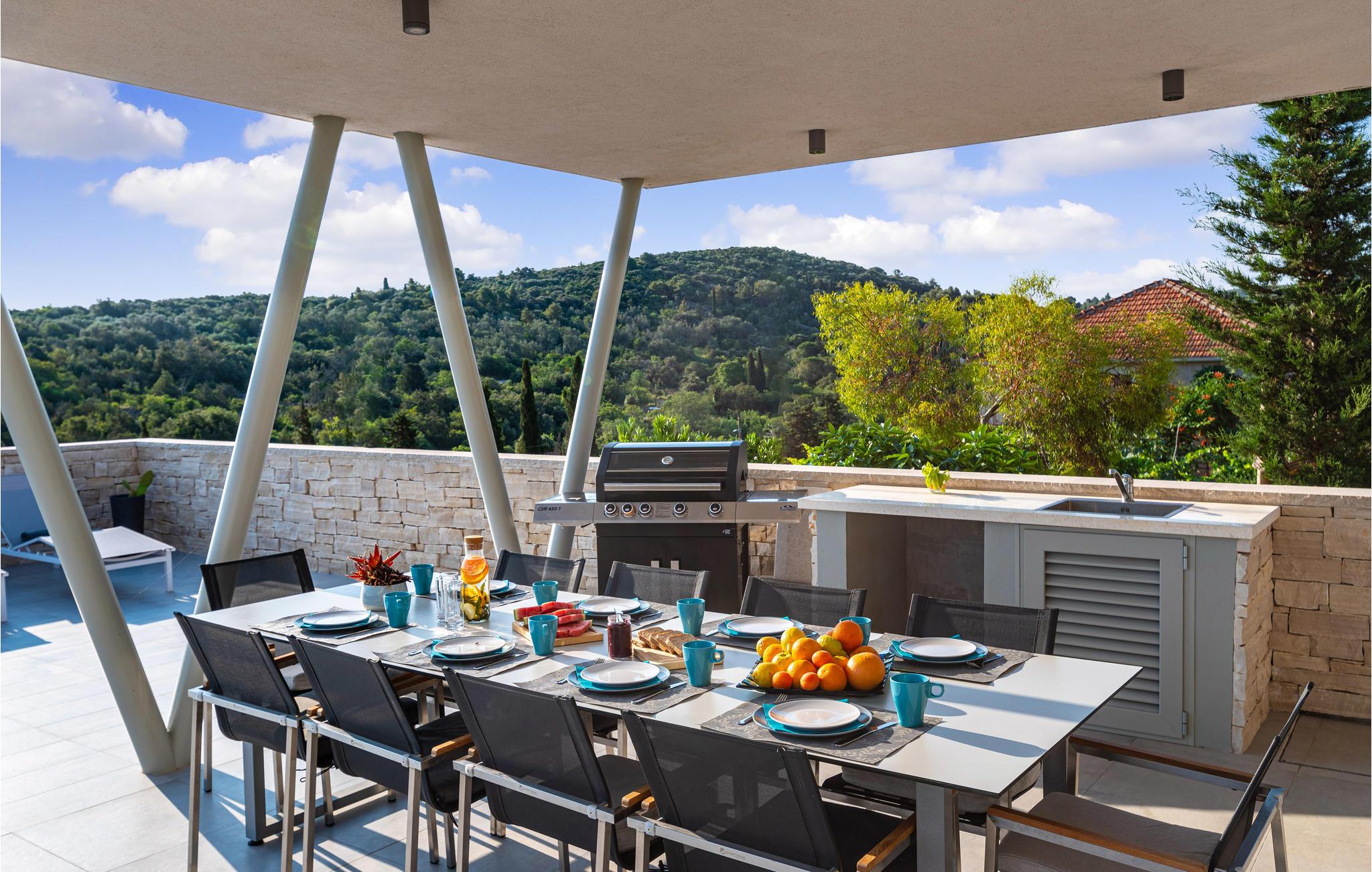 Denne ekstraordinære villa med moderne arkitektur lægger op til en uforglemmelig ferie. Den åbne planløsning i stueetagen kombinerer køkkenet, spisestuen og stuen for at skabe en luftig ramme, der fører direkte ud til solterrassen med pool. Hver etage har sin egen terrasse, hvor I kan nyde de rolige omgivelser. Poolen lover en forfriskning på varme dage, mens børnene leger i haven. Om aftenen kan I tilberede grillede specialiteter udendørs og afslutte dagen med at slappe af.
