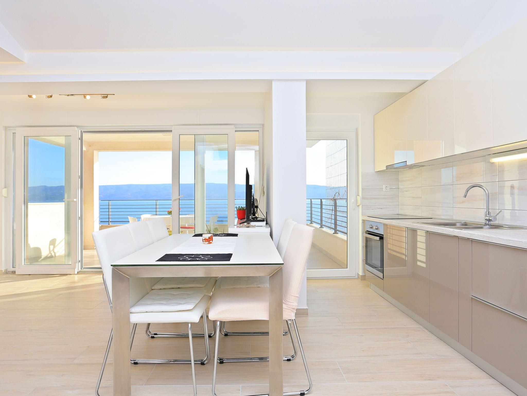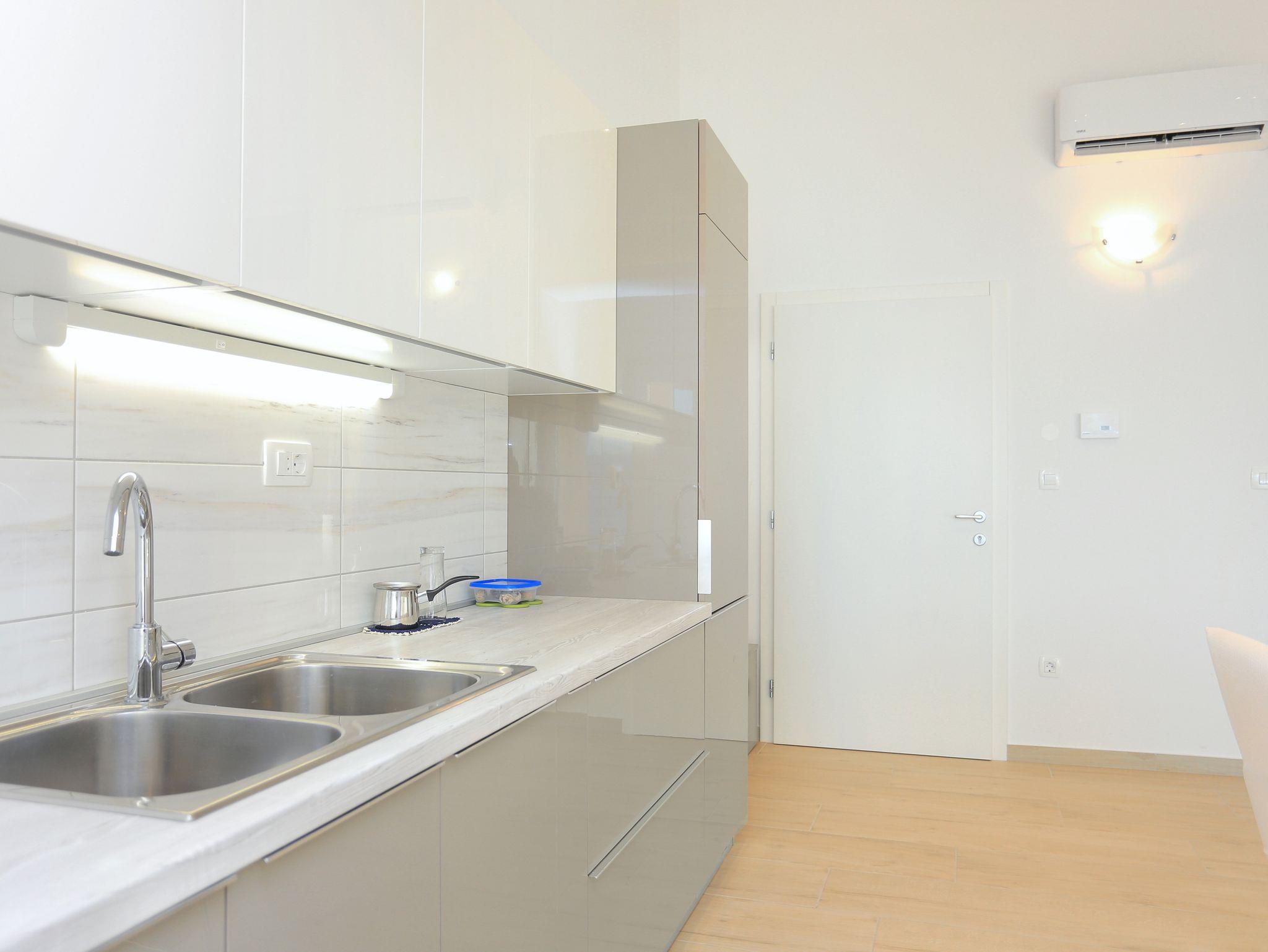 Ferienwohnung bietet Platz für 4 Gäste. Die Betten sind in Schlafzimmern, die es 1 gibt, und in Wohnzimmer, innerhalb einer Gesamtfläche von 47m2, angeordnet. Die Gäste haben eine eigene Terrasse zur Verfügung, auf der sie in warmen Sommernächten genießen können. Das Apartment bietet Meerblick. Es ist erlaubt, Speisen auf dem Gemeinschafts-Grill vorzubereiten. IM PREIS INBEGRIFFEN: Kurtaxe, Endreinigung, Parkplatz, Internet. VERBINDLICHE ZUSÄTZLICHE KOSTEN: Aufzahlung für Kurzaufenthalte (prozentualer Zuschlag pro Nächtigungsanzahl: 30% - 1, 20% - 2, 10% - 3). UNVERBINDLICHE ZUSÄTZLICHE KOSTEN: Klimatisierung (0,80 € pro Stunde), Wäschewaschen (5,00 € Waschen). Die Verfügbarkeit zusätzlicher Dienstleistungen in Ihrem reservierten Termin und die Preise derselben (falls nicht aufgeführt) müssen im Voraus überprüft werden. Zusätzliche Dienstleistungen die in der Zahlungsaufforderung nicht aufgeführt sind werden direkt beim Vermieter bezahlt, angenommen der Gast nutzt auch diese.