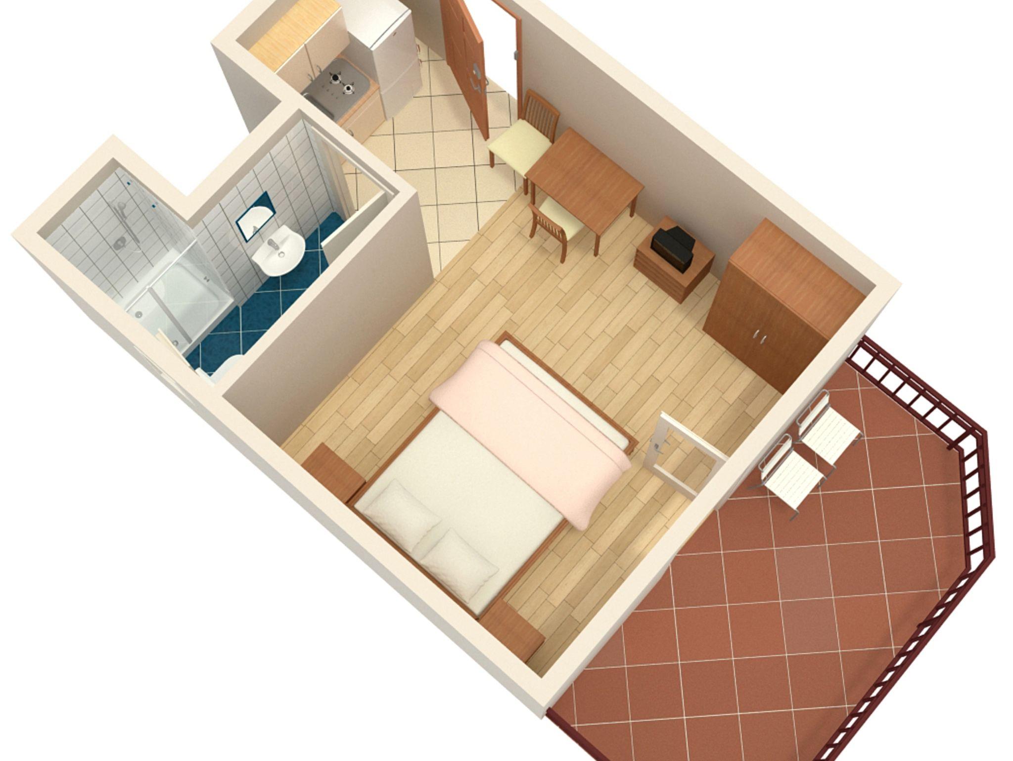 Studio bietet Platz für 2 Gäste. Die Betten sind in Schlafzimmern, die es 1 gibt, innerhalb einer Gesamtfläche von 20m2, angeordnet. Die Gäste haben eine eigene Terrasse zur Verfügung, auf der sie in warmen Sommernächten genießen können. Es ist erlaubt, Speisen auf dem Gemeinschafts-Grill vorzubereiten. IM PREIS INBEGRIFFEN: Kurtaxe, Endreinigung, Klimatisierung, Parkplatz, Internet. VERBINDLICHE ZUSÄTZLICHE KOSTEN: Aufzahlung für Kurzaufenthalte (prozentualer Zuschlag pro Nächtigungsanzahl: 30% - 1, 20% - 2, 10% - 3). Die Verfügbarkeit zusätzlicher Dienstleistungen in Ihrem reservierten Termin und die Preise derselben (falls nicht aufgeführt) müssen im Voraus überprüft werden. Zusätzliche Dienstleistungen die in der Zahlungsaufforderung nicht aufgeführt sind werden direkt beim Vermieter bezahlt, angenommen der Gast nutzt auch diese.