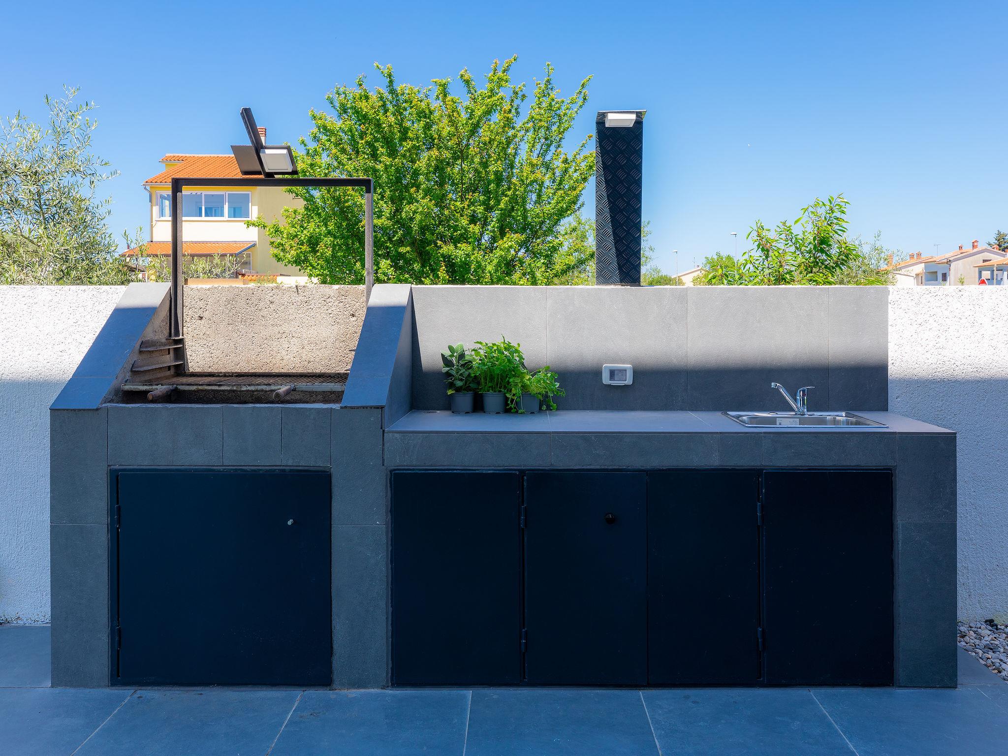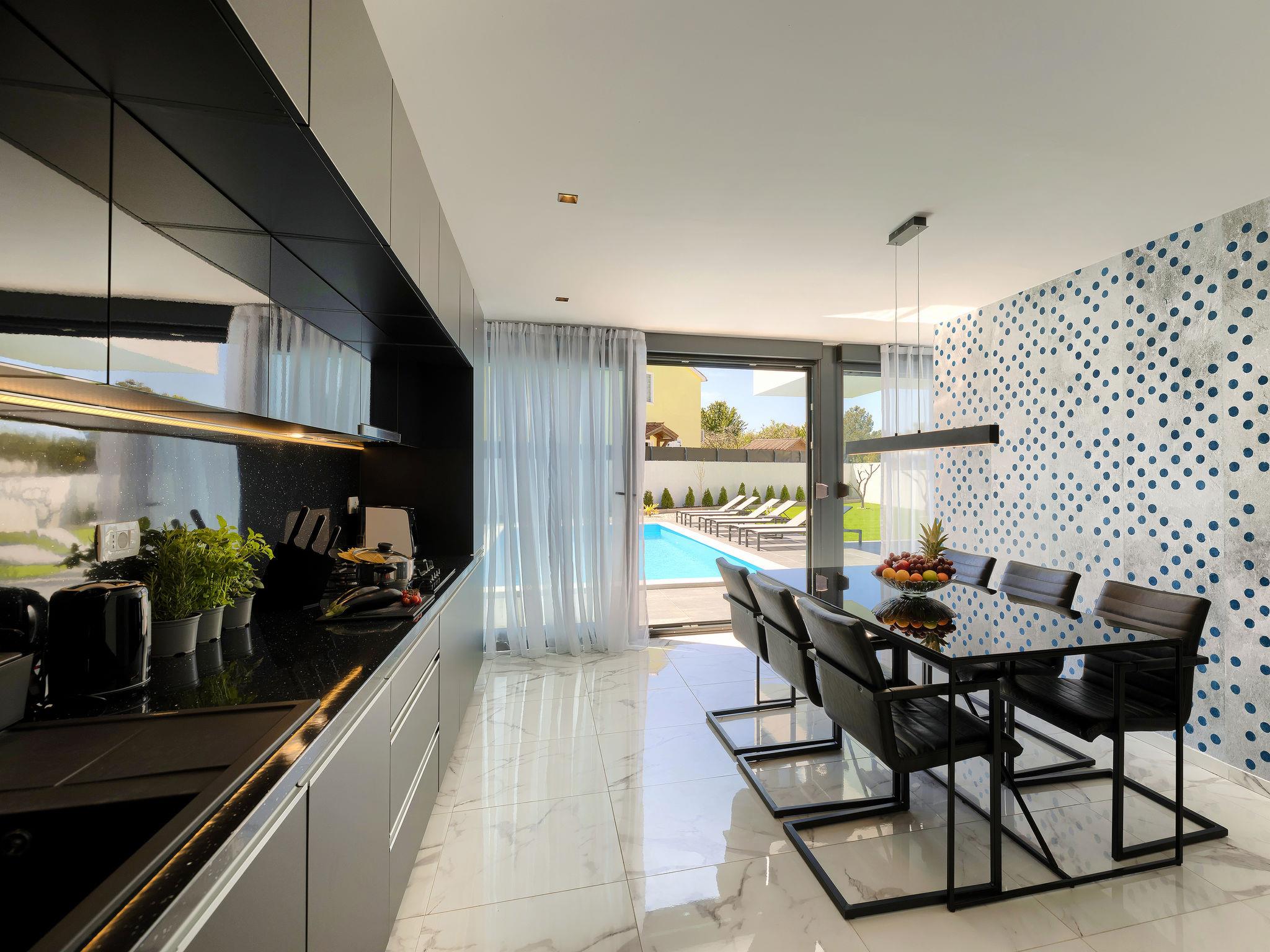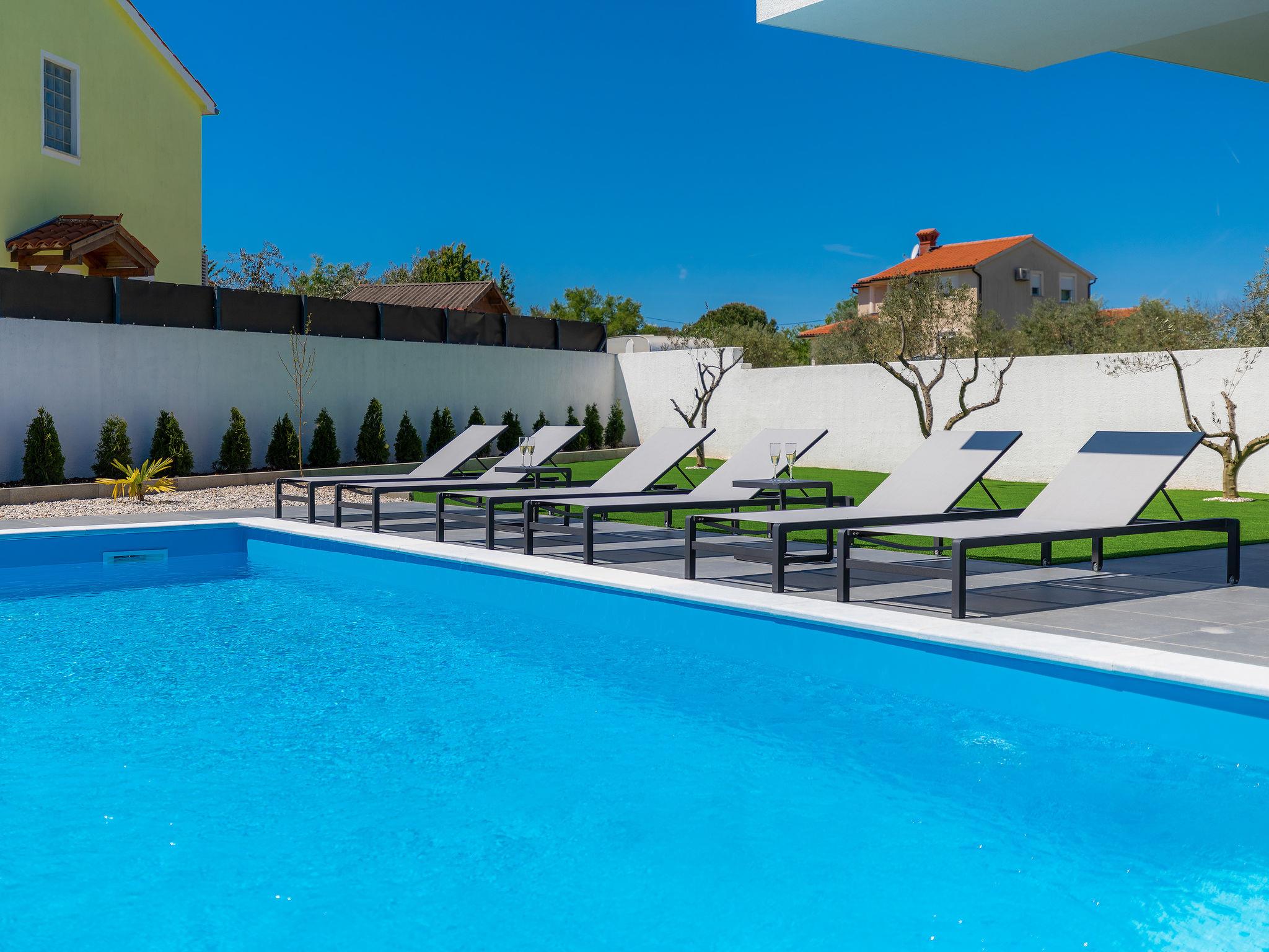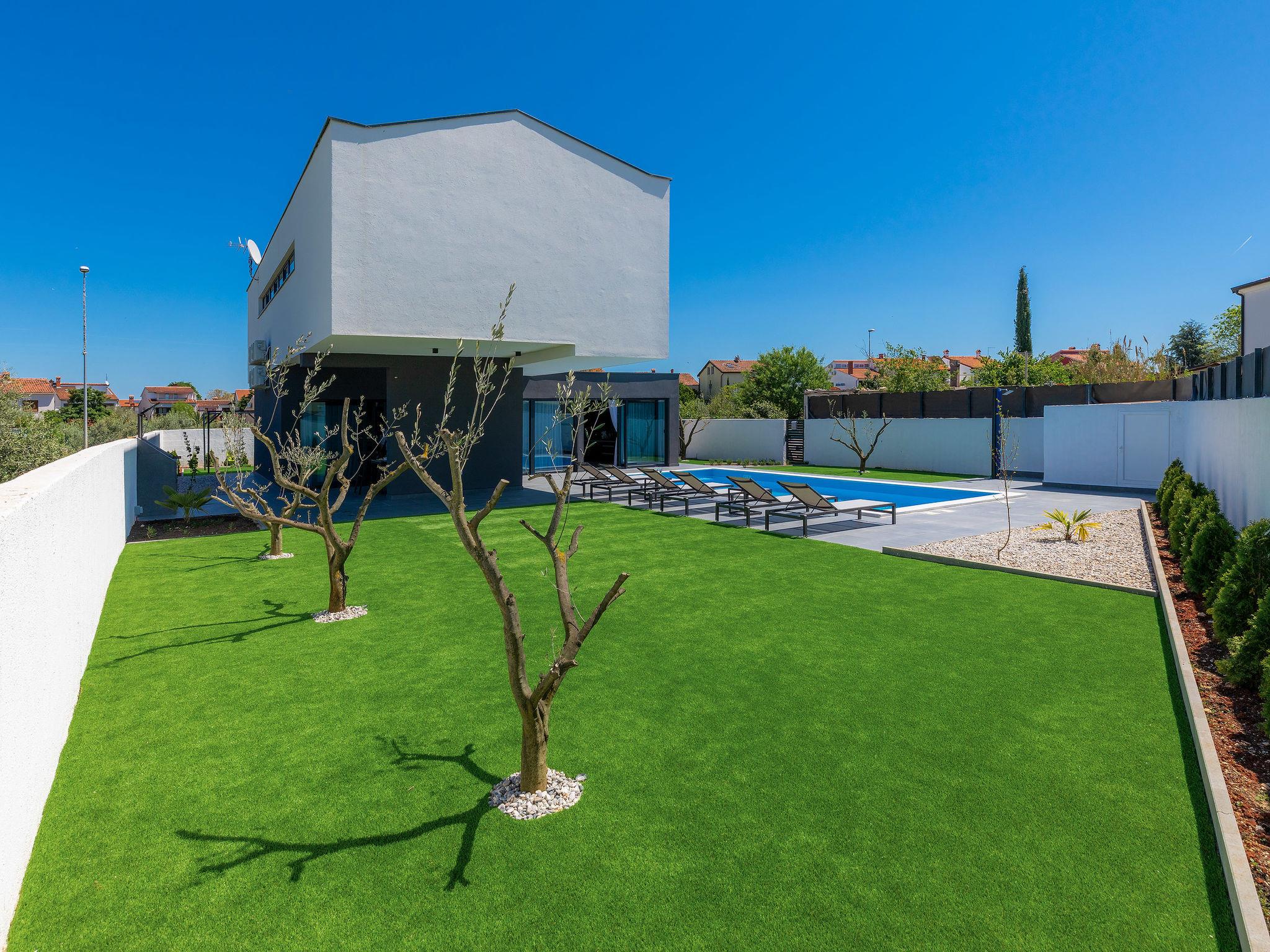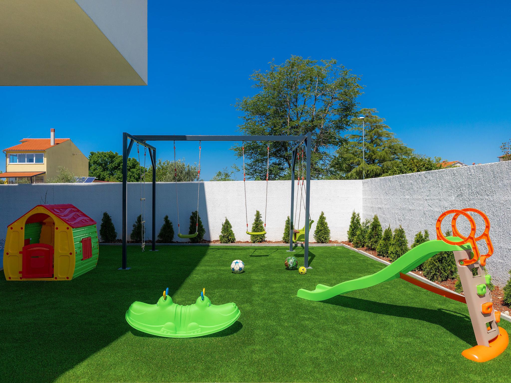Modern villa "Dots n' Stripes", 2 storeys. In the district of Valbandon 2 km from the centre of Fažana, 5 km from the centre of Pula, in a sunny position, 500 m from the sea, 500 m from the beach. Private: property 620 m2 (fenced), garden with lawn and wildlife garden, swimming pool angular (9 x 4 m, depth 140 cm, seasonal availability: 01.Mar. - 01.Nov.) with internal staircase. Outdoor shower, terrace (40 m2), garden furniture, barbecue, children's playground (slide, swing). In the house: internet access, washing machine. Parking (for 3 cars) at the house on the premises. Shop 250 m, supermarket 1.5 km, restaurant 200 m, bus stop 73 m, pebble beach, public bathing area 500 m. Golf course (18 hole) 3 km, tennis 1 km, walking paths from the house 500 m, cycle lane 550 m. Nearby attractions: NP Brijuni 3 km, Amphitheater 5 km. Groups of teenagers on request only. Please note: airfield 15 km from the property.