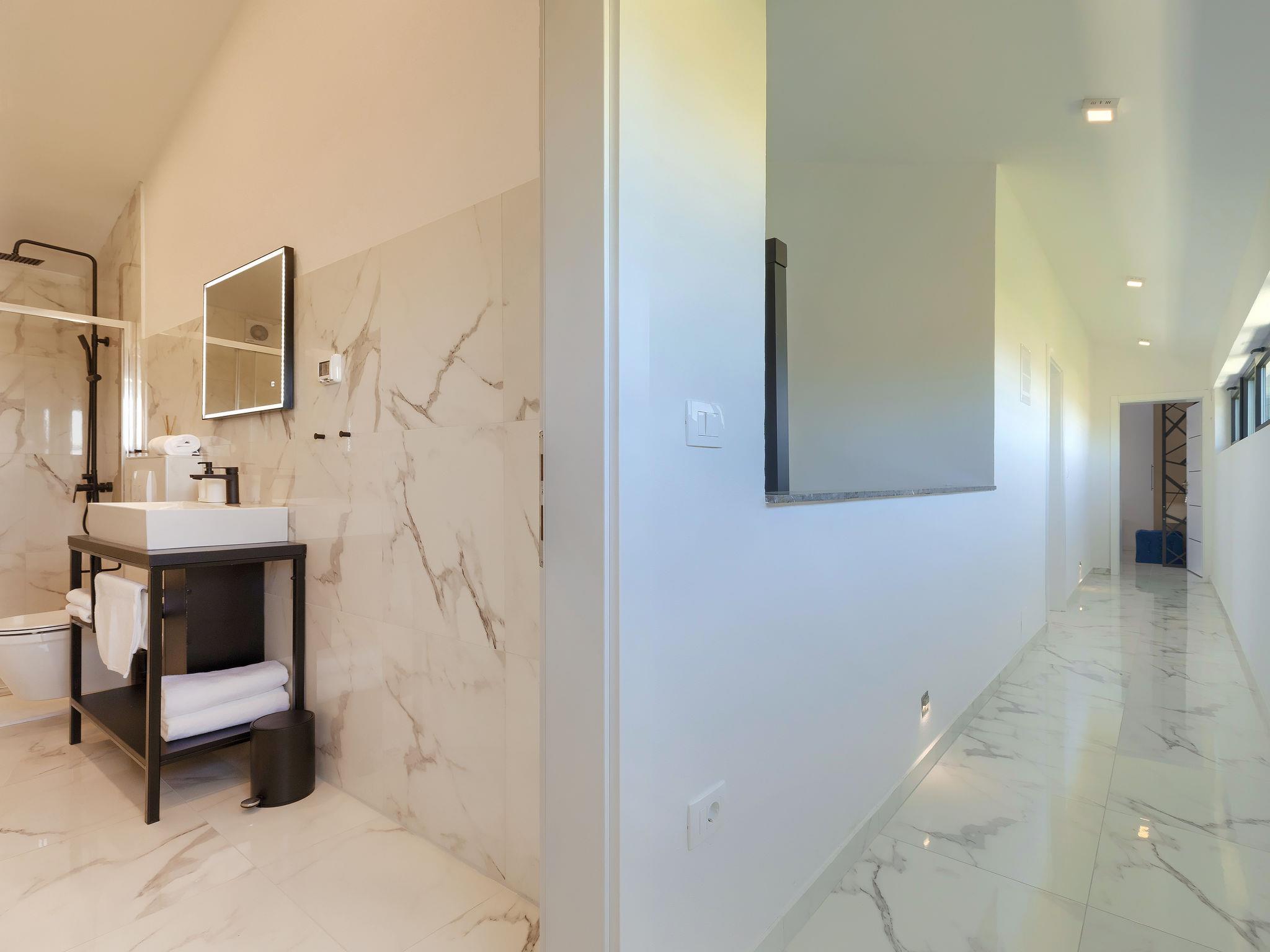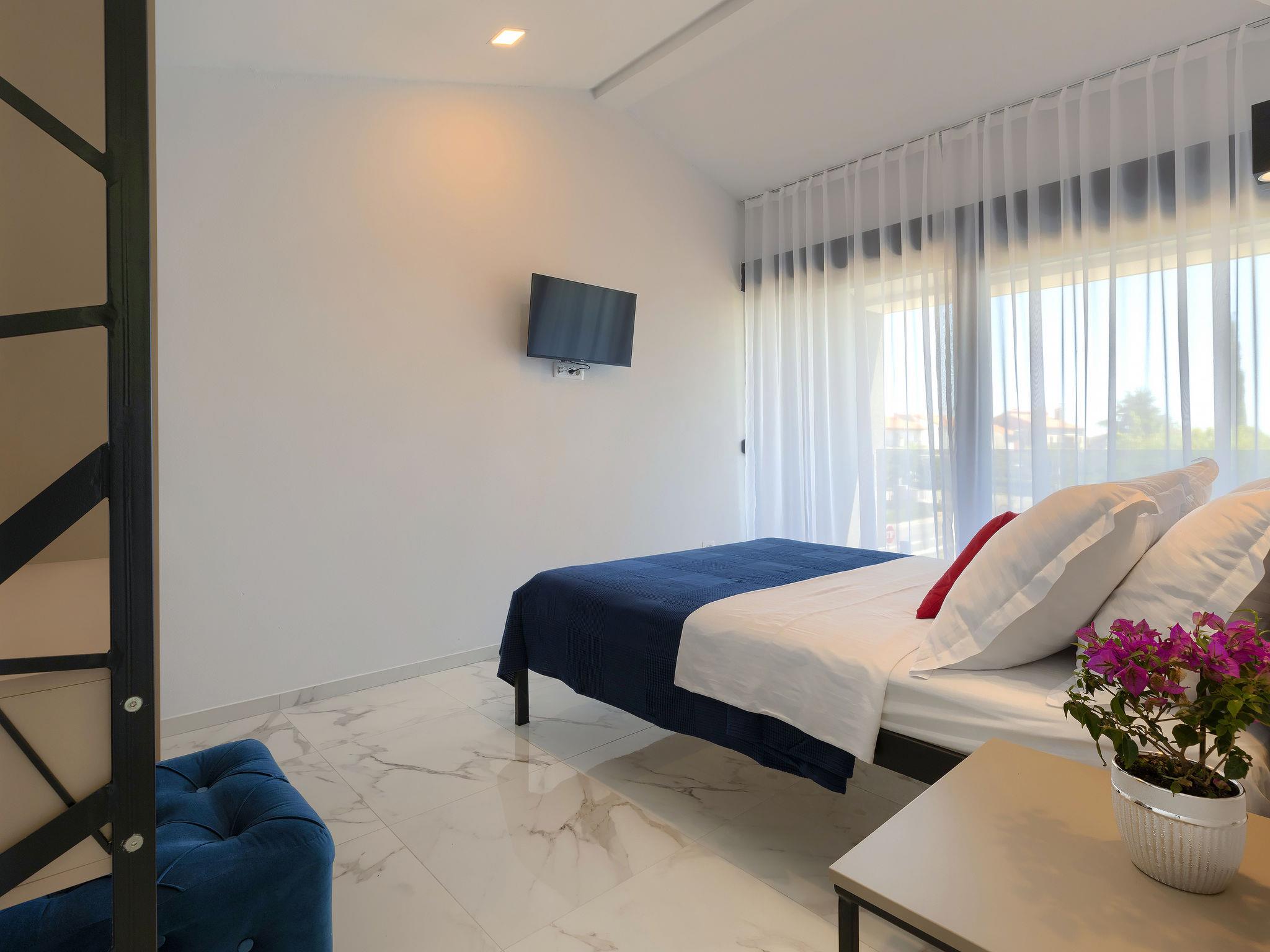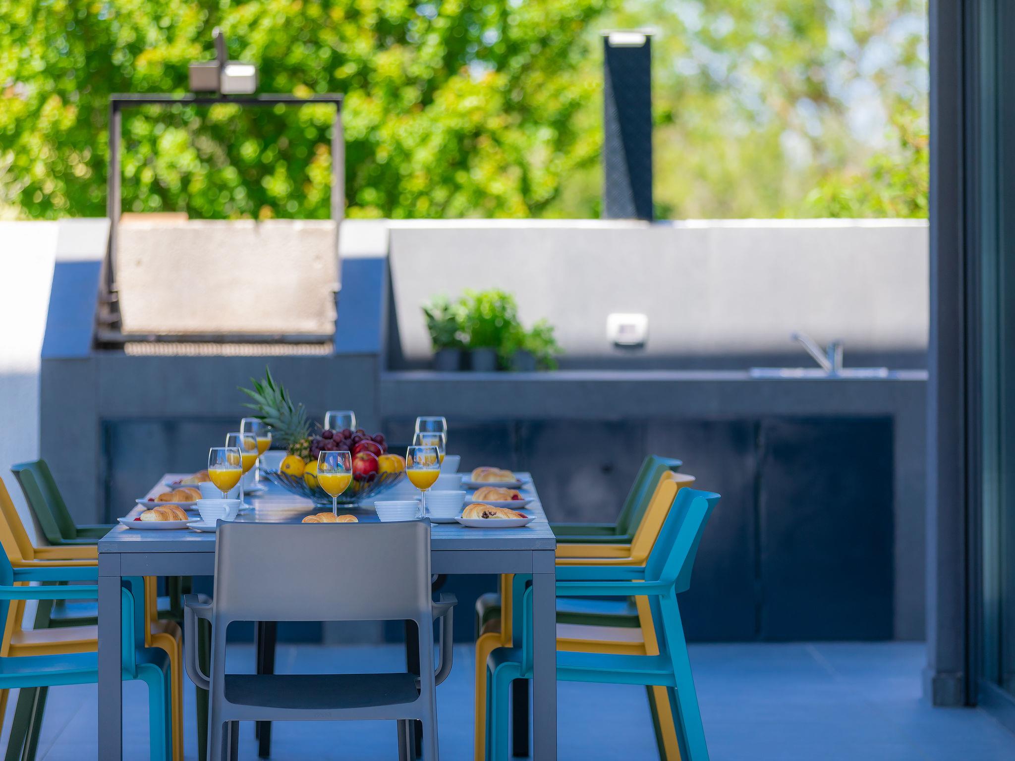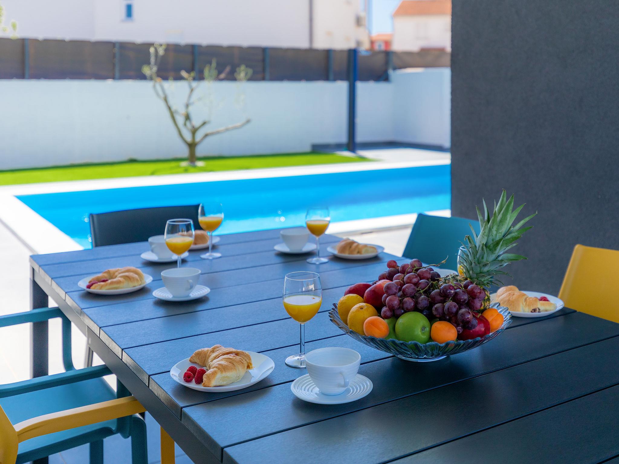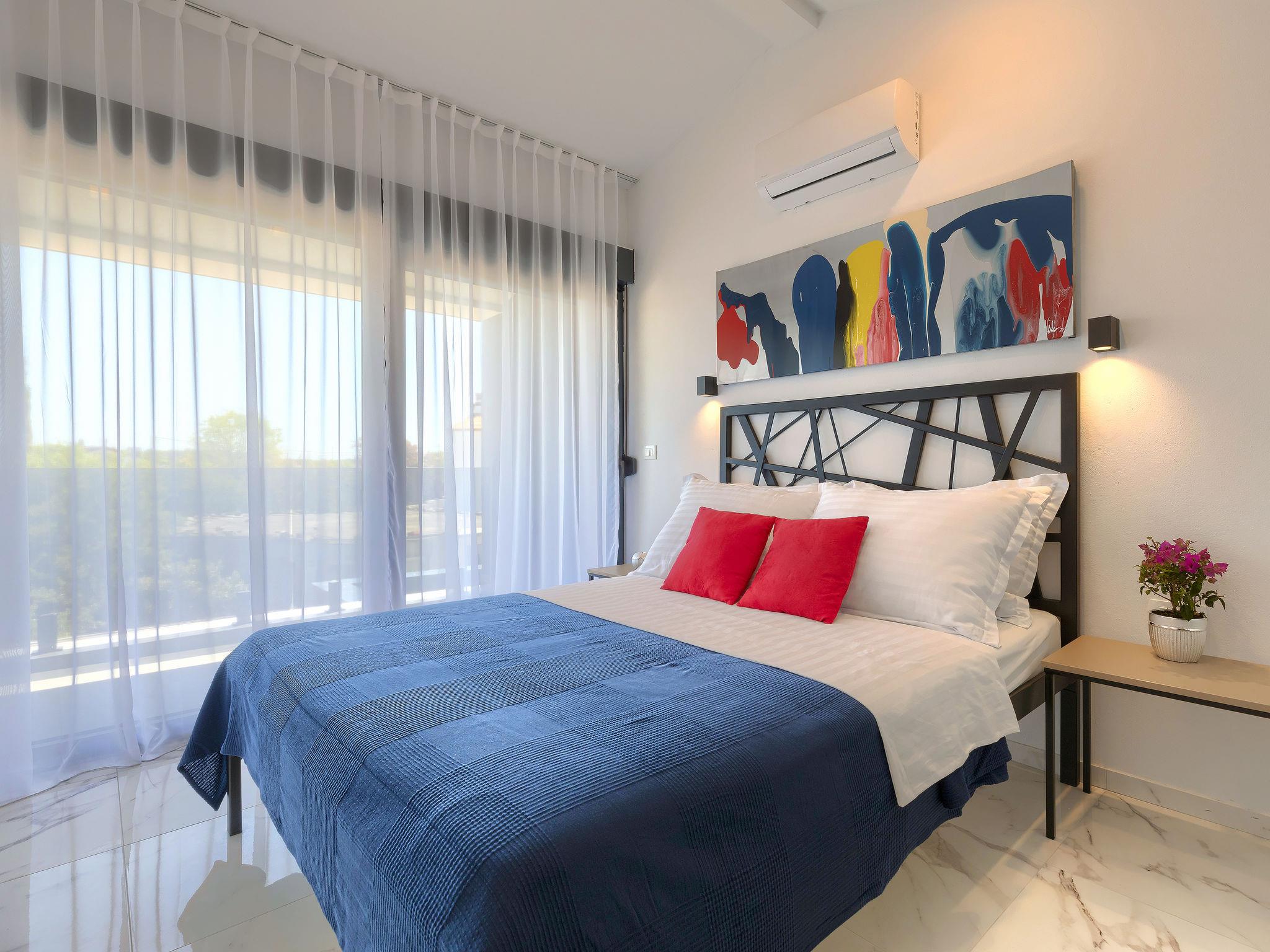 Modern villa "Dots n' Stripes", 2 storeys. In the district of Valbandon 2 km from the centre of Fažana, 5 km from the centre of Pula, in a sunny position, 500 m from the sea, 500 m from the beach. Private: property 620 m2 (fenced), garden with lawn and wildlife garden, swimming pool angular (9 x 4 m, depth 140 cm, seasonal availability: 01.Mar. - 01.Nov.) with internal staircase. Outdoor shower, terrace (40 m2), garden furniture, barbecue, children's playground (slide, swing). In the house: internet access, washing machine. Parking (for 3 cars) at the house on the premises. Shop 250 m, supermarket 1.5 km, restaurant 200 m, bus stop 73 m, pebble beach, public bathing area 500 m. Golf course (18 hole) 3 km, tennis 1 km, walking paths from the house 500 m, cycle lane 550 m. Nearby attractions: NP Brijuni 3 km, Amphitheater 5 km. Groups of teenagers on request only. Please note: airfield 15 km from the property.