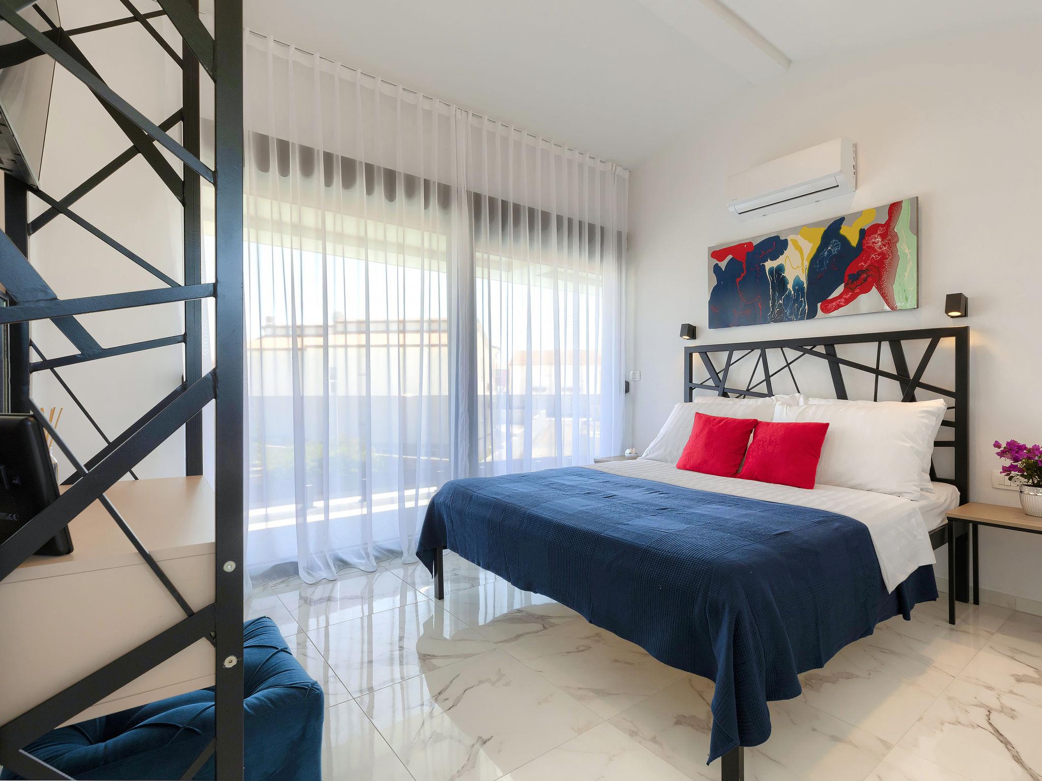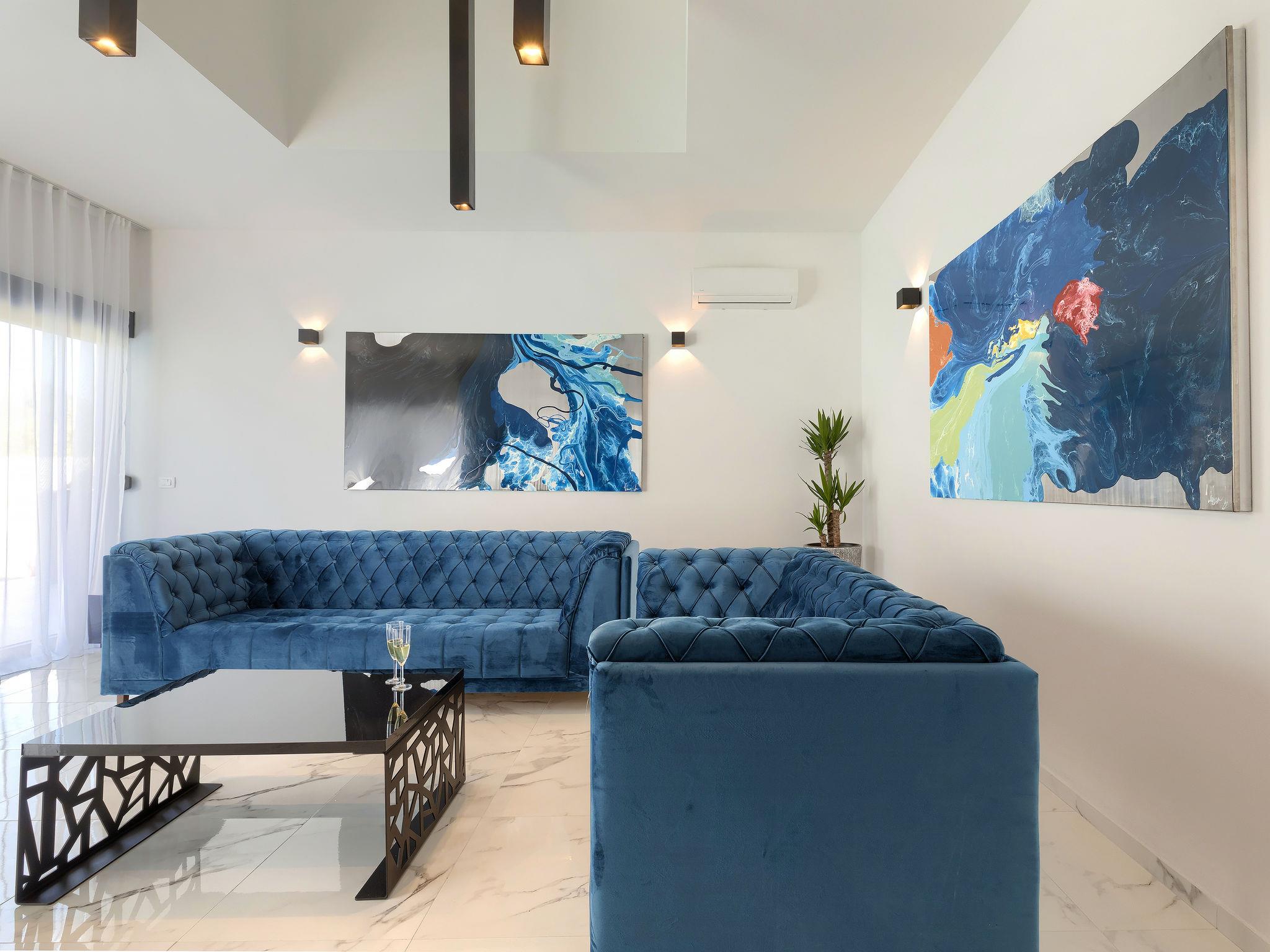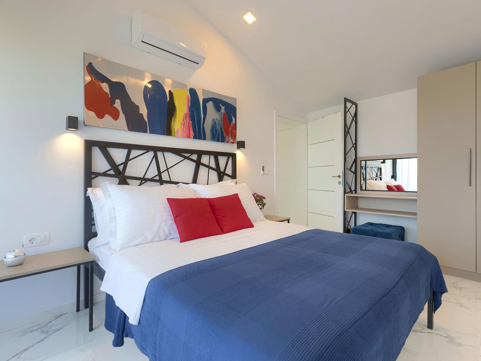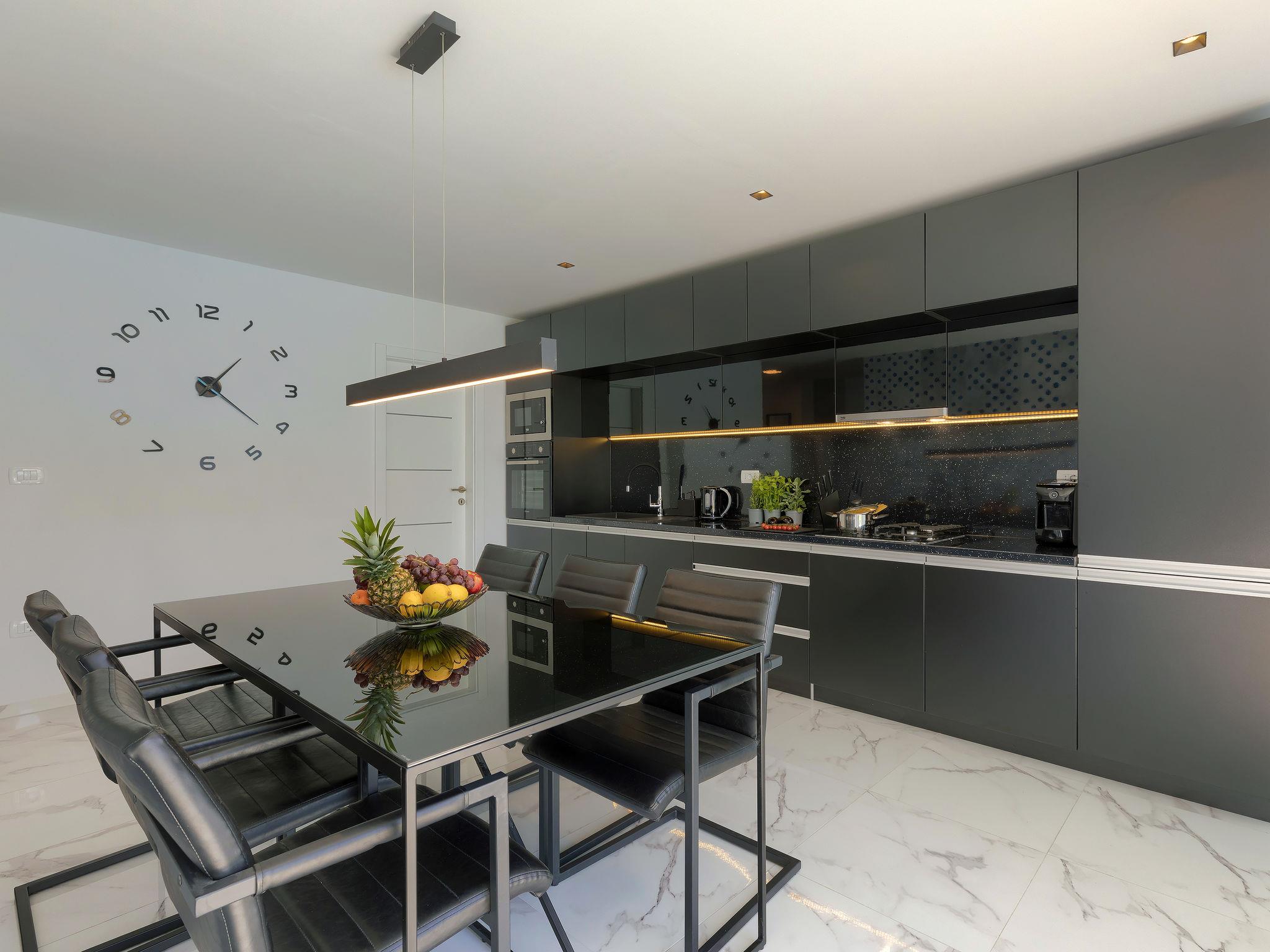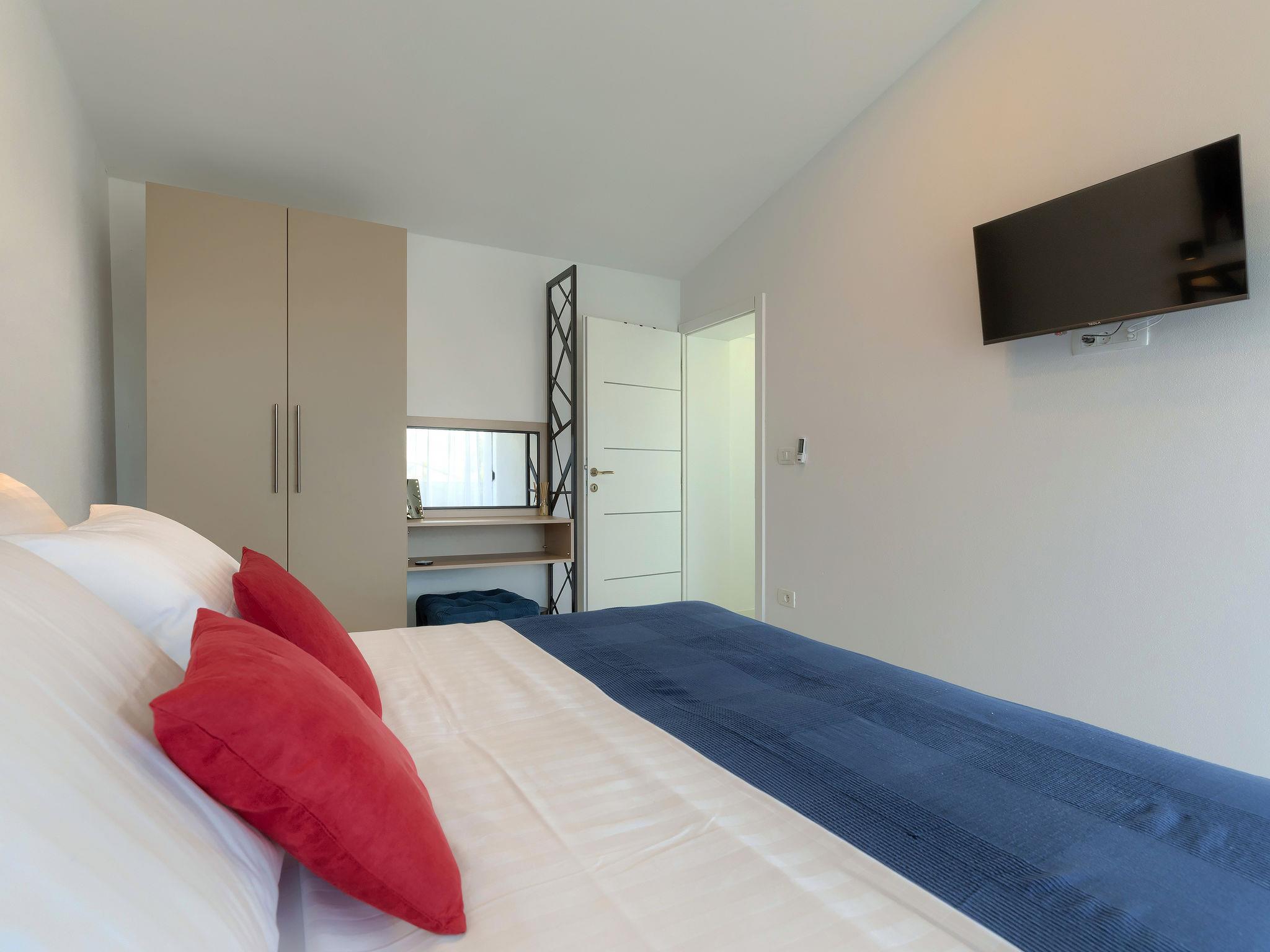 Modern villa "Dots n' Stripes", 2 storeys. In the district of Valbandon 2 km from the centre of Fažana, 5 km from the centre of Pula, in a sunny position, 500 m from the sea, 500 m from the beach. Private: property 620 m2 (fenced), garden with lawn and wildlife garden, swimming pool angular (9 x 4 m, depth 140 cm, seasonal availability: 01.Mar. - 01.Nov.) with internal staircase. Outdoor shower, terrace (40 m2), garden furniture, barbecue, children's playground (slide, swing). In the house: internet access, washing machine. Parking (for 3 cars) at the house on the premises. Shop 250 m, supermarket 1.5 km, restaurant 200 m, bus stop 73 m, pebble beach, public bathing area 500 m. Golf course (18 hole) 3 km, tennis 1 km, walking paths from the house 500 m, cycle lane 550 m. Nearby attractions: NP Brijuni 3 km, Amphitheater 5 km. Groups of teenagers on request only. Please note: airfield 15 km from the property.