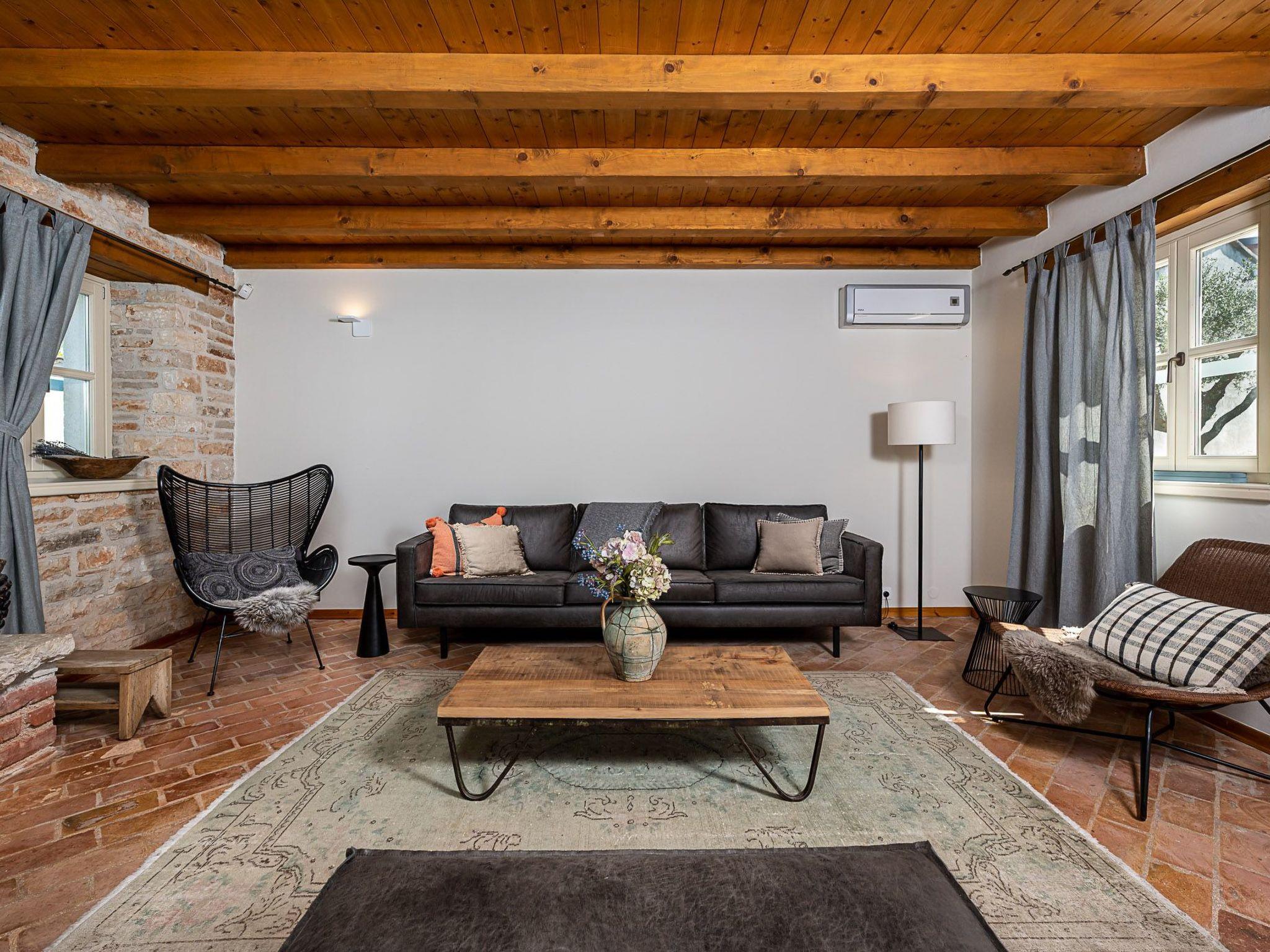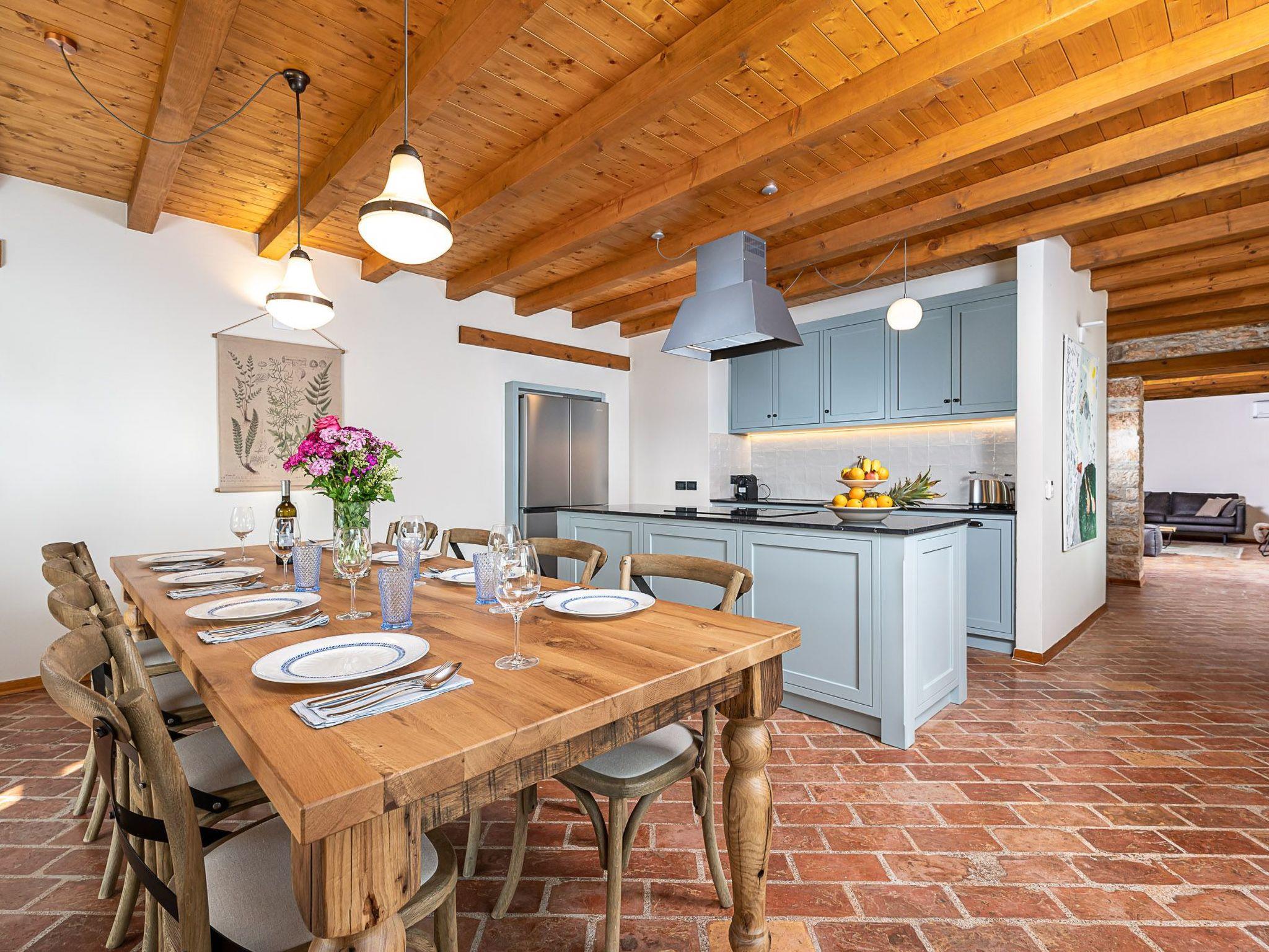 It offers a spacious living-/dining area, open plan kitchen, four bedrooms, four bathrooms, a guest toilet and is equipped to comfortably accommodate eight persons. All rooms have exposed wood beam ceilings creating a rustic country home atmosphere.