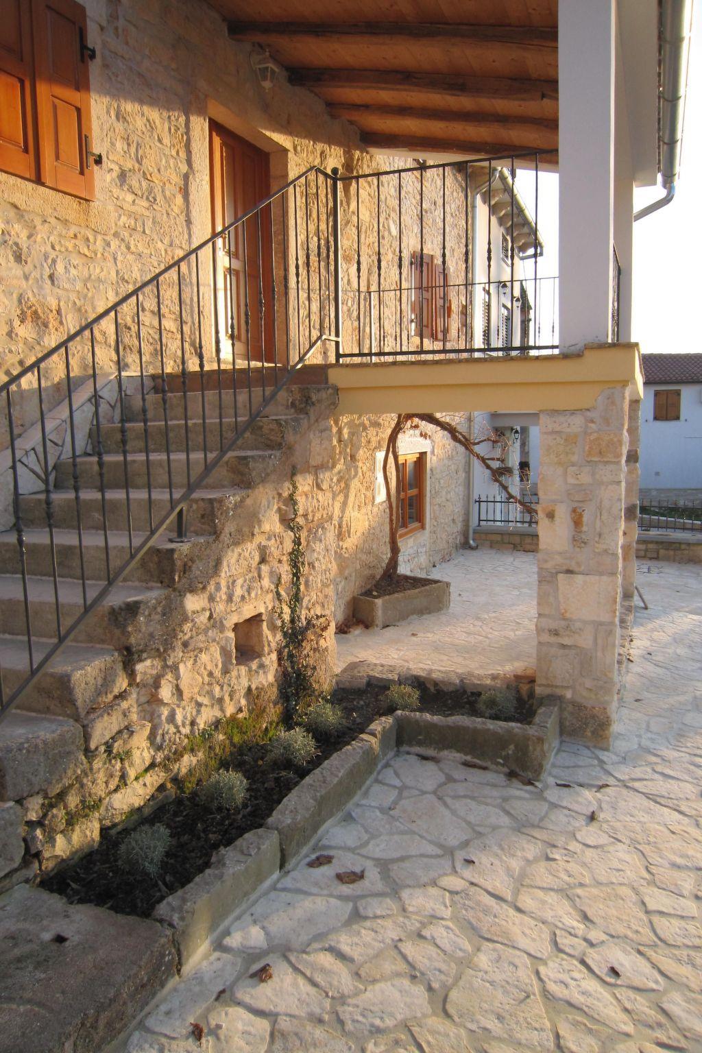 It is nestled in a large garden (2300 square metres) with old trees and has a large swimming pool (12x5 m) with Roman, semi-circular steps and a terrace made of natural stone. The sea and the provincial town of Porec can be reached in fifteen kilometres. The rarely large garden around the two houses looks like a lush green oasis from another world. A huge 400-year-old ladonia grows proudly out of the ground in the middle of the greenery and provides both houses with the shade they need during the shimmering midday heat of summer. Under the imposing tree is a rustic natural stone table for romantic Mediterranean meals and other shared moments in the garden. The pool water is ecologically up-to-date and enriched with a light sea salt sole. Underwater lighting ensures romantic evenings in the pool. At this holiday resort, you can really recharge your batteries and leave the rest of the world and its challenges behind you. Outside there is garden furniture, sun loungers, three parasols by the pool, table tennis, barbecue and parking for four cars (two directly at the house, two at the rear garden entrance).