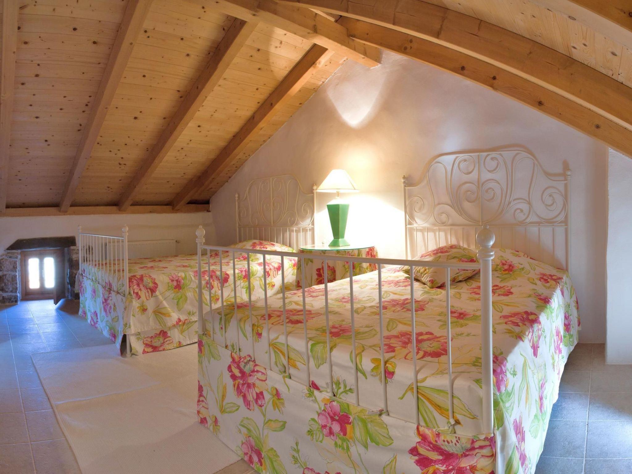 The house consists of thick stone walls (some dating back to Byzantine times), many niches and winding corners. It has two open fireplaces and artistically painted tiles in the bathroom and kitchen. Each bedroom is a different colour. Here you can unwind and really relax - completely off the beaten track. The house can comfortably accommodate eight people. In the main house you will find an elaborately and luxuriously renovated stone house on two floors: There are three double bedrooms, one twin bedroom, three bathrooms (two with separate showers), a well-equipped kitchen (hob, oven, washing machine, dishwasher, fridge/freezer, electric kitchen appliances), kitchen and lounge with open fireplace, TV with satellite connection, DVD player, radio CD player. Both houses have central heating. The bed dimensions are: Pink bedroom, double bed: 180/200cm, yellow bedroom, double bed: 180/200cm, blue bedroom, double bed: 160/200cm, twin bedroom, floral fabric, each bed: 135/200cm. WLAN will also be available from 2015.