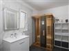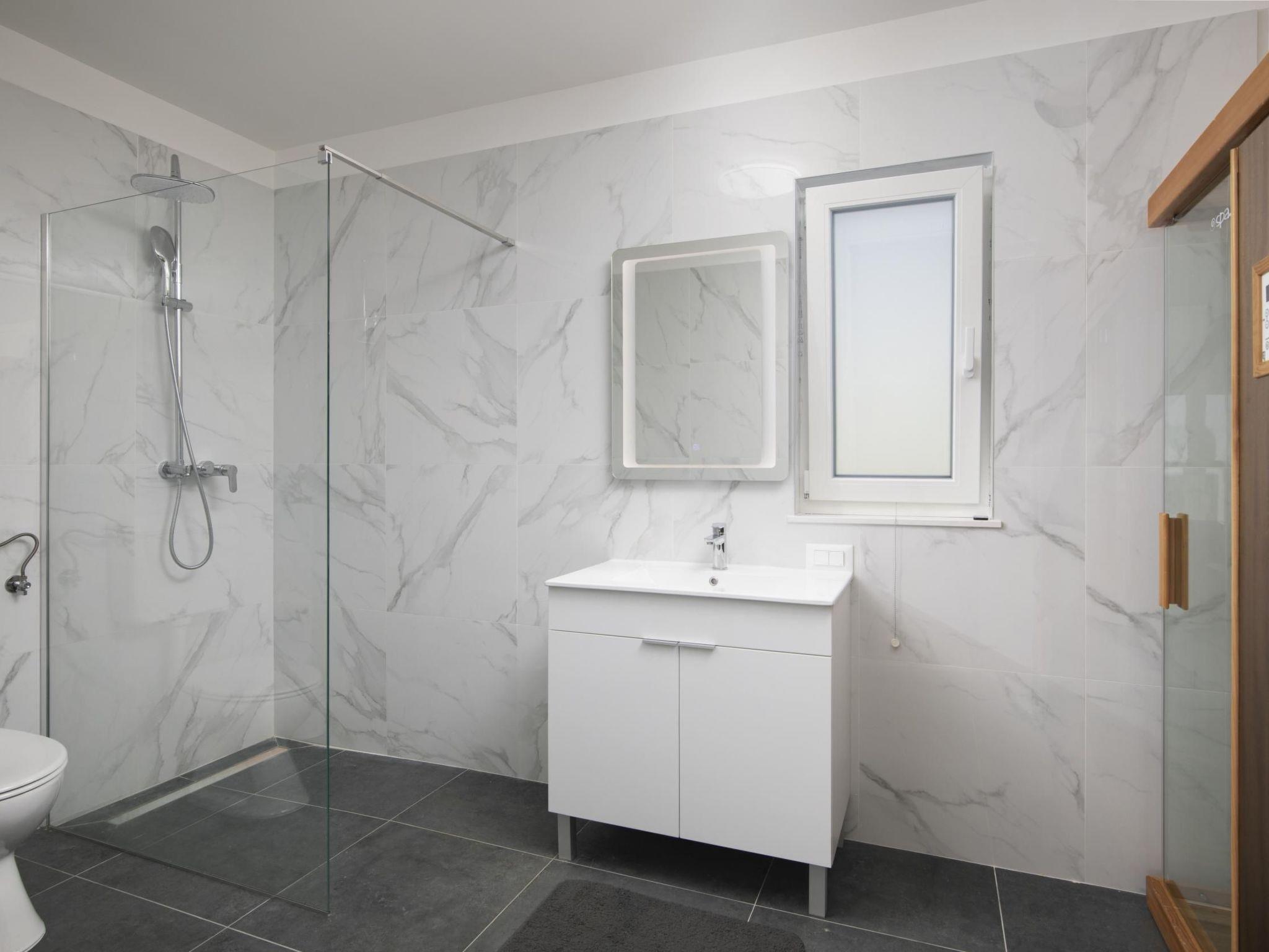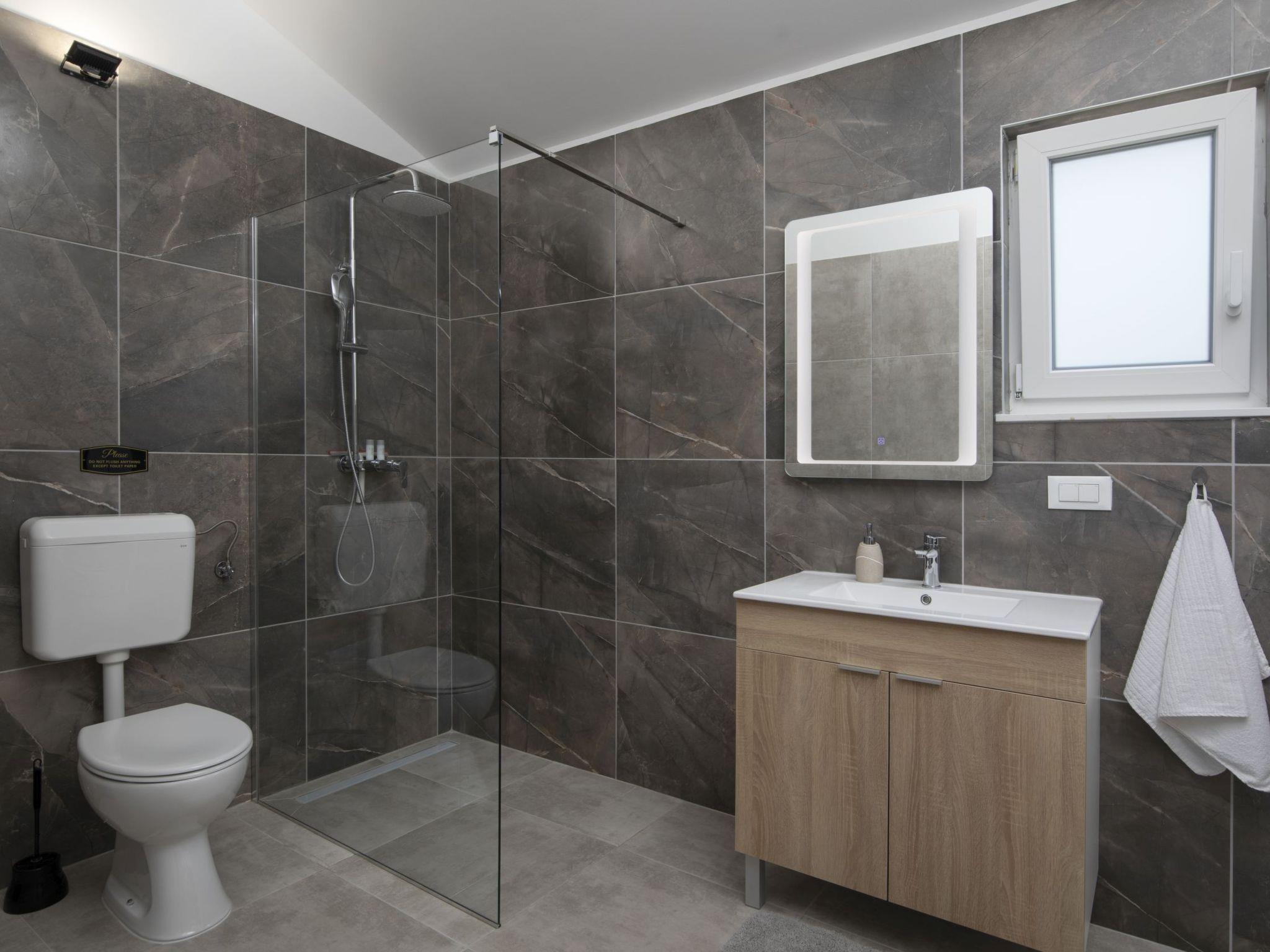 On the ground floor, you’ll find a living room, kitchen, and one bedroom with a private bathroom with shower and sauna. Glass doors open to a terrace with a swimming pool and a grill area, perfect for outdoor meals. There is also an extra toilet for convenience.