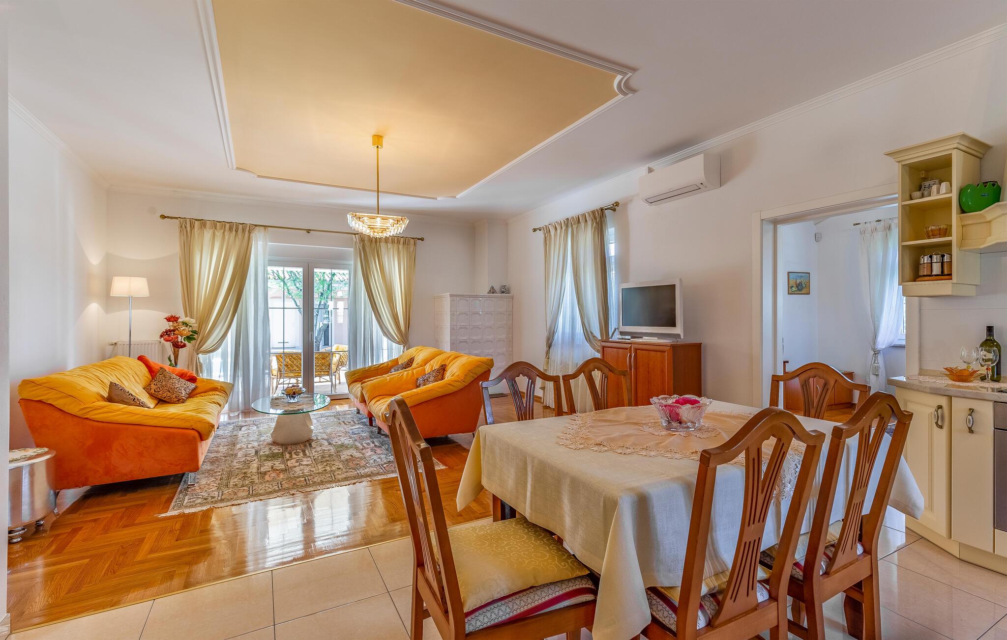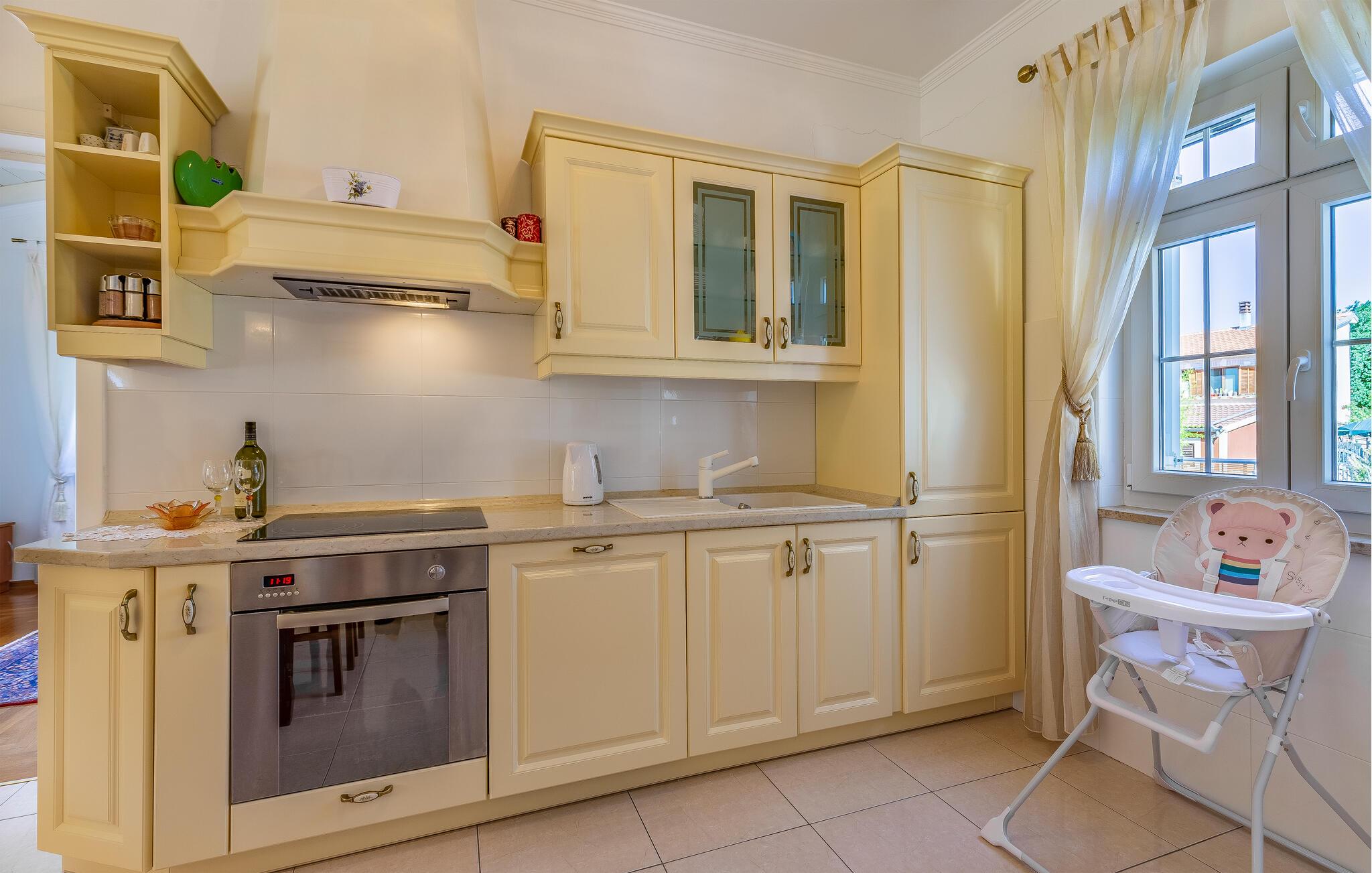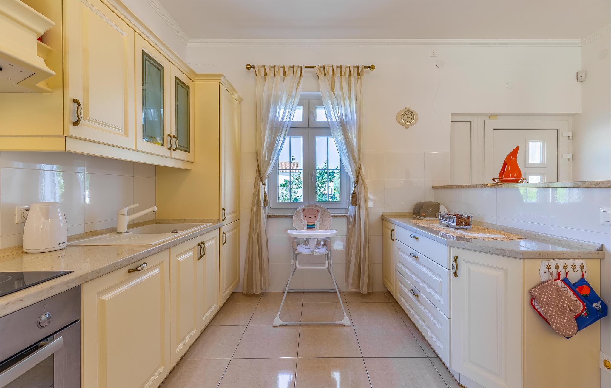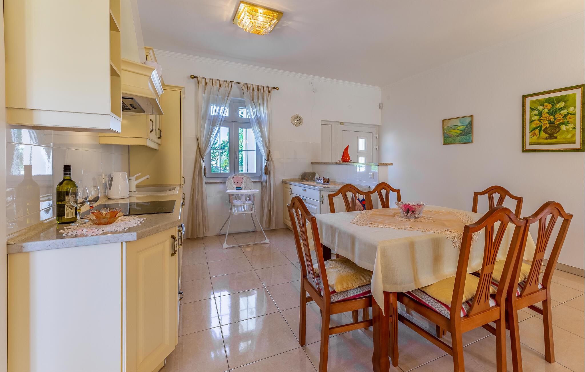 Denne bolig tilbyder fred, privatliv og en behagelig atmosfære. Her kan I slappe af, genoplade batterierne og nyde nærheden til havet og kulturoplevelser. De lyse opholdsrum er klassisk indrettet. Hyg jer sammen på de komfortable siddepladser i stuen, og tilbring hyggelige aftener med at se tv. Brug det veludstyrede køkken til at tilberede jeres måltider og nyde dem i den tilstødende spisestue.