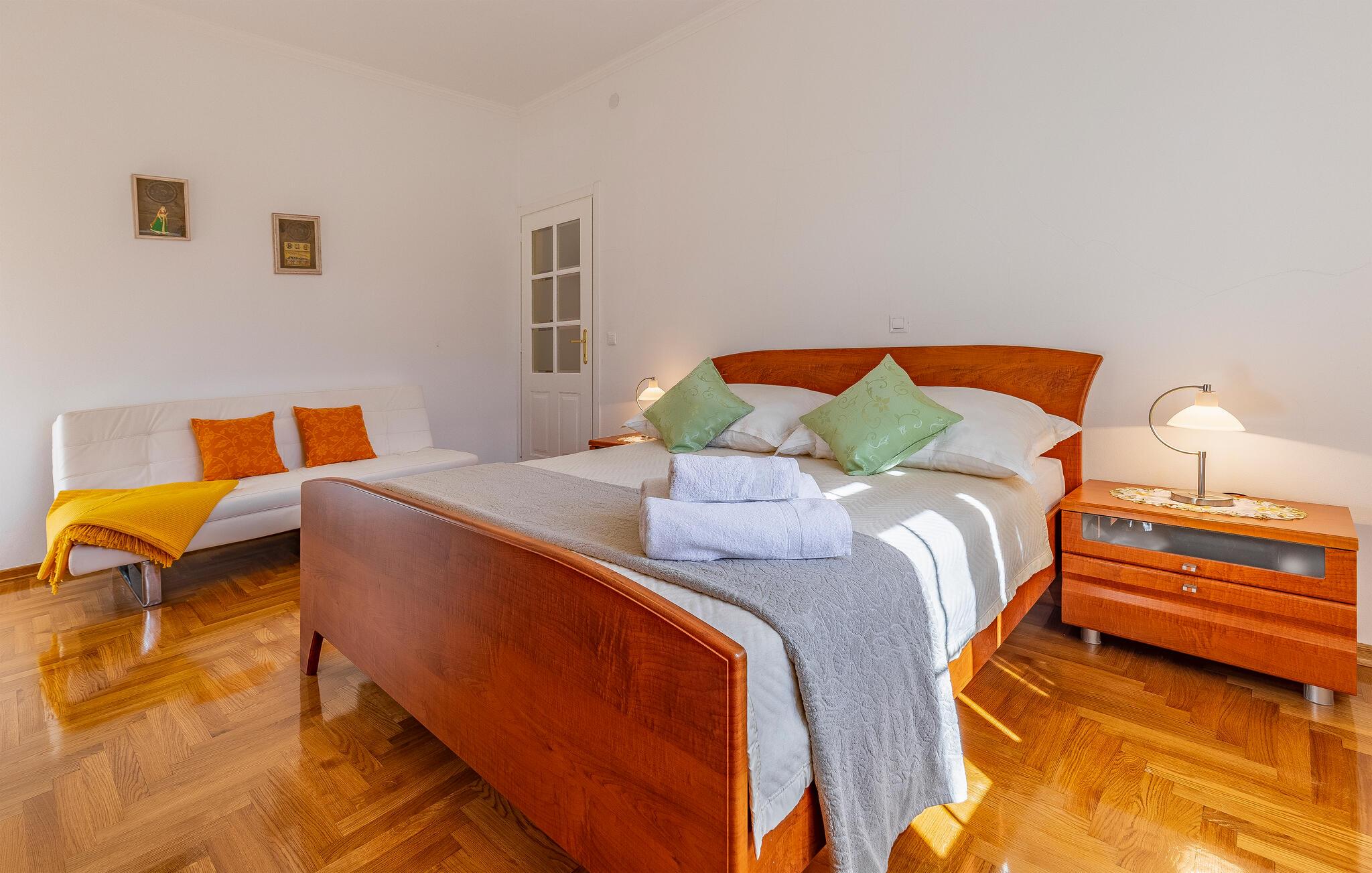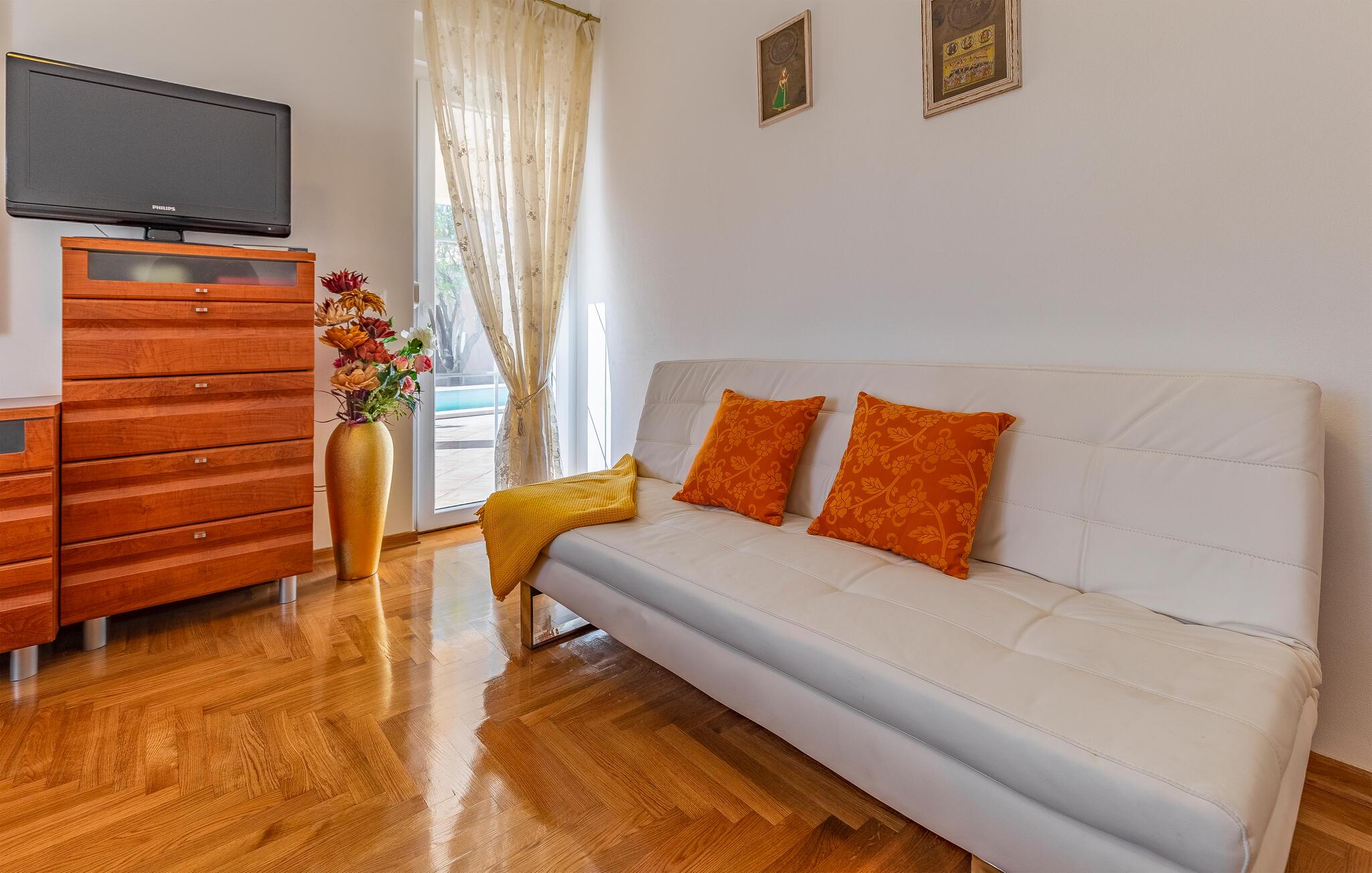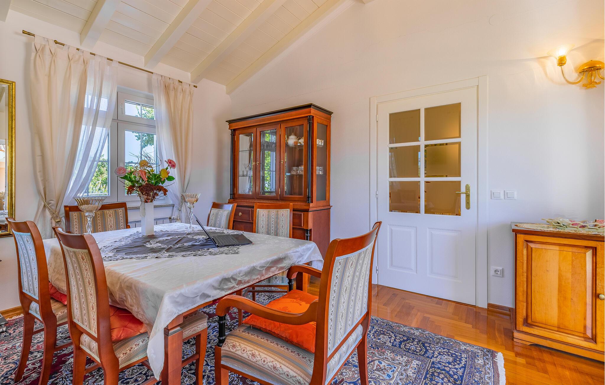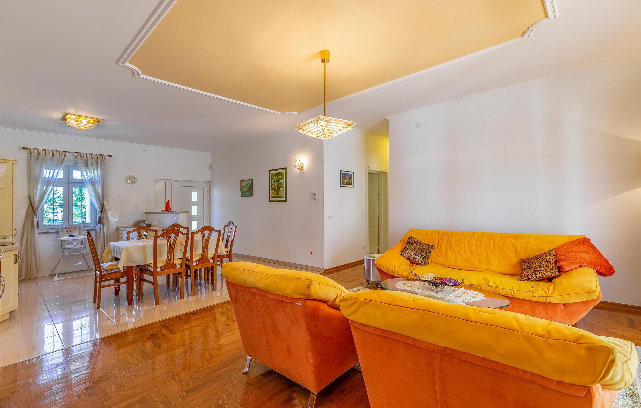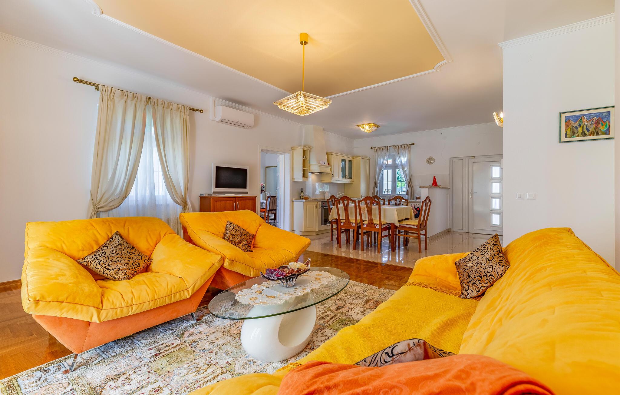 Denne bolig tilbyder fred, privatliv og en behagelig atmosfære. Her kan I slappe af, genoplade batterierne og nyde nærheden til havet og kulturoplevelser. De lyse opholdsrum er klassisk indrettet. Hyg jer sammen på de komfortable siddepladser i stuen, og tilbring hyggelige aftener med at se tv. Brug det veludstyrede køkken til at tilberede jeres måltider og nyde dem i den tilstødende spisestue.