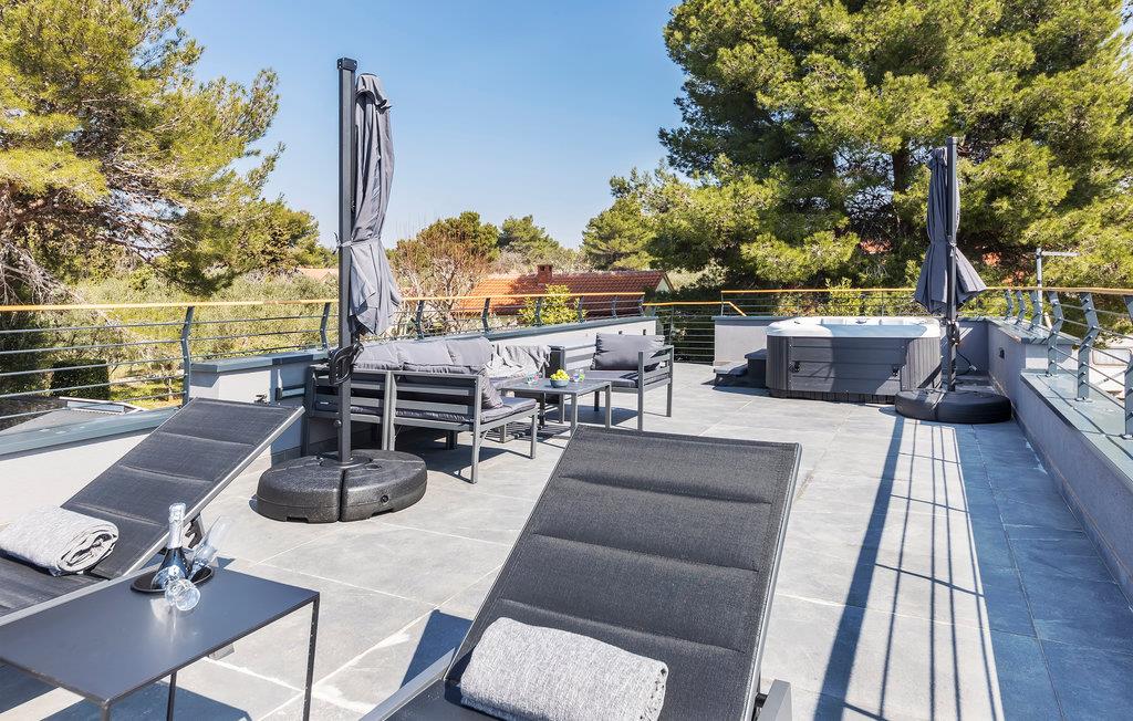 Huset har en lækker tagterrasse med jacuzzi, udendørsmøbler og en fortryllende udsigt til havet og Brijuni-øgruppen. Huset har et moderne design og er udstyret med alle nødvendige hårde hvidevarer. Fra terrassen på 1. sal kan I beundre den vidunderlige havudsigt, mens udendørsterrassen i stueetagen lægger op til jeres hyggelige morgenmadsseancer og grillmiddage. Grunden er indhegnet og har god plads samt mange lege- og fritidsaktiviteter. Her er det også tilladt at tage hunden venner med, som kan løbe frit rundt på det store grønne område sammen med børnene.