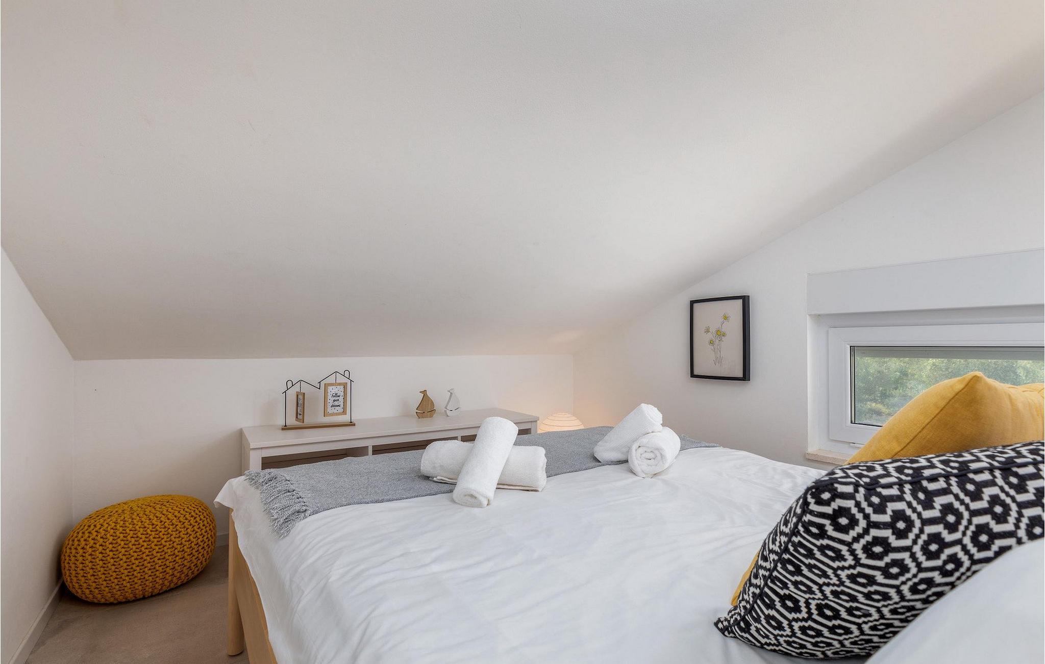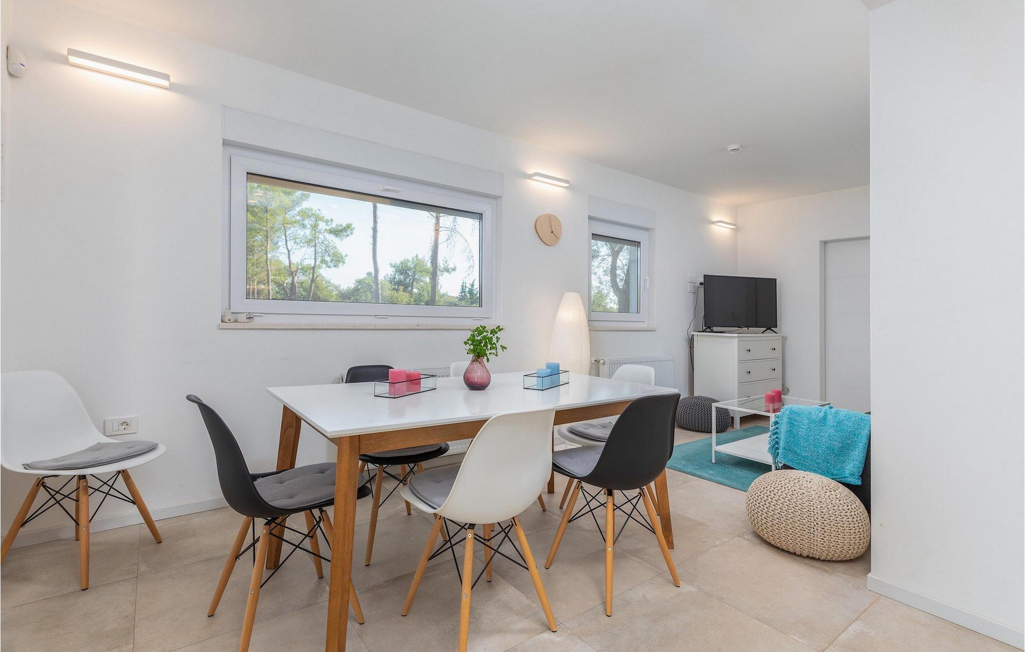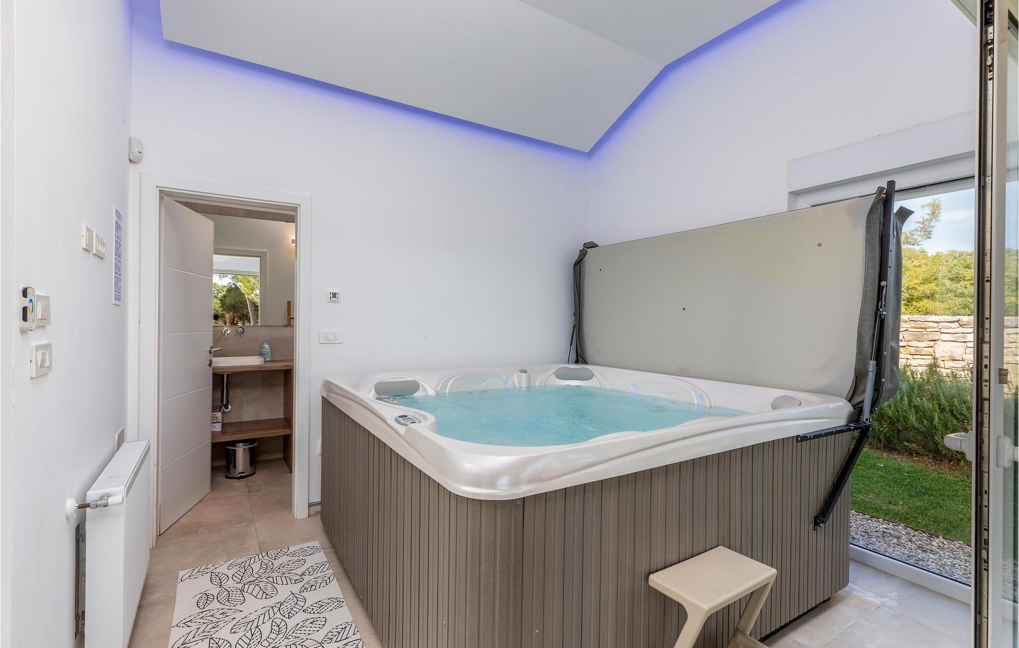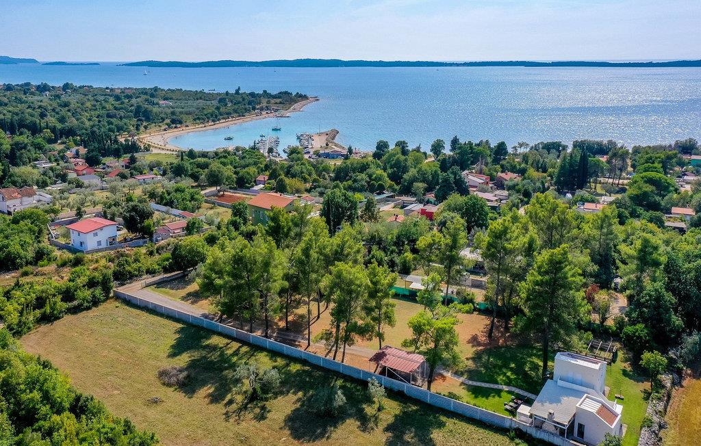 Den smukke, moderne Villa Shimunelka ligger i den lille kystlandsby Peroj, kun få minutters kørsel fra Pula. Denne to-etagers villa er beliggende på en 4000m2 stor grund omgivet af fyrretræer. Den åbne stueetage består af et moderne, fuldt udstyret køkken, en hyggelig opholds- og spisestue, et badeværelse og et smukt dekoreret soveværelse med eget badeværelse. På øverste etage finder du to mere komfortable soveværelser med private badeværelser. Alle værelser har dobbeltseng og aircondition. Ved siden af huset er der et overdækket wellnessområde med jacuzzi og badeværelse. Fra wellnessområdet har du direkte adgang til den store græsplæne. På Villa Shimunelka er der cykler til rådighed, så du kan udforske og udforske omgivelserne. Det specielle ved denne villa er den menneskelige bordfodbold! Tilbring en underholdende tid med dine venner og familie, mens du spiller dette ekstraordinære spil. Selvom villaen ikke har en pool, er vi sikre på, at du vil nyde de nærliggende strande.
