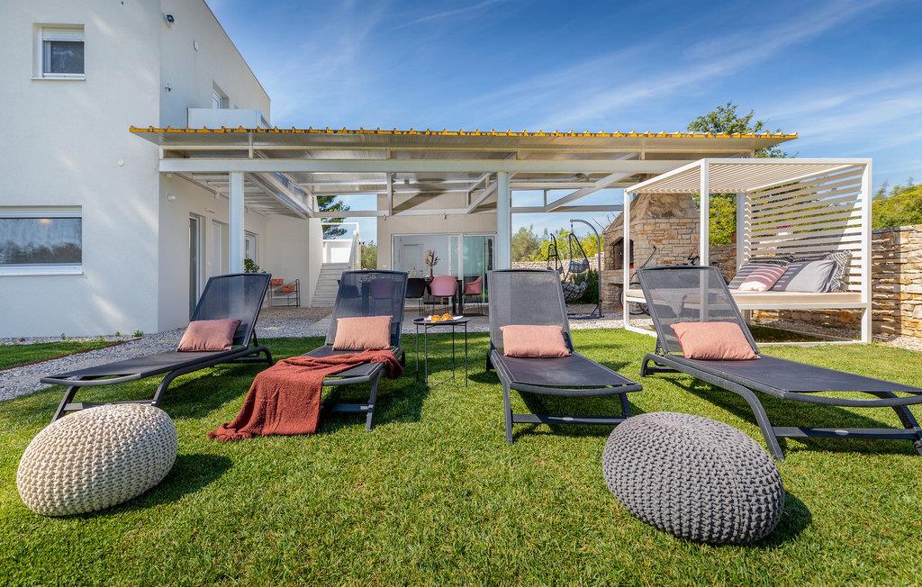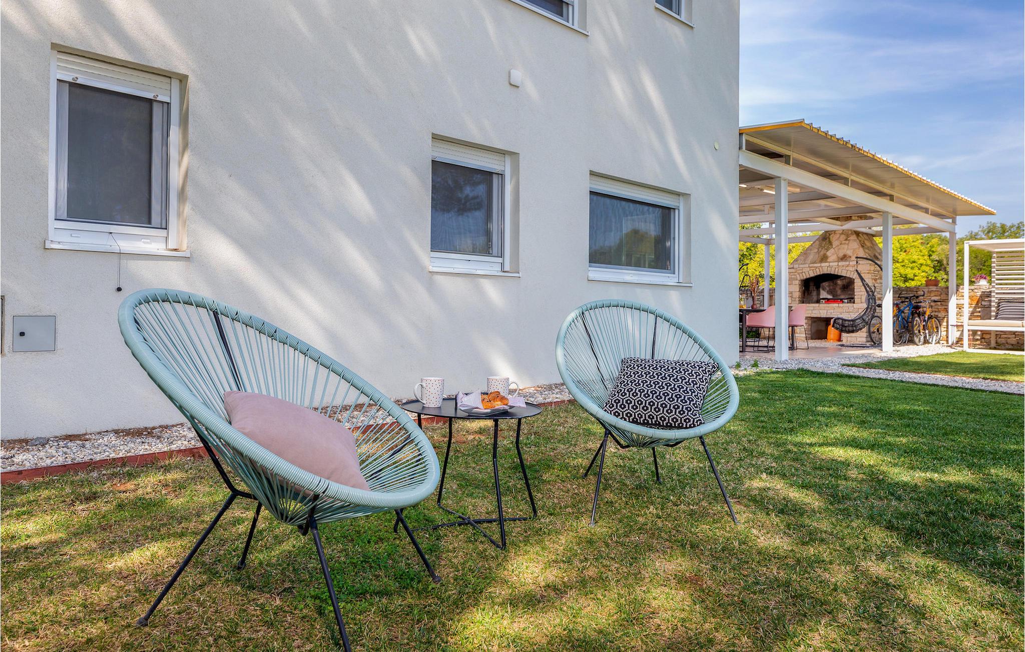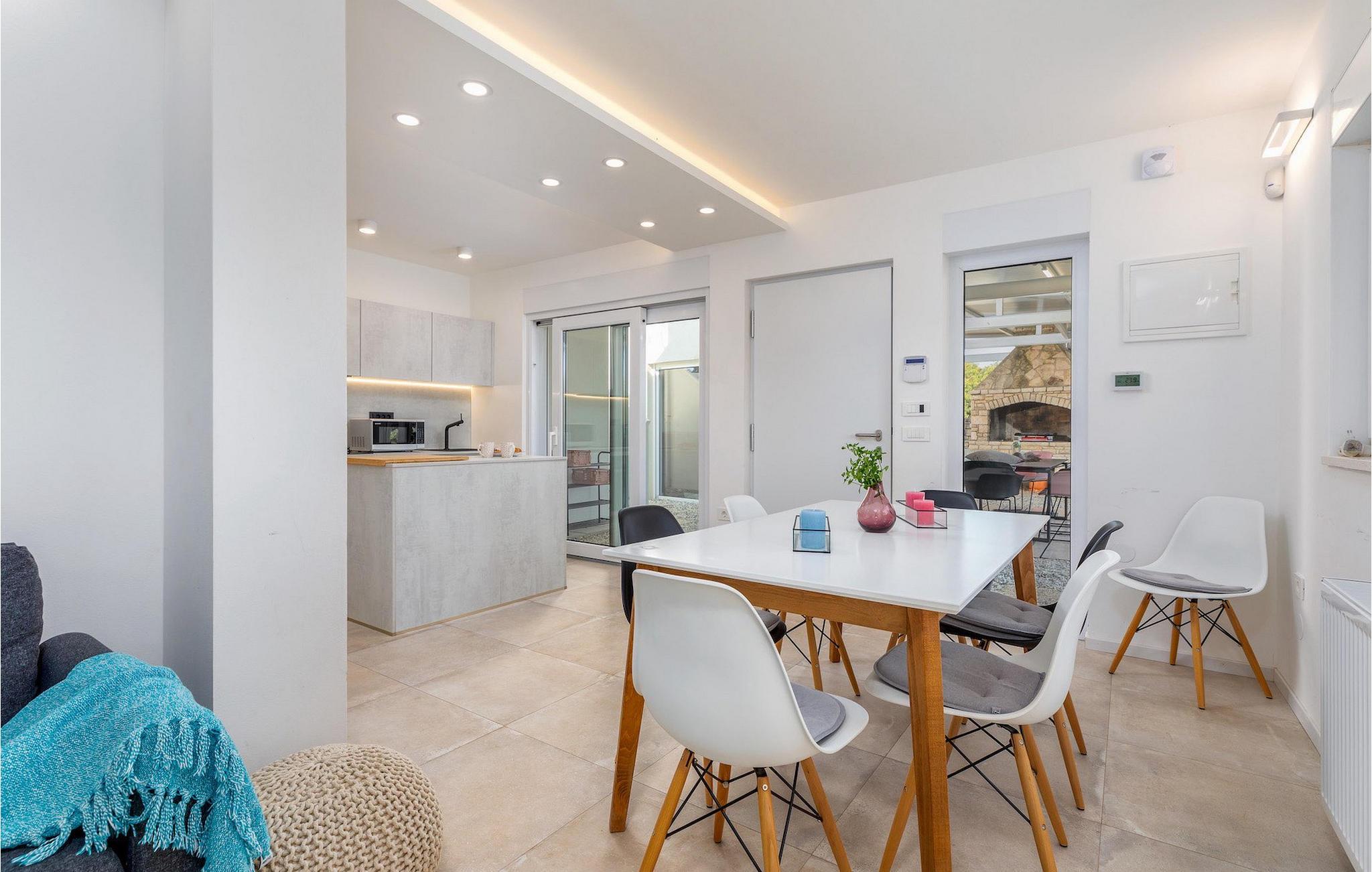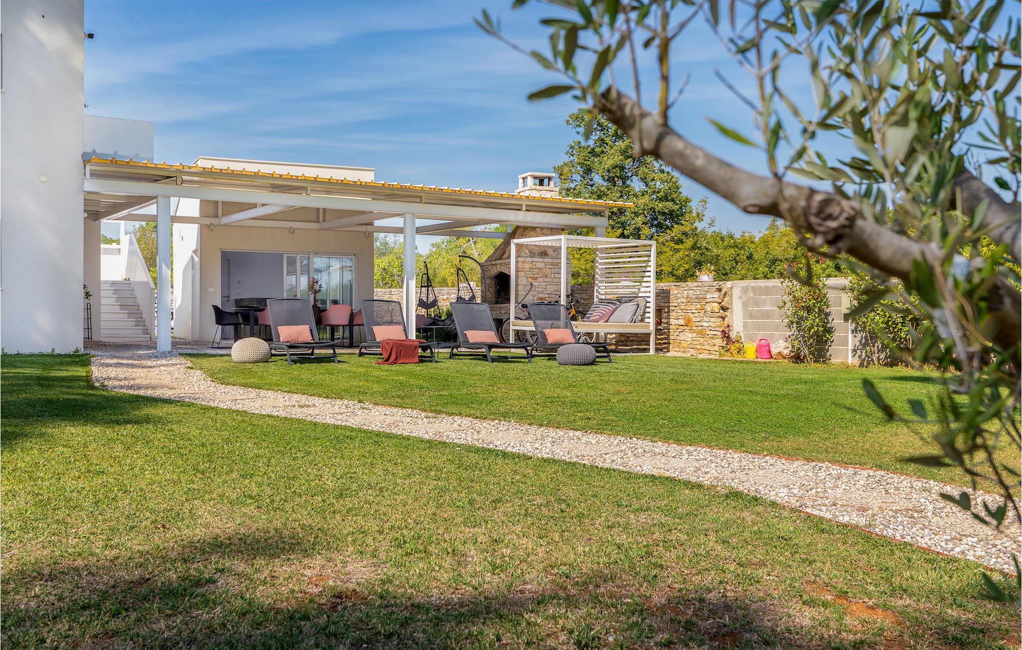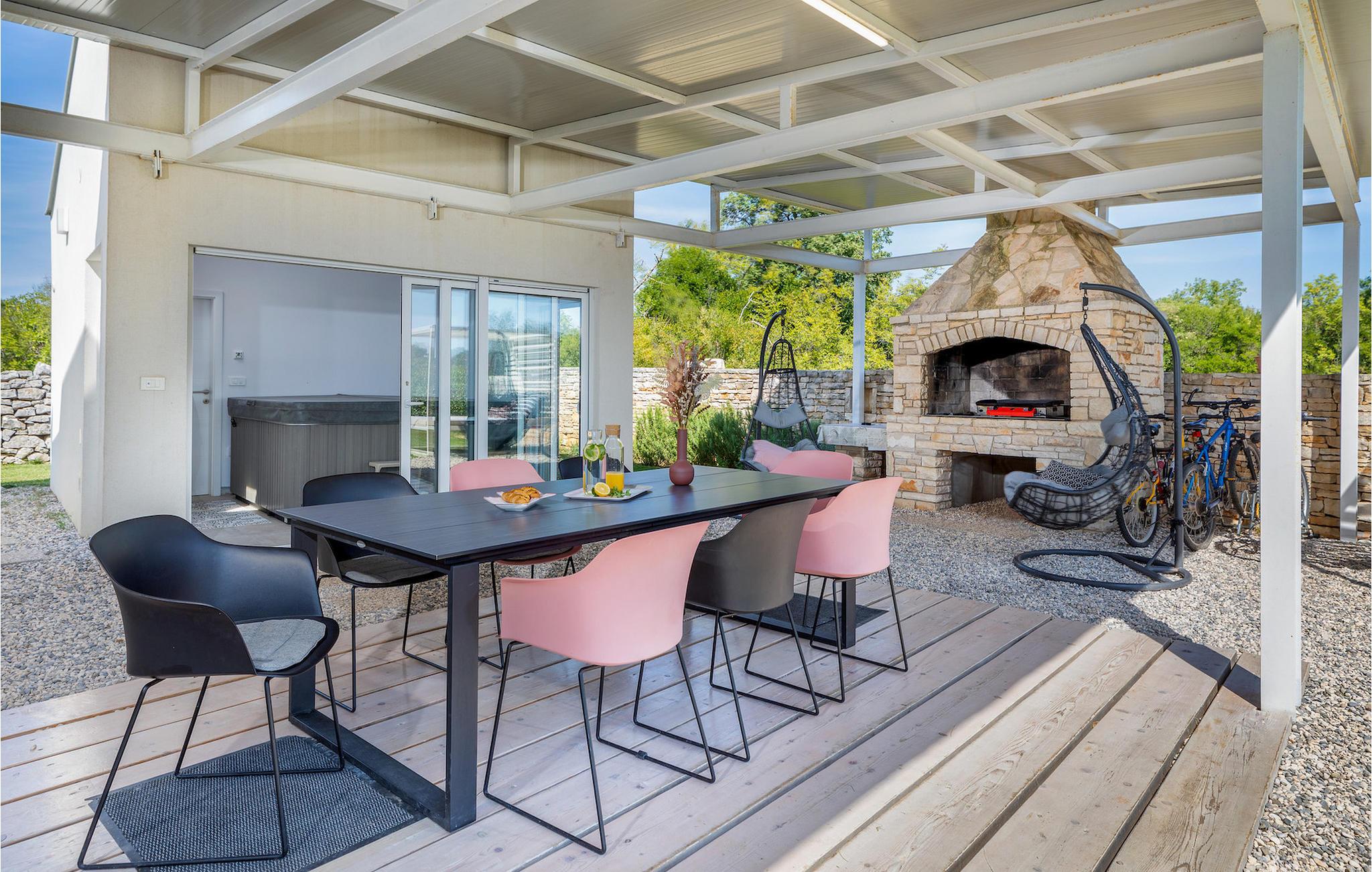 Den smukke, moderne Villa Shimunelka ligger i den lille kystlandsby Peroj, kun få minutters kørsel fra Pula. Denne to-etagers villa er beliggende på en 4000m2 stor grund omgivet af fyrretræer. Den åbne stueetage består af et moderne, fuldt udstyret køkken, en hyggelig opholds- og spisestue, et badeværelse og et smukt dekoreret soveværelse med eget badeværelse. På øverste etage finder du to mere komfortable soveværelser med private badeværelser. Alle værelser har dobbeltseng og aircondition. Ved siden af huset er der et overdækket wellnessområde med jacuzzi og badeværelse. Fra wellnessområdet har du direkte adgang til den store græsplæne. På Villa Shimunelka er der cykler til rådighed, så du kan udforske og udforske omgivelserne. Det specielle ved denne villa er den menneskelige bordfodbold! Tilbring en underholdende tid med dine venner og familie, mens du spiller dette ekstraordinære spil. Selvom villaen ikke har en pool, er vi sikre på, at du vil nyde de nærliggende strande.
