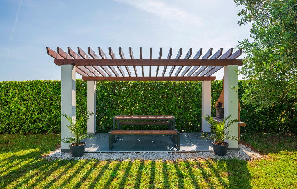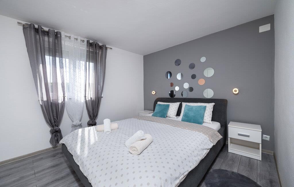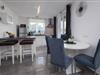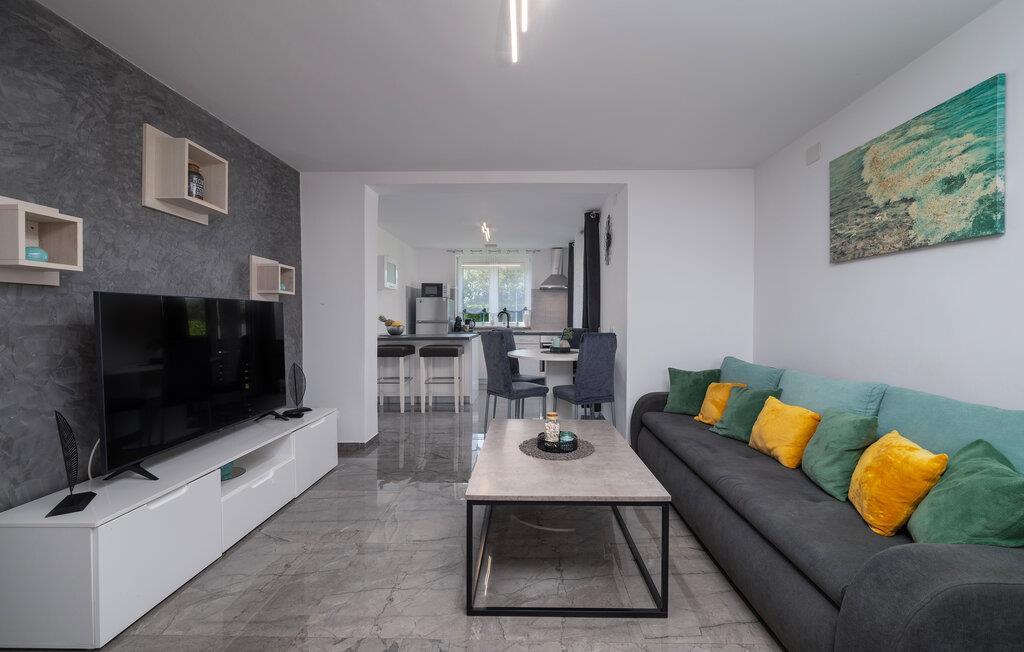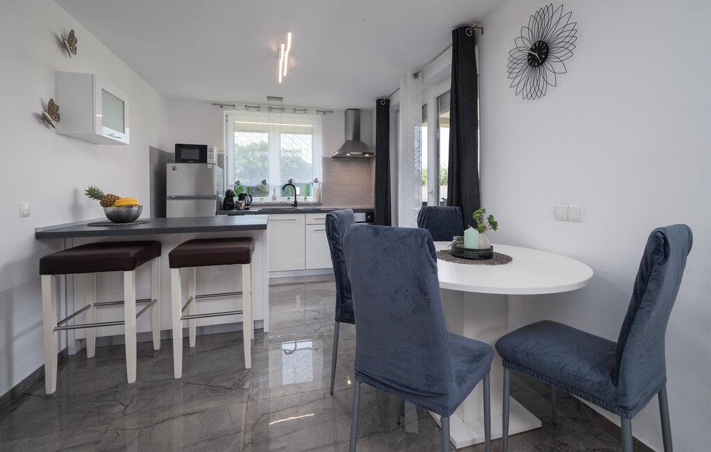 Inde i jeres sommerhus i Fazana finder I en elegant opholdsstue med en stor sofa, ideel til afslappende timer med en god film eller spændende ferielæsning. Det åbne køkken med en praktisk køkkenbord byder på alt, hvad I skal bruge for at forkæle jeres kære med kulinariske lækkerier. Nyd jeres morgenmad i den lyse spiseplads, mens den store glasfront lukker masser af naturligt lys ind.
