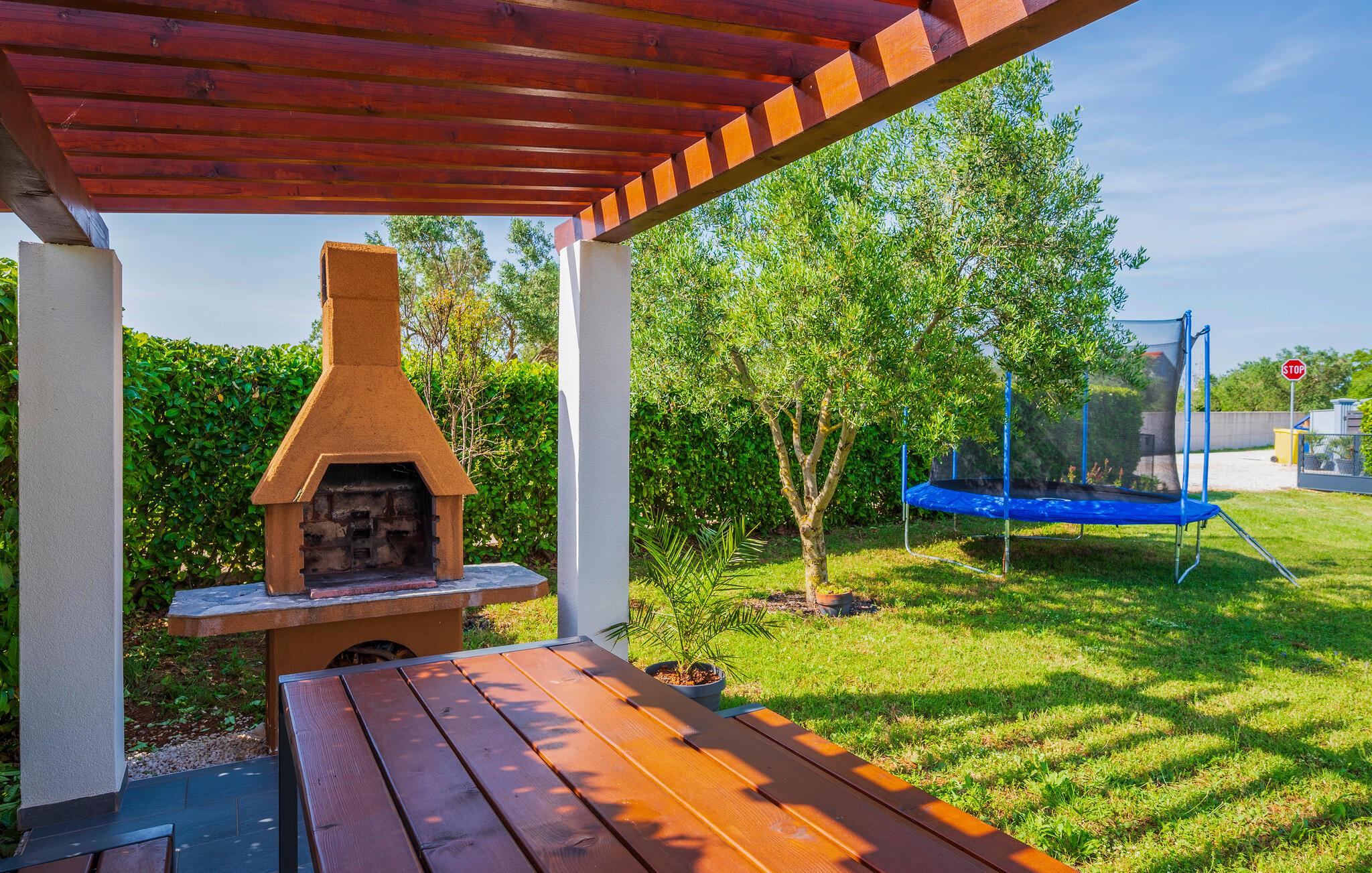 Den store have lægger op til at slappe af, mens den overdækkede terrasse med spisebord og bænke er det ideelle sted at nyde måltider udendørs. Brug den stilfulde grillplads under pergolaen til at tilberede lækre retter og afslutte lune sommeraftener i godt selskab.
