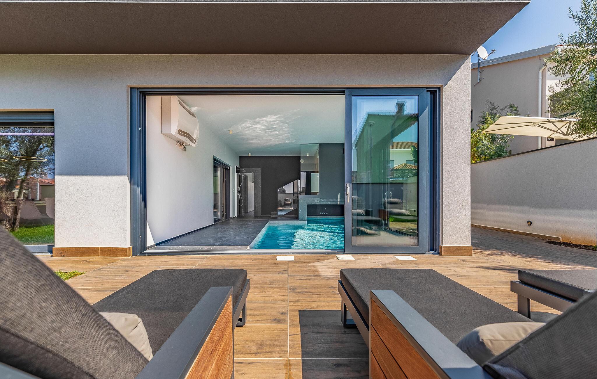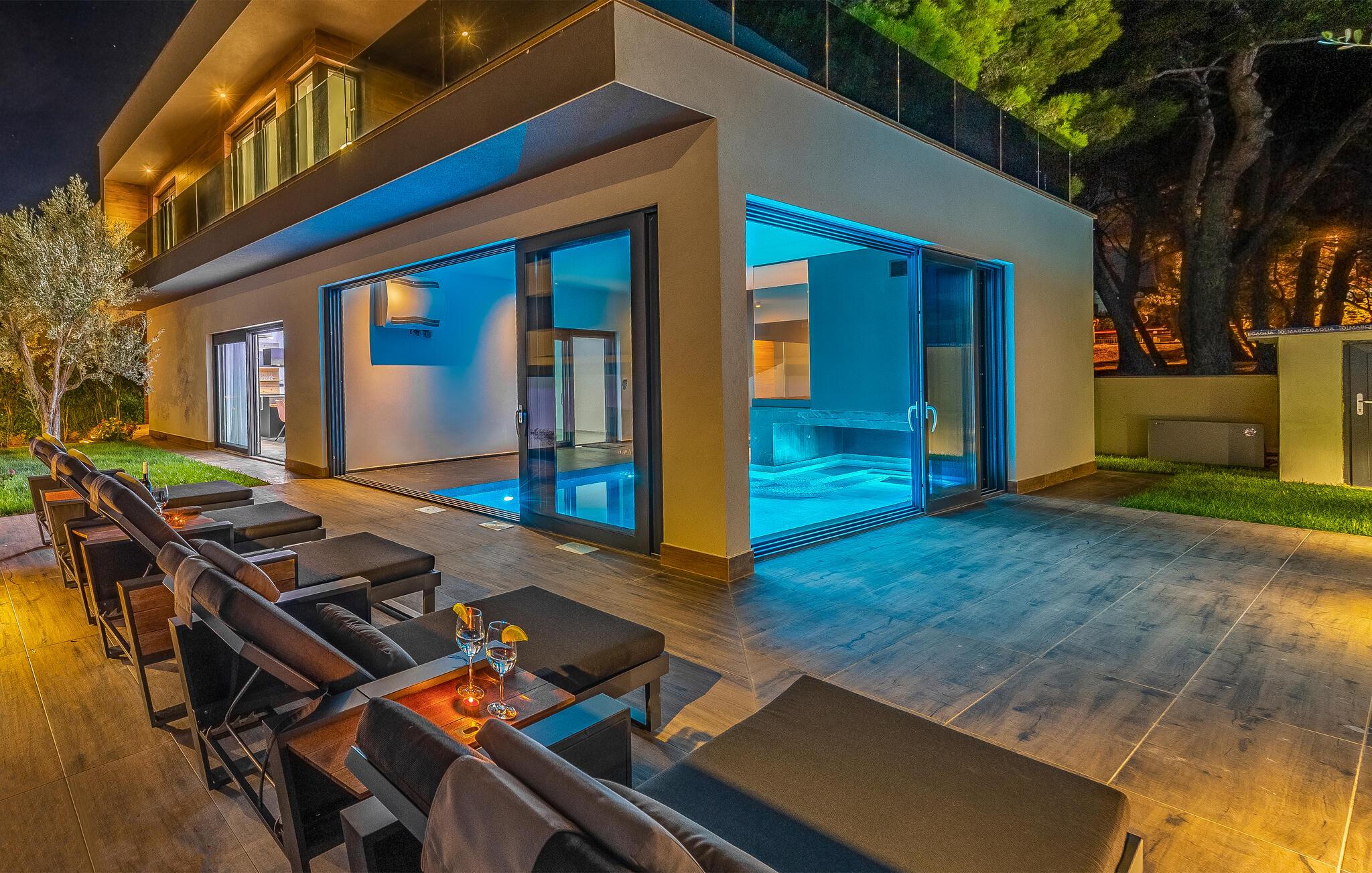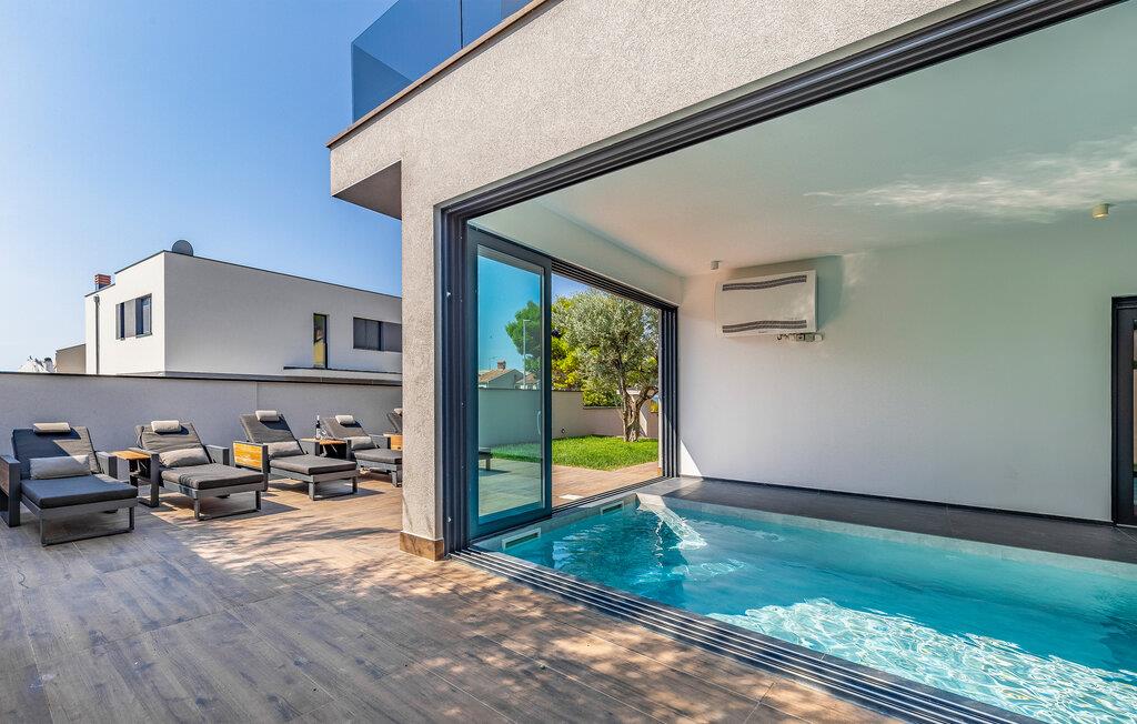 Tilbring ferien i denne luksuriøse villa i Fazana, som vil imponere jer med sit elegante design og kvalitetsløsninger. Den åbne opholdsstue i stueetagen giver jer masser af plads til tid sammen, uanset om I laver mad i det rummelige køkken eller spiller et spil billard. Ovenpå er der private soveværelser med eget badeværelse, nogle med udgang til den store terrasse, ideelt til afslappende yogaøvelser i morgensolen. Slap af i den opvarmede indendørs pool, nyd saunaen eller lounge på liggestolene på den rummelige terrasse.