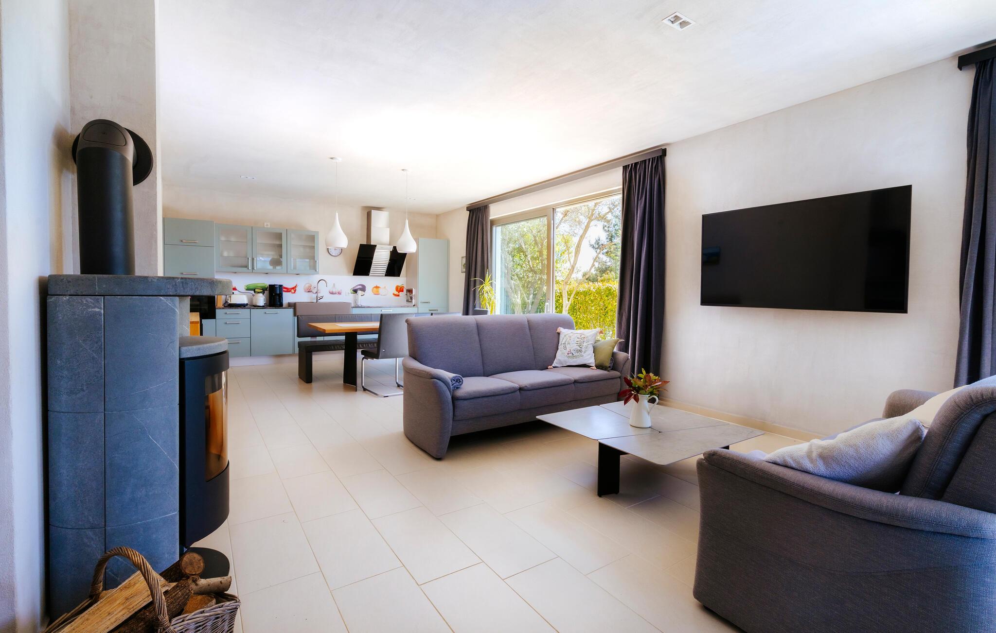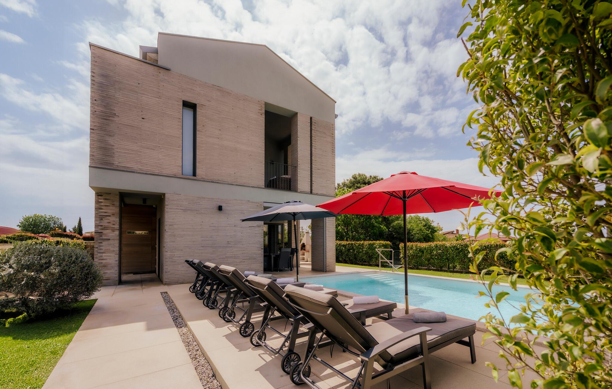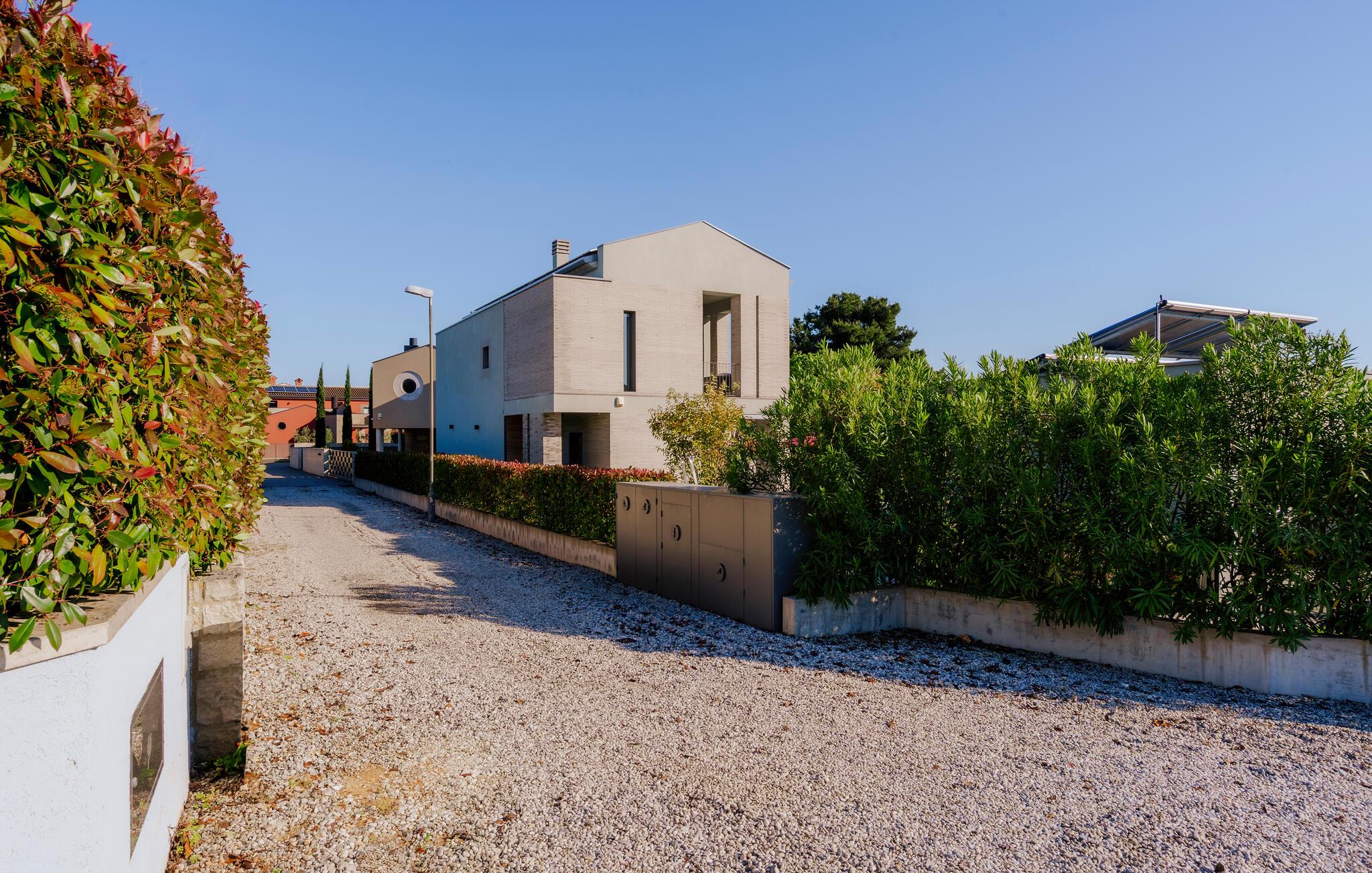 Villa Mima ist eine wunderschöne Villa in Fažana, perfekt geeignet für eine Familie oder Freundesgruppe von 6 Gästen. Die Villa bietet Gästen einen großen Garten und einen privaten Pool für die dringend benötigte Erfrischung an heißen Sommertagen. Erwachsene können es genießen, auf den Liegestühlen zu entspannen und die warme Mittelmeersonne zu genießen, während die Kinder im Pool spielen. Sie können traditionelle Kroatische Speisen auf dem Grill zubereiten und diese Köstlichkeiten im überdachten Essbereich draußen genießen. Für zusätzlichen Spaß stehen den Gästen Citybikes und E-Bikes sowie gegen Aufpreis E-Motorräder zur Erkundung der Umgebung zur Verfügung. Das Innere der Villa Mima ist stilvoll eingerichtet und sehr gut ausgestattet. Dabei finden die Gäste im Erdgeschoss ein geräumiges Wohnzimmer mit TV und Kamin, eine gut ausgestattete Küche und einen gemütlichen Essbereich sowie ein separates WC. Auf der ersten Etage befinden sich 3 Schlafzimmer und ihre 3 en-suite Badezimmer. 2 Schlafzimmer verfügen über Doppelbetten, während das 3. Schlafzimmer über 2 Einzelbetten verfügt, die zusammengeschoben werden können. Jedes Badezimmer verfügt über eine Dusche, während alle Schlafzimmer über einen Fernseher verfügen und voll klimatisiert sind. Die Gäste können ihren ersten Morgenkaffee von den Balkonen im Obergeschoss mit schönem Meerblick genießen. Die Villa Mima liegt außerdem nur 400 m vom Strand entfernt, was zusätzlichen Spaß für die ganze Reisegruppe bedeutet. Wenn Sie während Ihres Urlaubs in Istrien hervorrageFažana ist ein ausgezeichnetes Urlaubsziel für alle, die schöne Strände, klares Meer, ein warmes mediterranes Klima und freundliche und hilfsbereite Einheimische suchen. Dieses Urlaubsziel hat eine interessante Geschichte und Tradition, seine Straßen sind gefüllt mit dem, was viele als "wahren istrischen Charme" bezeichnen, und die Stadt hat ein ausgezeichnetes Angebot für alle Gastronomieliebhaber. Fažana, wie auch Istrien im Allgemeinen, ist bekannt für sein Olivenöl, Fischgerichte, Trüffelgerichte und eine Vielzahl anderer traditioneller Spezialitäten. Sie können in exquisiten Restaurants direkt an der Küste der Stadt speisen und die warmen Sommerabende mit Ihrer Liebsten bei einem romantischen Spaziergang genießen. Die natürliche Schönheit dieser Stadt und der umliegenden Strände sollte nicht übersehen werden. Viele Strände sind für Kinder geeignet, sodass dem Familienurlaub Ihrer Träume nichts im Wege stehen sollte. Diese Lage ist auch ideal für Tagesausflüge in andere großartige Städte wie Pula und Rovinj sowie den atemberaubenden Nationalpark Brijuni. Sie werden es nicht bereuen, wenn Sie Ihren Urlaub in Istrien und Fažana verbringen. Istrien wartet auf Sie!
