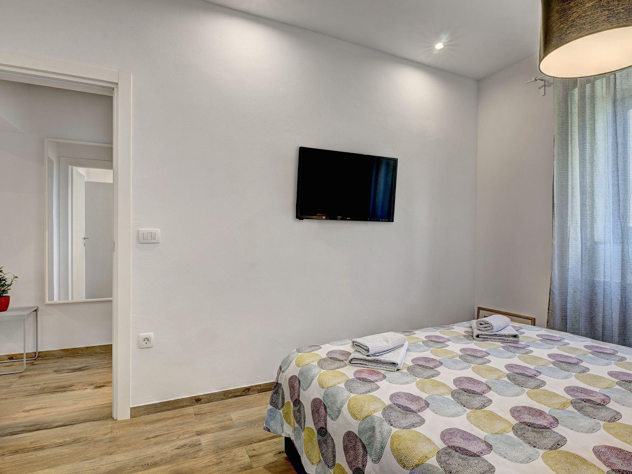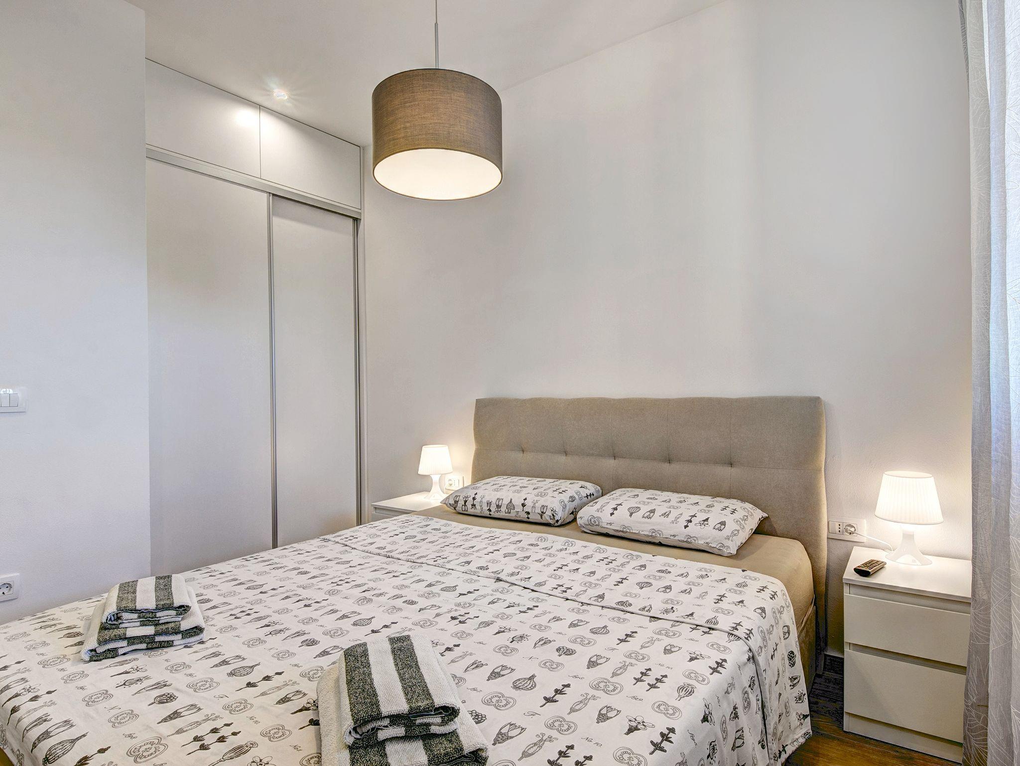 Ferienwohnung bietet Platz für 5 Gäste. Die Betten sind in Schlafzimmern, die es 2 gibt, und in Wohnzimmer, innerhalb einer Gesamtfläche von 45m2, angeordnet. Die Gäste haben eine eigene Terrasse zur Verfügung, auf der sie in warmen Sommernächten genießen können. Es ist erlaubt, Speisen auf dem Gemeinschafts-Grill vorzubereiten. IM PREIS INBEGRIFFEN: Kurtaxe, Endreinigung, Klimatisierung, Parkplatz, Internet, Bügeleisen, Föhn. Die Verfügbarkeit zusätzlicher Dienstleistungen in Ihrem reservierten Termin und die Preise derselben (falls nicht aufgeführt) müssen im Voraus überprüft werden. Zusätzliche Dienstleistungen die in der Zahlungsaufforderung nicht aufgeführt sind werden direkt beim Vermieter bezahlt, angenommen der Gast nutzt auch diese.