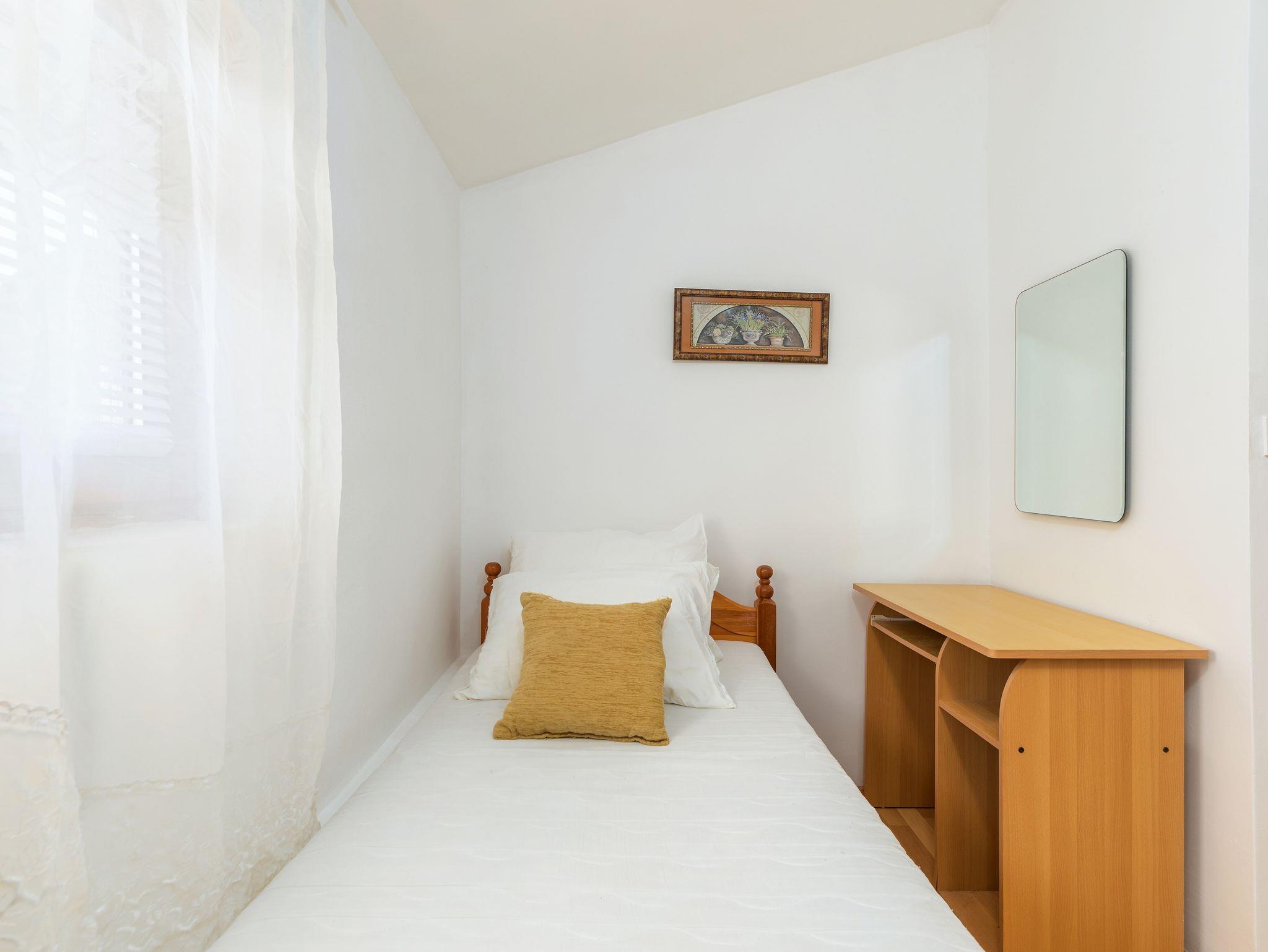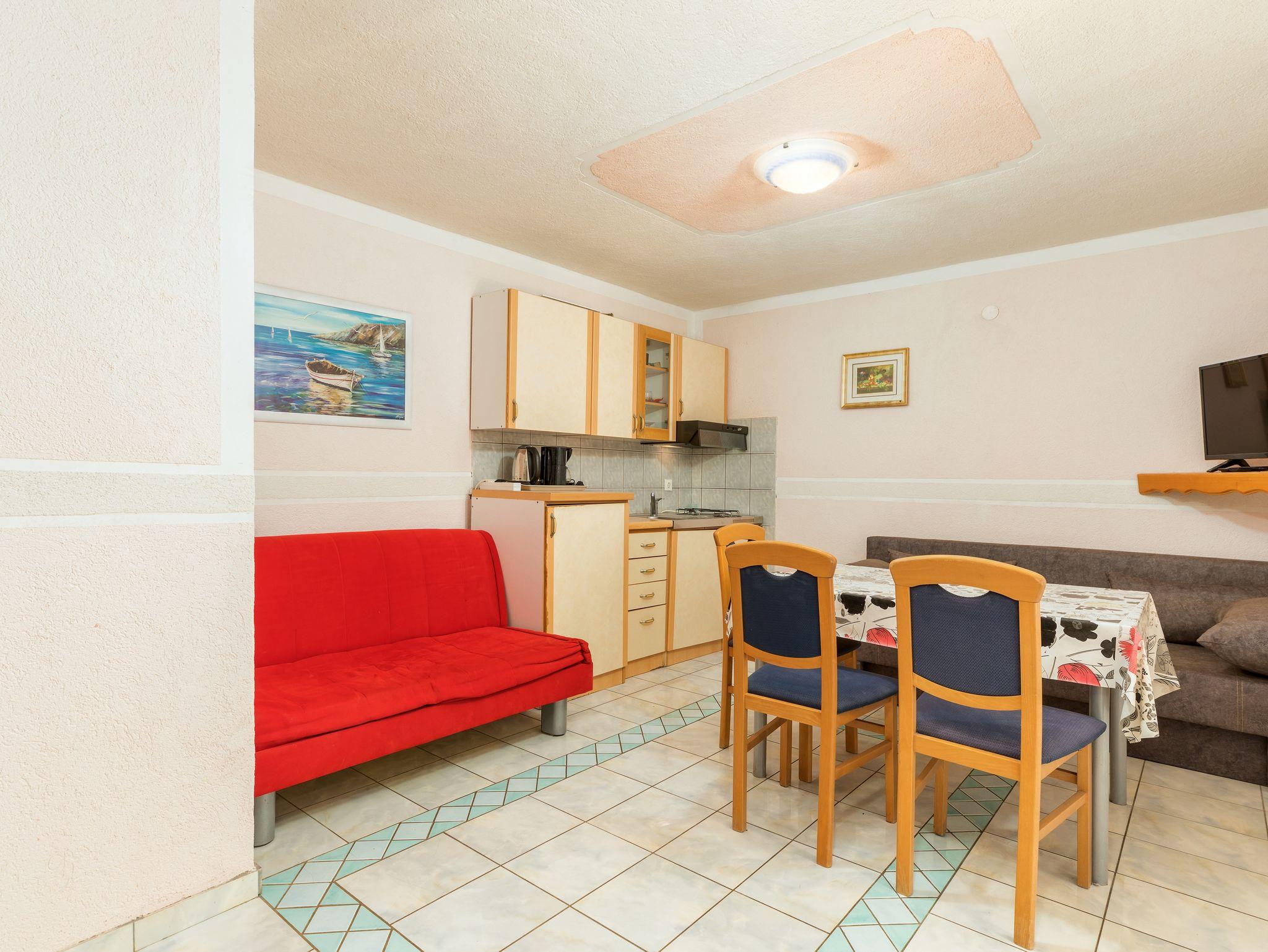 Ferienwohnung bietet Platz für 5 Gäste. Die Betten sind in Schlafzimmern, die es 1 gibt, und in Esszimmer, innerhalb einer Gesamtfläche von 41m2, angeordnet. Die Gäste haben eine eigene Terrasse zur Verfügung, auf der sie in warmen Sommernächten genießen können. Es ist erlaubt, Speisen auf dem Gemeinschafts-Grill vorzubereiten. IM PREIS INBEGRIFFEN: Kurtaxe, Endreinigung, Klimatisierung, Parkplatz, Internet, Bügeleisen, Bügelbrett, Föhn, tragbarer Grill. VERBINDLICHE ZUSÄTZLICHE KOSTEN: Aufzahlung für Kurzaufenthalte (prozentualer Zuschlag pro Nächtigungsanzahl: 30% - 1, 20% - 2, 10% - 3). Die Verfügbarkeit zusätzlicher Dienstleistungen in Ihrem reservierten Termin und die Preise derselben (falls nicht aufgeführt) müssen im Voraus überprüft werden. Zusätzliche Dienstleistungen die in der Zahlungsaufforderung nicht aufgeführt sind werden direkt beim Vermieter bezahlt, angenommen der Gast nutzt auch diese.