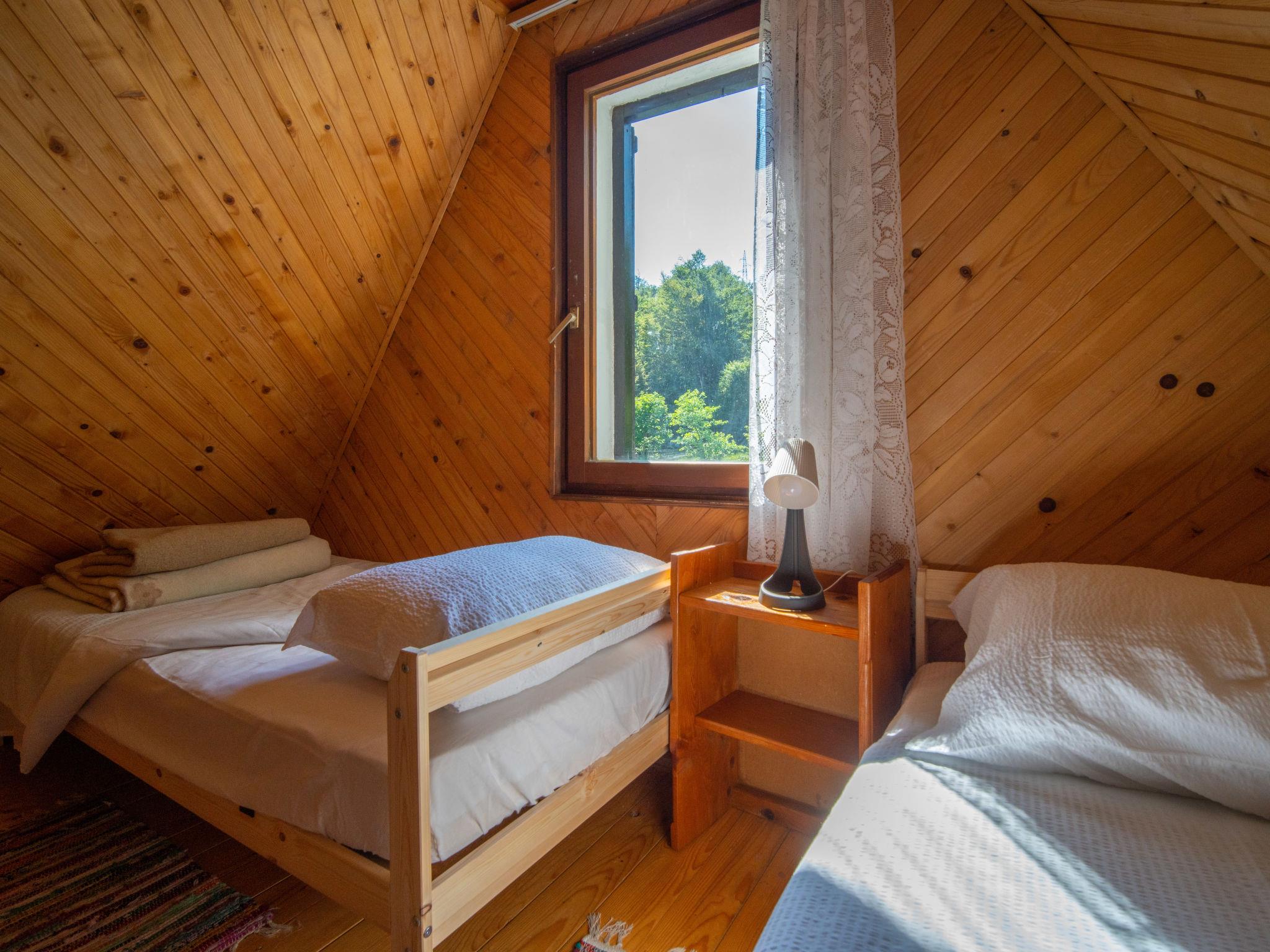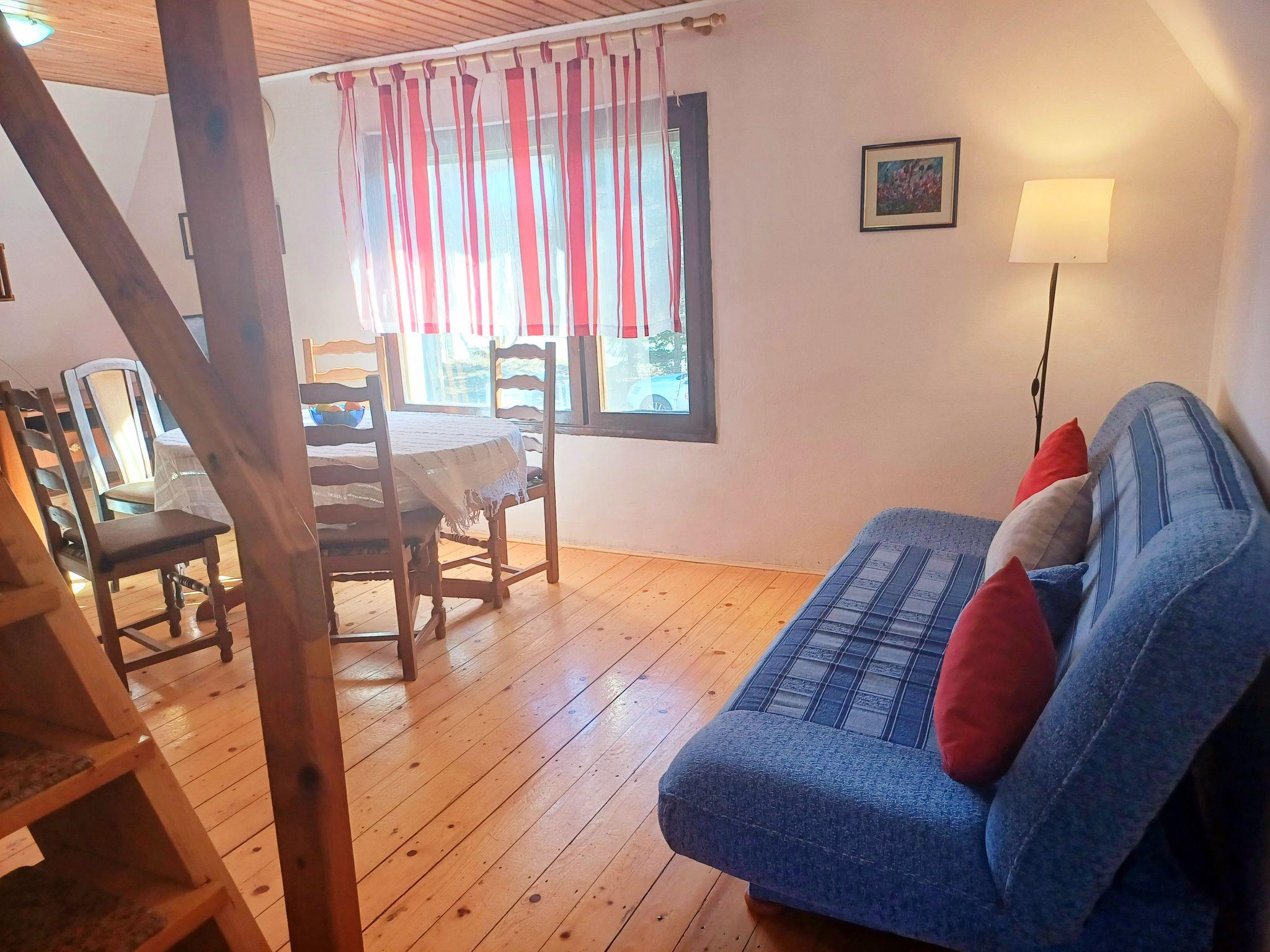 3-room chalet 50 m2 on 2 levels. Living/dining room with TV. Open kitchen (2 ceramic glass hob hotplates, kettle, freezer). Shower/WC. Top floor: (steep stair) open walk-through room with sloping ceilings, - 230 cm with 1 double bed (2 x 90 cm, length 200 cm). Exit to the balcony. 1 small room with sloping ceilings, - 230 cm with 2 beds (90 cm, length 190 cm). Wood heating. Heating available only from 01.09. to 15.05. Barbecue (portable), deck chairs. Facilities: hair dryer, logs (free). Internet (WiFi, free). Maximum 2 pets/ dogs allowed. Available: convection oven in the open kitchen.