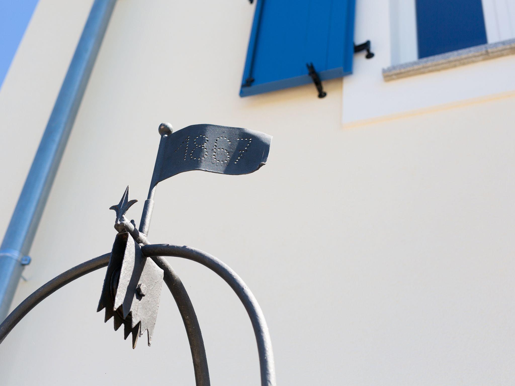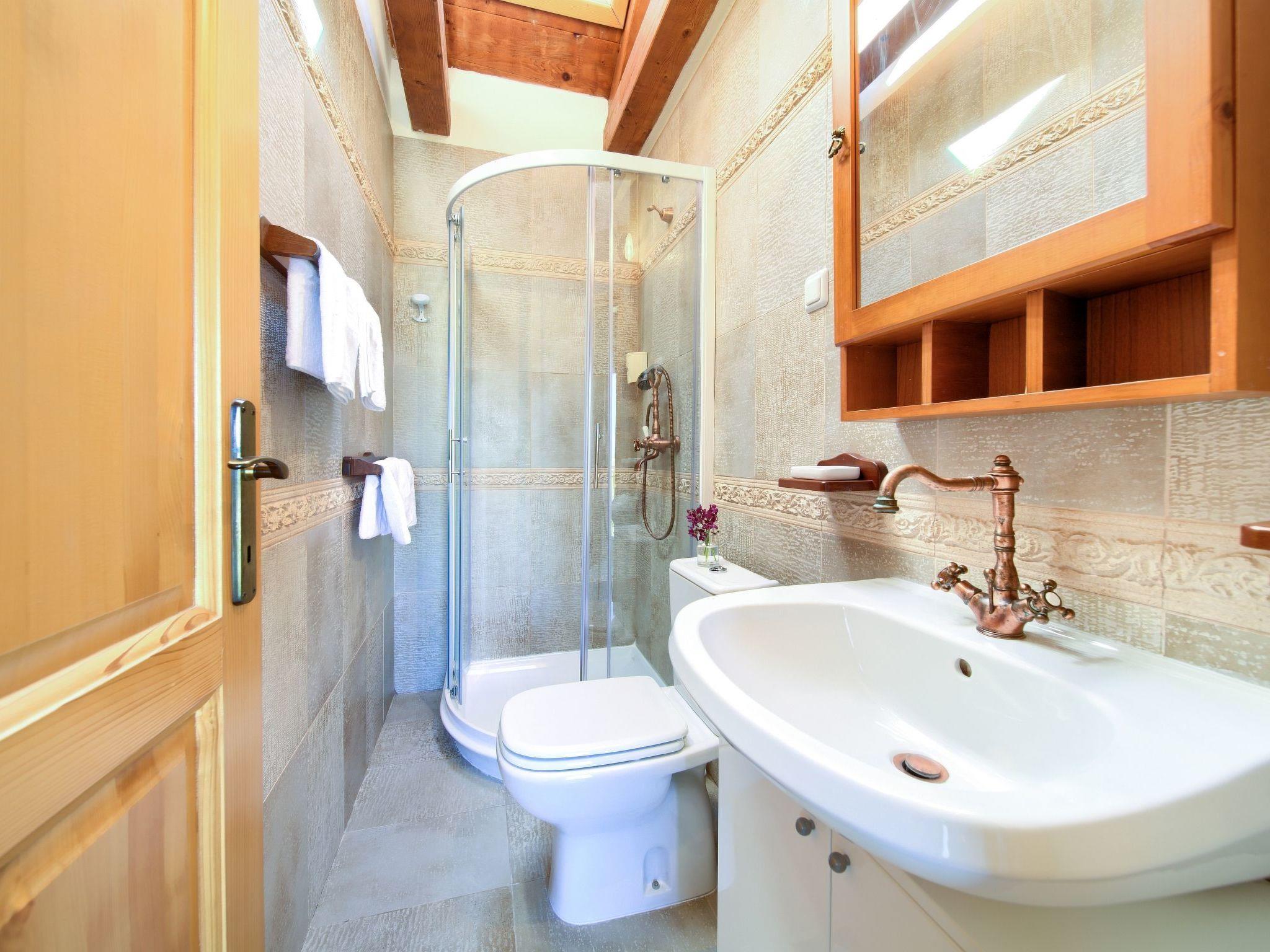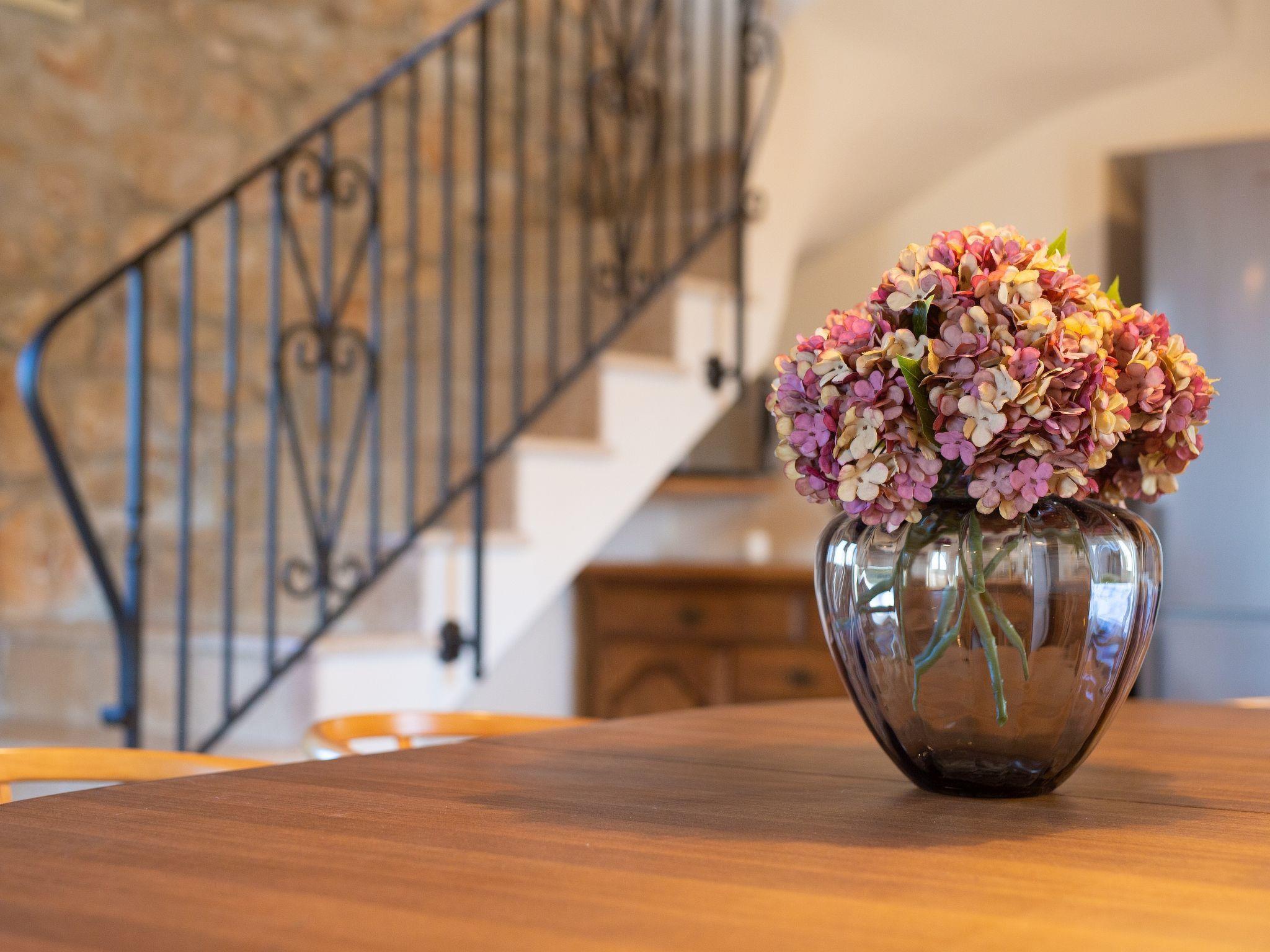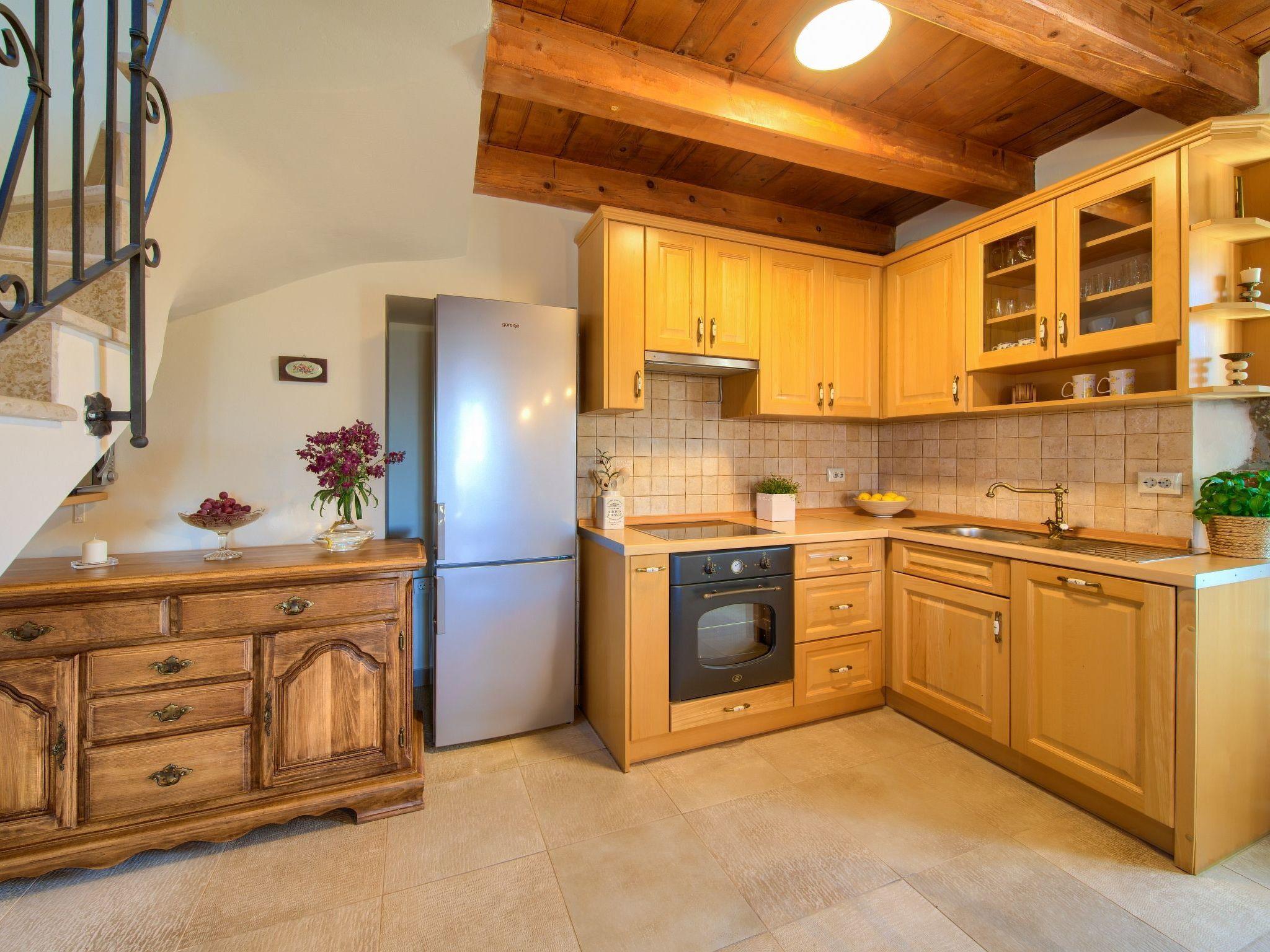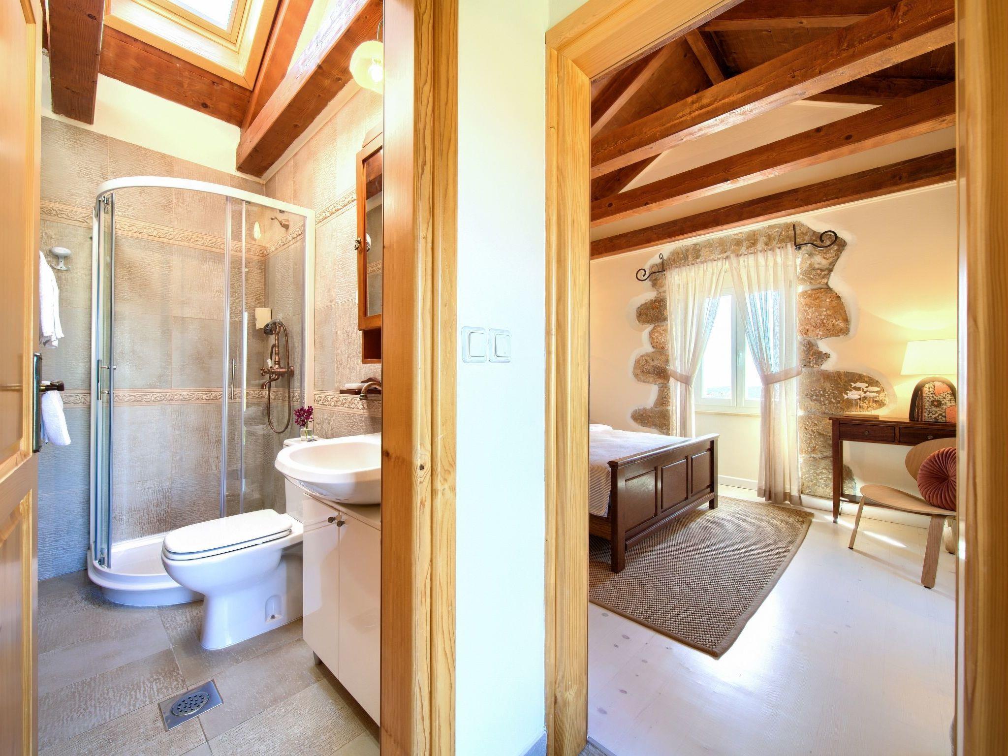 The exterior of the holiday house is just as inviting, with a garden enclosed by a traditional stone wall for exclusive guest use. It features sun loungers perfect for basking in the serene surroundings, a pool to refresh on sun-drenched days, and is adorned with olive trees, oleander, and Mediterranean flowers. For those who enjoy outdoor dining, a grill in a roofed area is available, alongside a shaded terrace, a quaint balcony, and a veranda for enjoying a glass of wine in tranquility. Additionally, three parking spaces ensure easy access for those arriving by car.