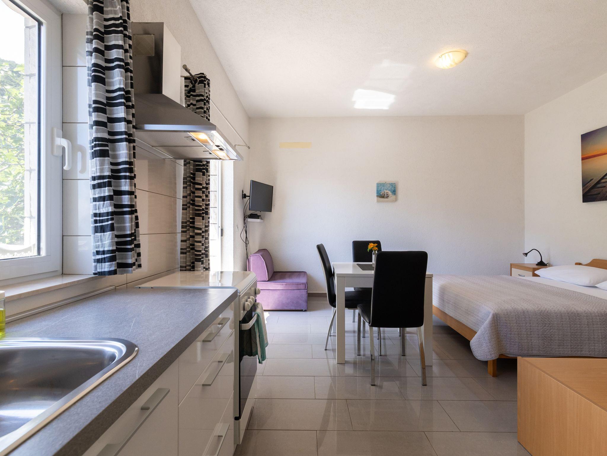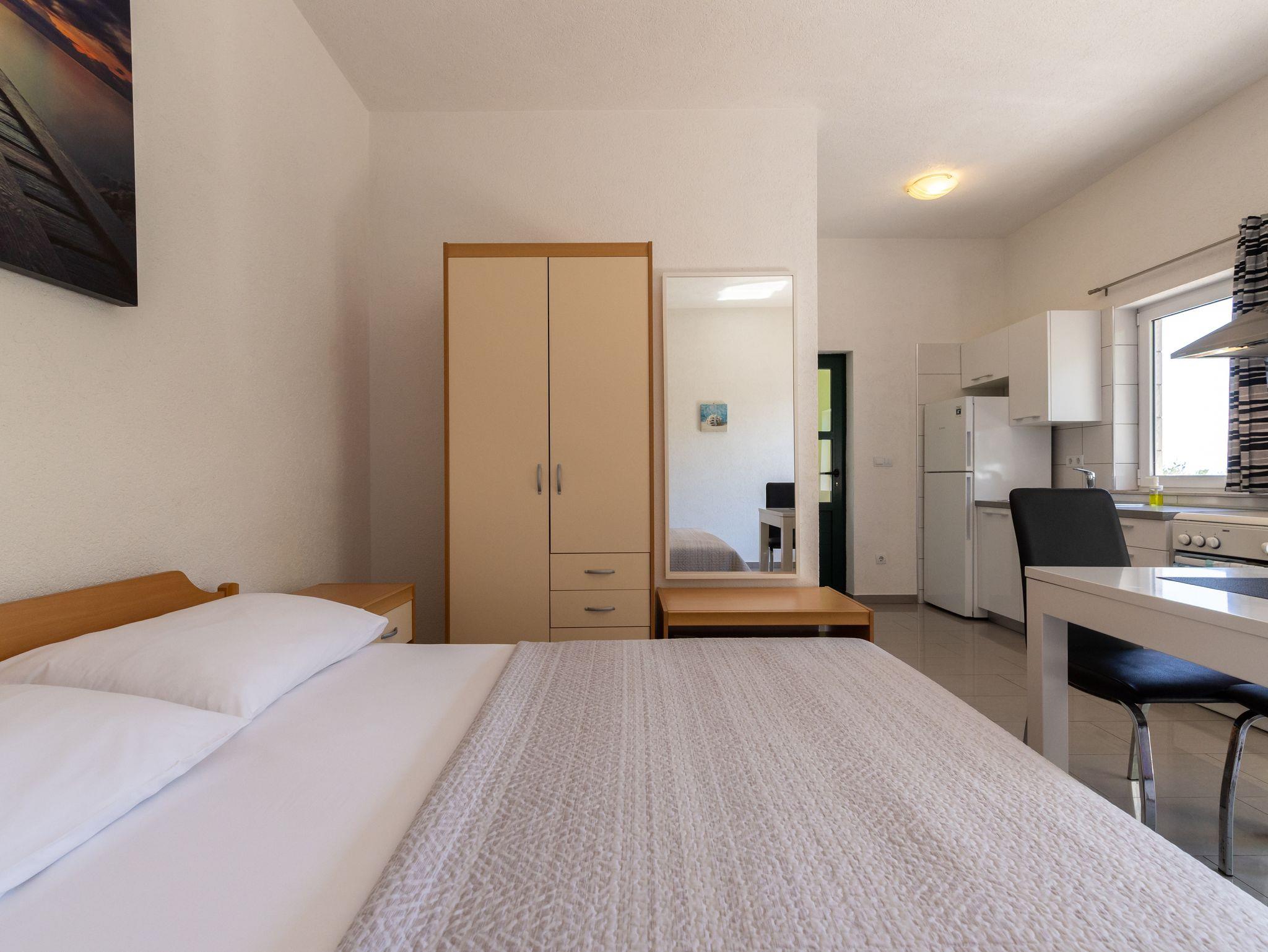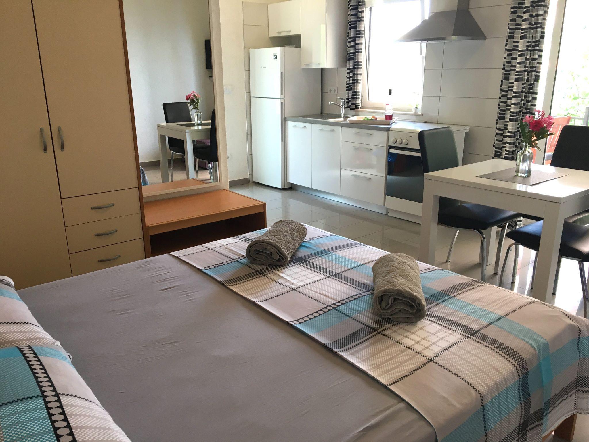 Studio bietet Platz für 2 Gäste. Die Betten sind in Schlafzimmern, die es 1 gibt, innerhalb einer Gesamtfläche von 24m2, angeordnet. Die Gäste haben eine eigene Terrasse zur Verfügung, auf der sie in warmen Sommernächten genießen können. Das Studio-Apartment bietet Meerblick. Es ist erlaubt, Speisen auf dem Gemeinschafts-Grill vorzubereiten. IM PREIS INBEGRIFFEN: Kurtaxe, Endreinigung, Parkplatz, Internet, Kinderbett, tragbarer Grill, 1 Bett für Kinder (im Preis enthalten). Die Verfügbarkeit zusätzlicher Dienstleistungen in Ihrem reservierten Termin und die Preise derselben (falls nicht aufgeführt) müssen im Voraus überprüft werden. Zusätzliche Dienstleistungen die in der Zahlungsaufforderung nicht aufgeführt sind werden direkt beim Vermieter bezahlt, angenommen der Gast nutzt auch diese.