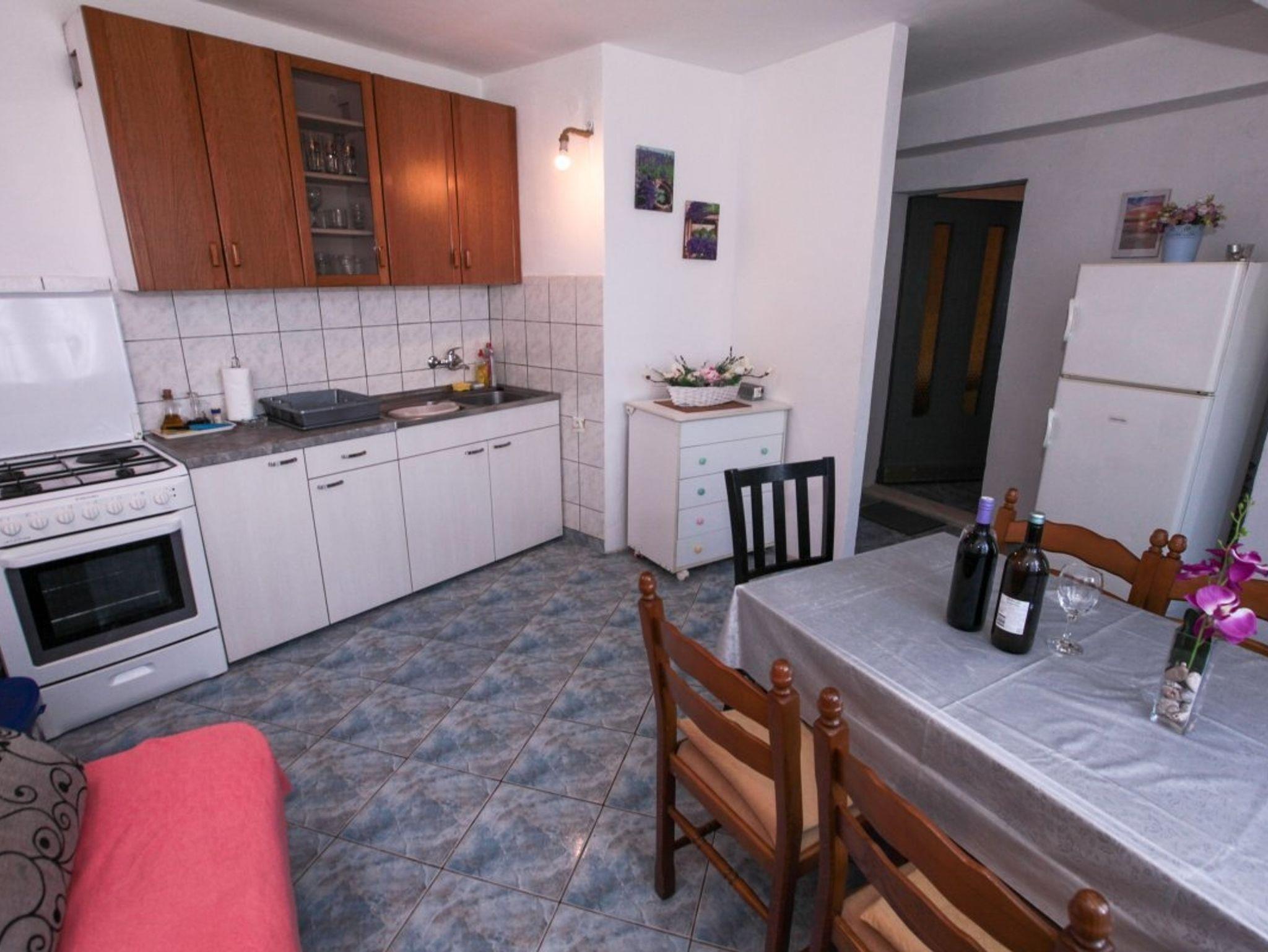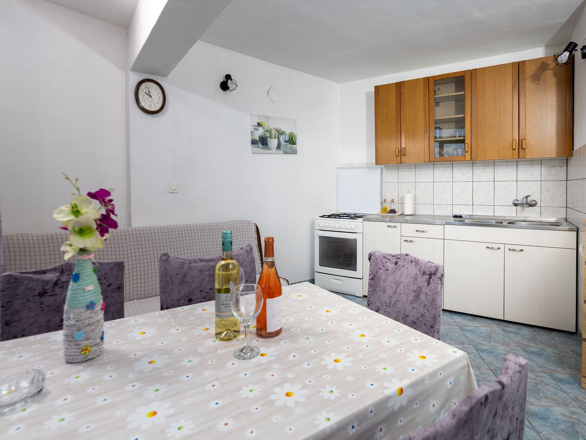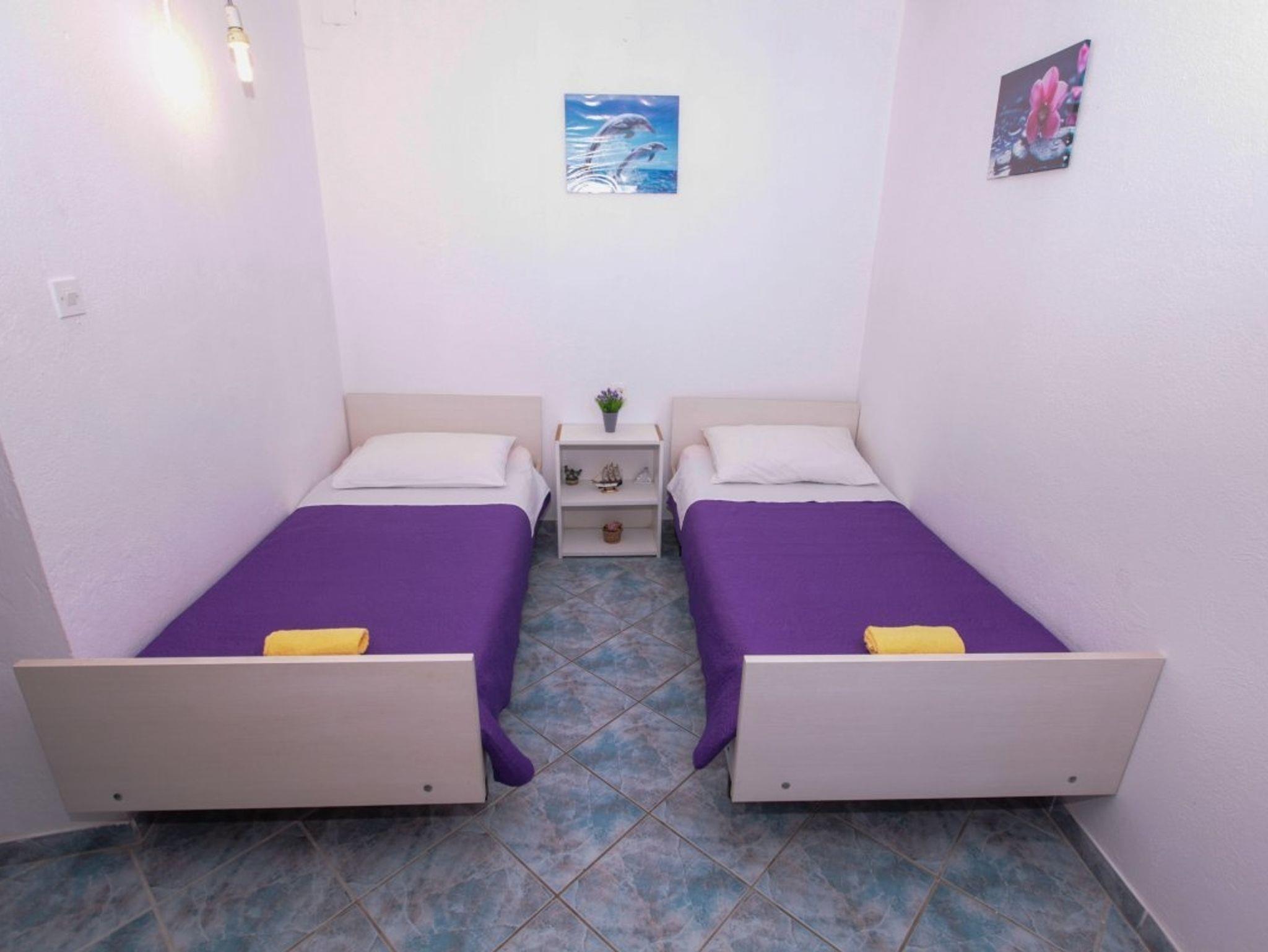Ferienwohnung bietet Platz für 5 Gäste. Die Betten sind in Schlafzimmern, die es 2 gibt, und in Esszimmer, innerhalb einer Gesamtfläche von 37m2, angeordnet. Die Gäste haben eine eigene Terrasse zur Verfügung, auf der sie in warmen Sommernächten genießen können. Das Apartment bietet Meerblick. Es ist erlaubt, Speisen auf dem Gemeinschafts-Grill vorzubereiten. Durch das Schlafzimmer der gebuchten Unterkunftseinheit geht man in die andere Räume der Einheit. IM PREIS INBEGRIFFEN: Kurtaxe, Endreinigung, Parkplatz, Internet, Bootsanlegeplatz, Kinderbett. VERBINDLICHE ZUSÄTZLICHE KOSTEN: Aufzahlung für Kurzaufenthalte (prozentualer Zuschlag pro Nächtigungsanzahl: 30% - 1, 20% - 2, 10% - 3). Die Verfügbarkeit zusätzlicher Dienstleistungen in Ihrem reservierten Termin und die Preise derselben (falls nicht aufgeführt) müssen im Voraus überprüft werden. Zusätzliche Dienstleistungen die in der Zahlungsaufforderung nicht aufgeführt sind werden direkt beim Vermieter bezahlt, angenommen der Gast nutzt auch diese.