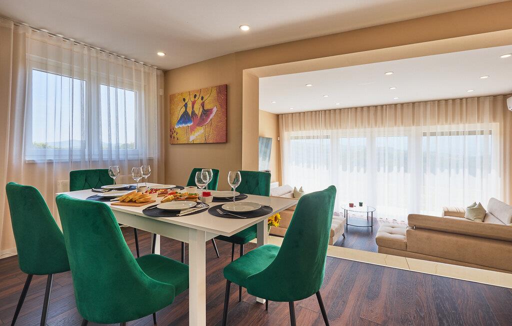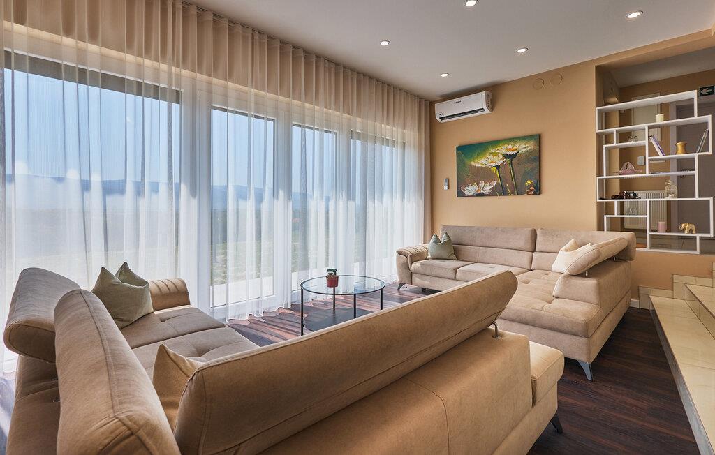 Indretningen af jeres feriehus i Modrovec nær Gornja Stubica er elegant og byder på en hyggelig opholdsstue med store vinduer, der lukker masser af dagslys ind. Gør jer det komfortabelt i den indbydende sofagruppe, eller tilbered lækre retter i det moderne køkken. Det tilstødende spisebord er perfekt til fælles måltider med familien og venner. Afslut dagen i husets egen sauna og nyd nogle øjeblikke af ro og afslapning.