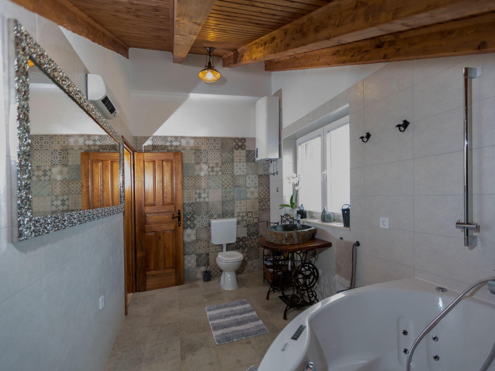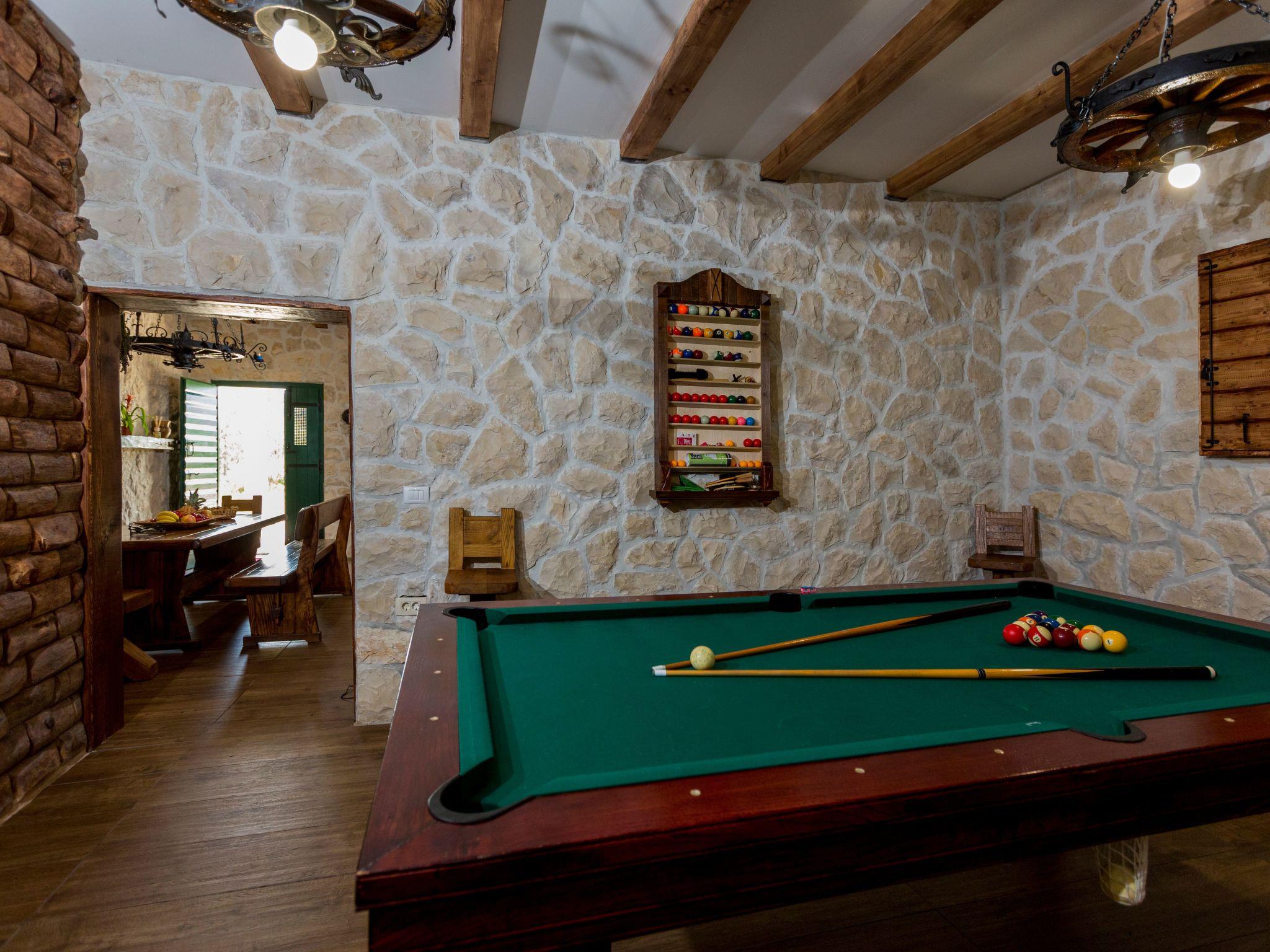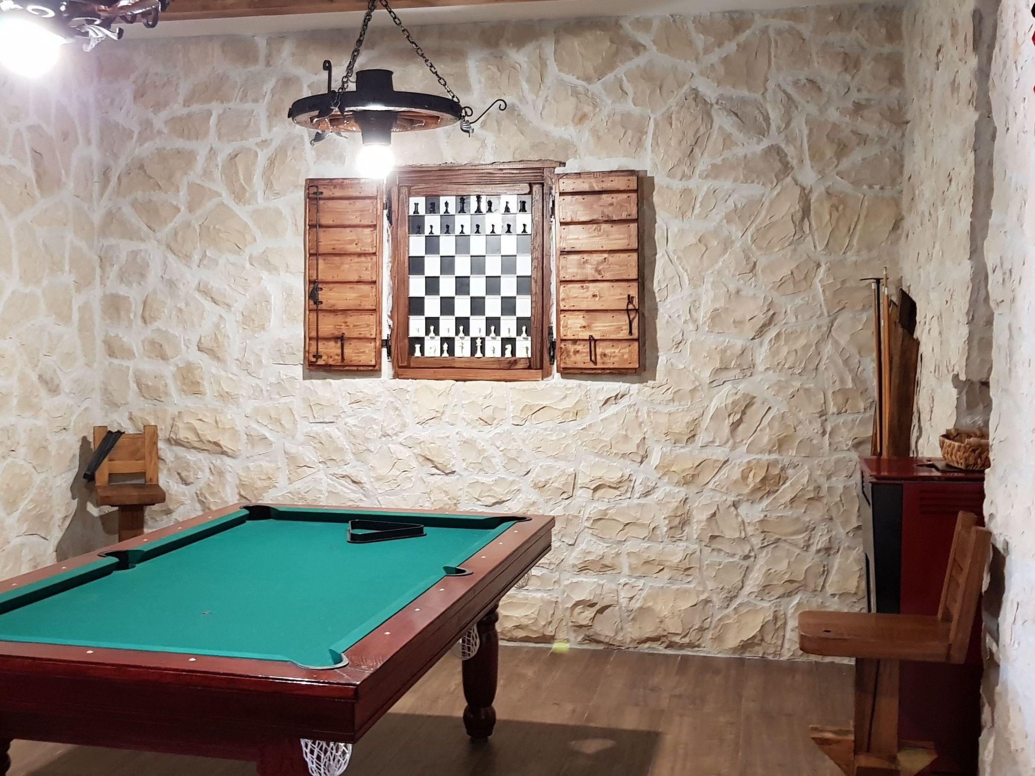 Villa was renovated in 2018. in traditional style. It has 240m2, on 3 floors with fully equipped kitchen, 5 bedrooms, 3 bathrooms, 2 living rooms (75m2 + 20m2) and balcony. Ground floor is 80 m2 large living /party room (konoba) with stone/wood material interior. Large billiard table, luxury seating furniture, large flat TV and audio system with karaoke + eating table set are offering great place for all day/night fun&party for guests. There is a toilet on this floor. On 1st floor there are: large new full equipped kitchen, 2 bedrooms, bathroom and living room. It has a fireplace for winter period and aircondition for summer. Large balcony (30 m2) offers a outside lounge seating set and large kitchen table so guests can have lunch on open space or just enjoy view on pool and environment around the house. On 2nd floor there are 3 large bedrooms and large bathroom with jacuzzi .