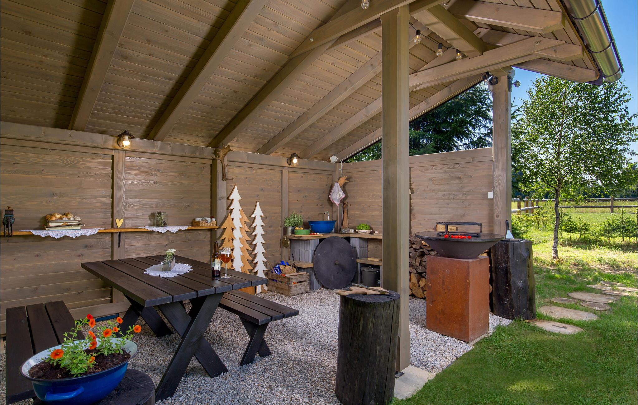 Indretningen er hyggelig og komfortabel, så I hurtigt vil føle jer hjemme. I kan slappe dejligt af i stuen, mens I ser fjernsyn, læser en god bog eller spiller kort. Der er også et spabad og en sauna til selvforkælelse, og aktive feriegæster kan spille volleyball og badminton. Tilbring hyggelige aftener sammen ved pejsen, mens I nyder udsigten over det frodige, grønne landskab. Børn kan lege på den store grund, og om aftenen kan I tænde op i grillen på terrassen og tilberede et lækkert feriemåltid.