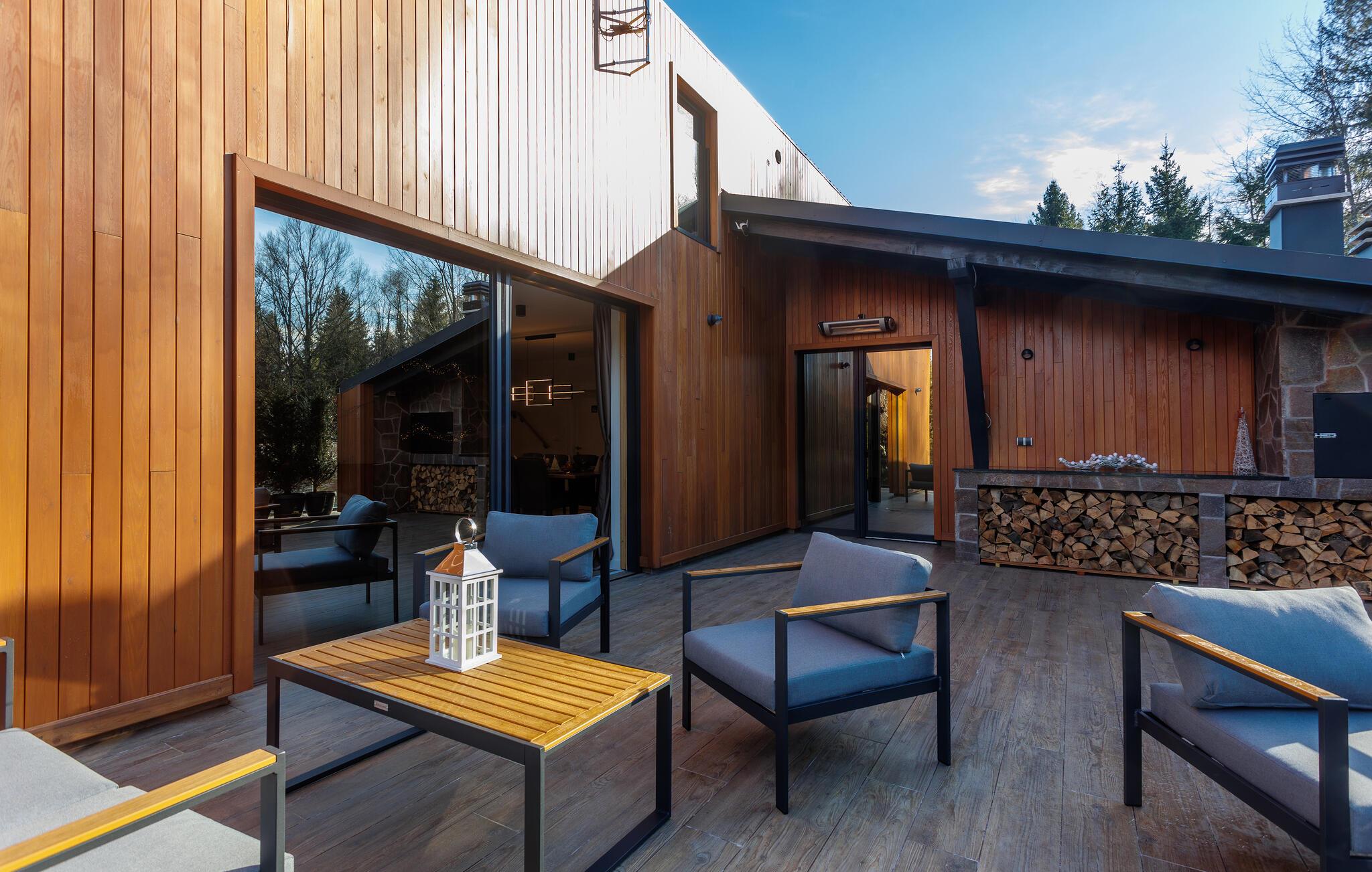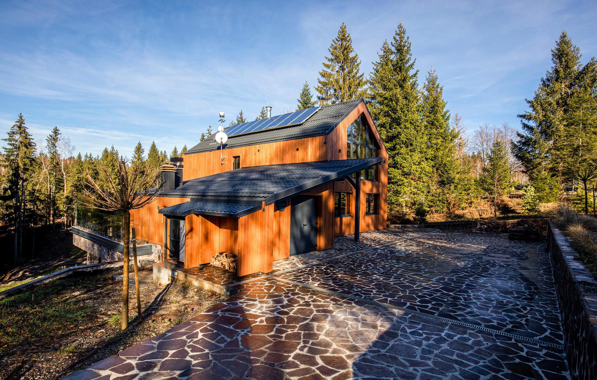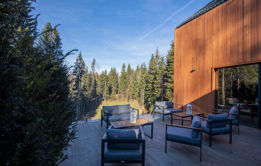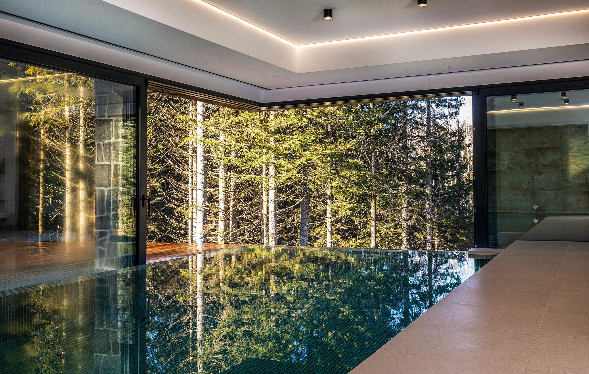 Den smukke pool, hvor I kan slappe af med udsigt over skoven, kan bruges både åbent og lukket. Efter en afslappende svømmetur kan I indånde den friske skovluft på terrassen og nyde den fredfyldte atmosfære.