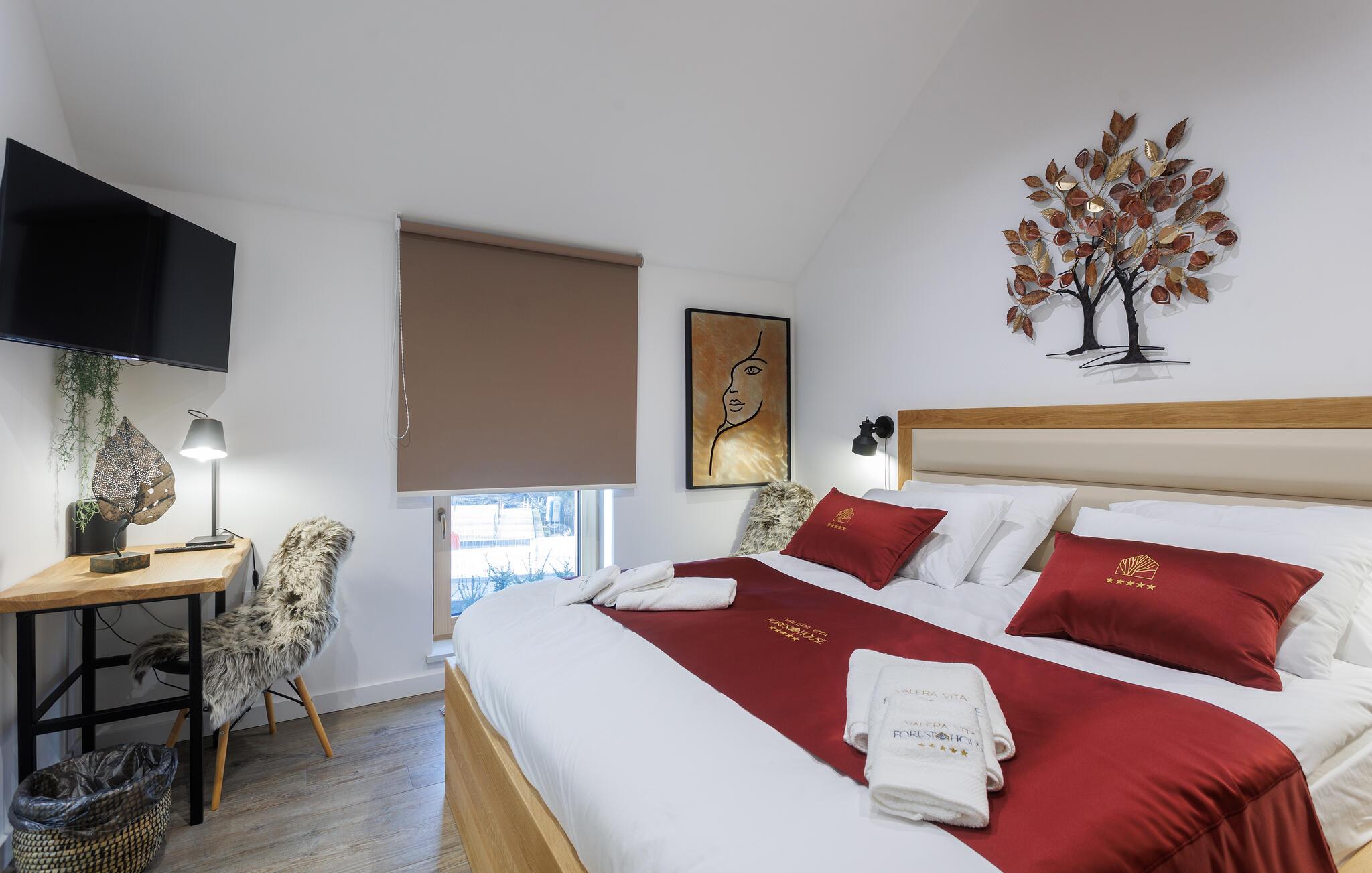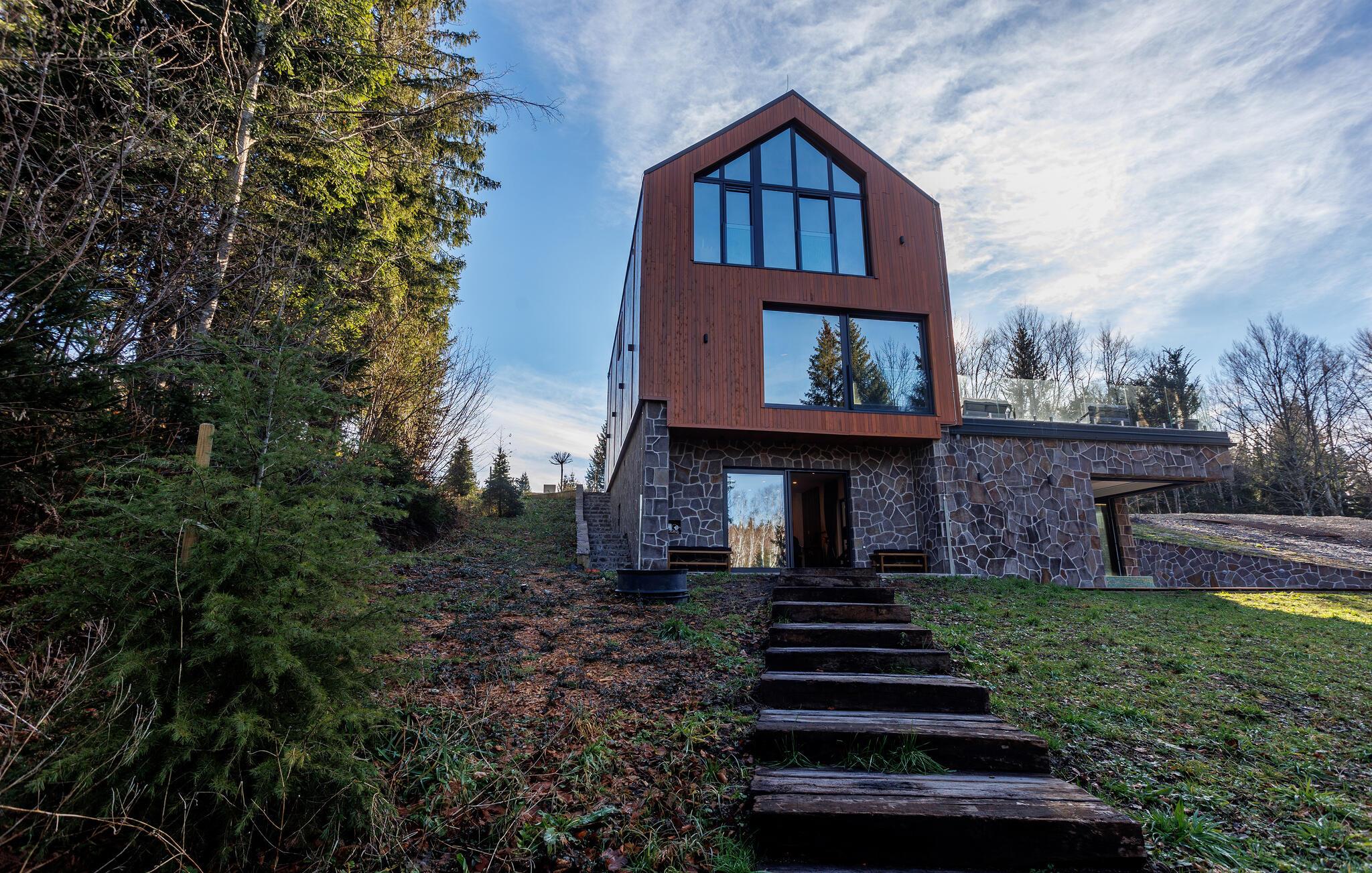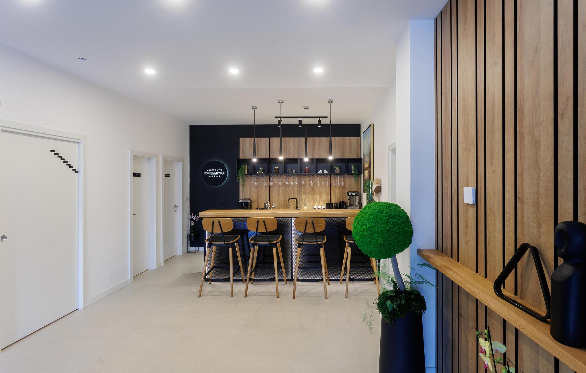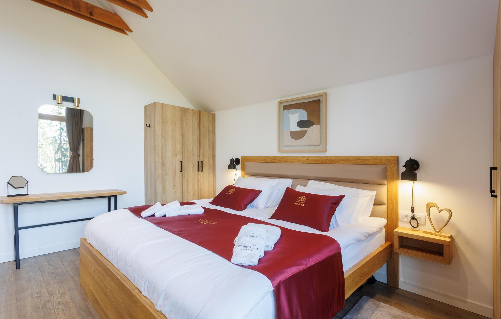 Den smukke pool, hvor I kan slappe af med udsigt over skoven, kan bruges både åbent og lukket. Efter en afslappende svømmetur kan I indånde den friske skovluft på terrassen og nyde den fredfyldte atmosfære.