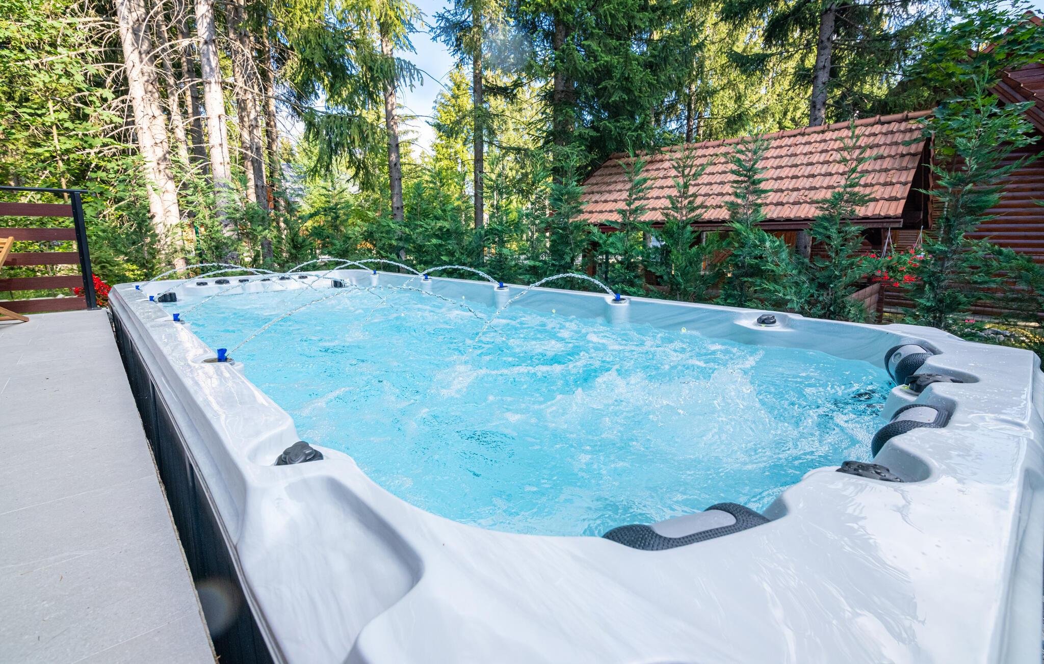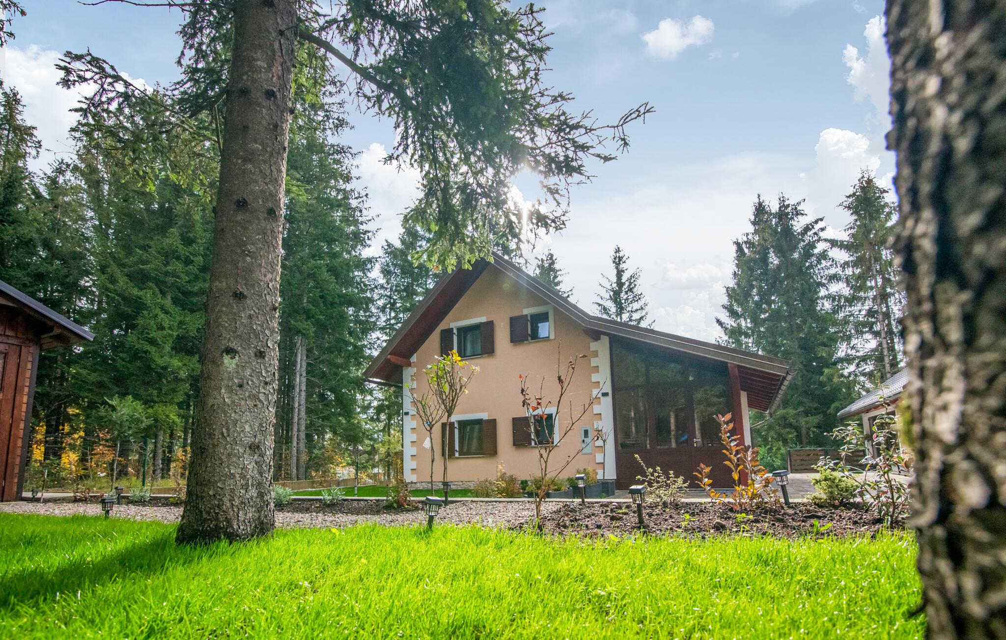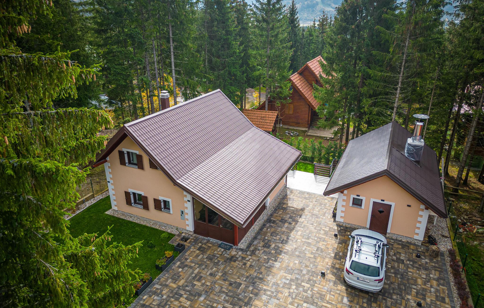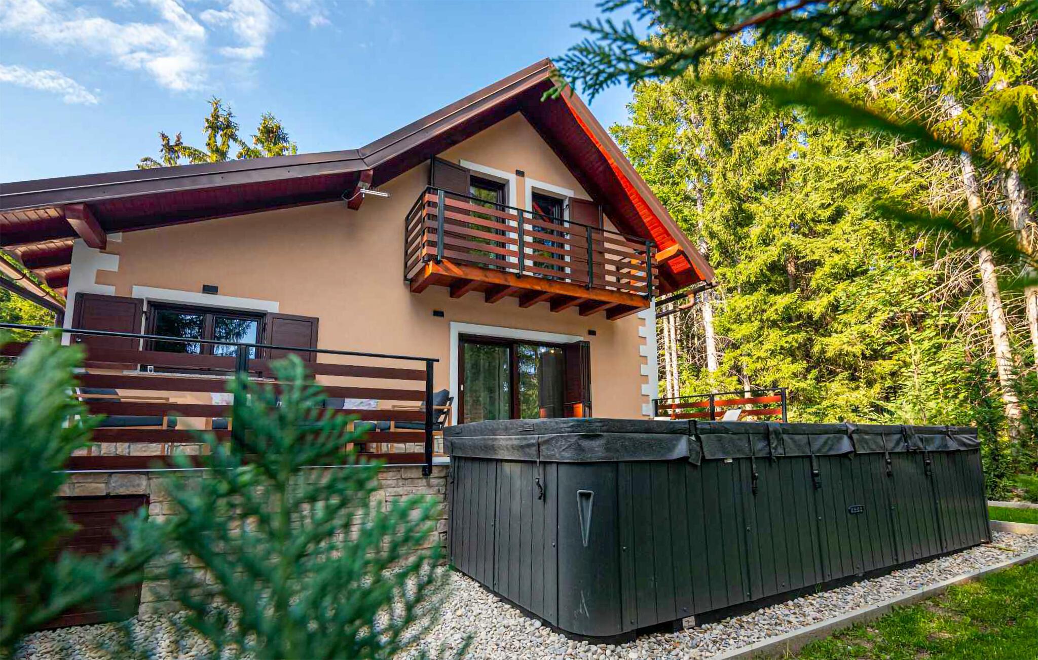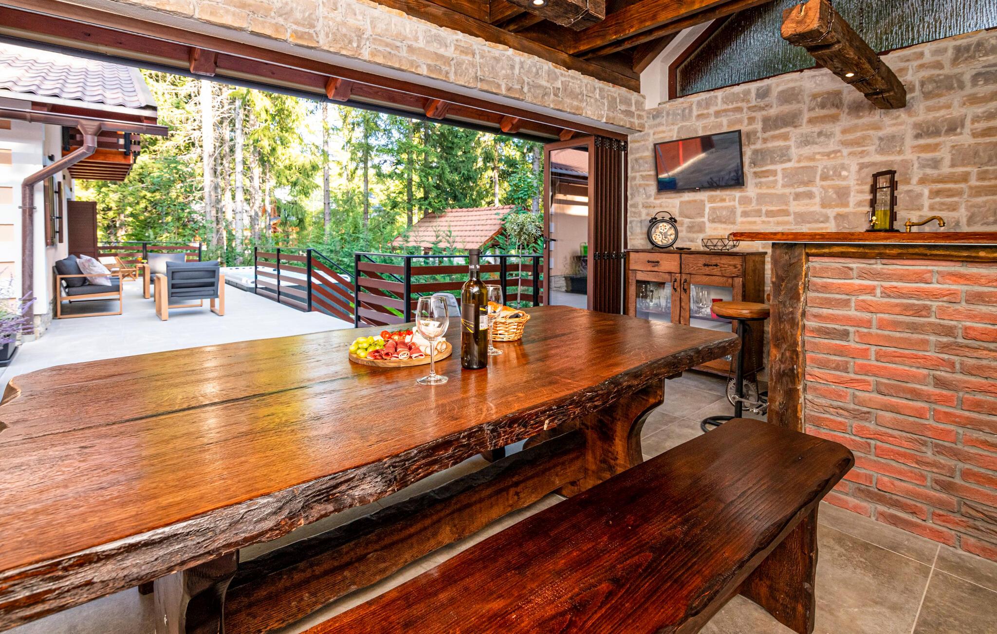 Omgivet af tårnhøje træer kombinerer dette hus på harmonisk vis rustik charme og komfort. Synlige træbjælker, natursten og træmøbler skaber en hyggelig atmosfære, hvor I hurtigt vil føle jer hjemme. Læn jer tilbage i spabadet, tilbring en filmaften på sofaen eller spil et spil dart.