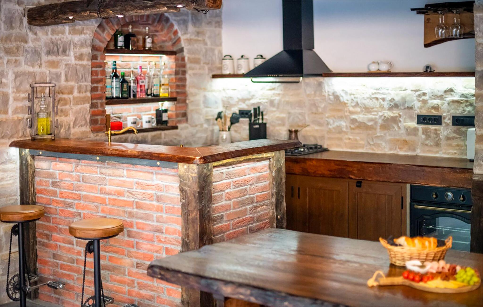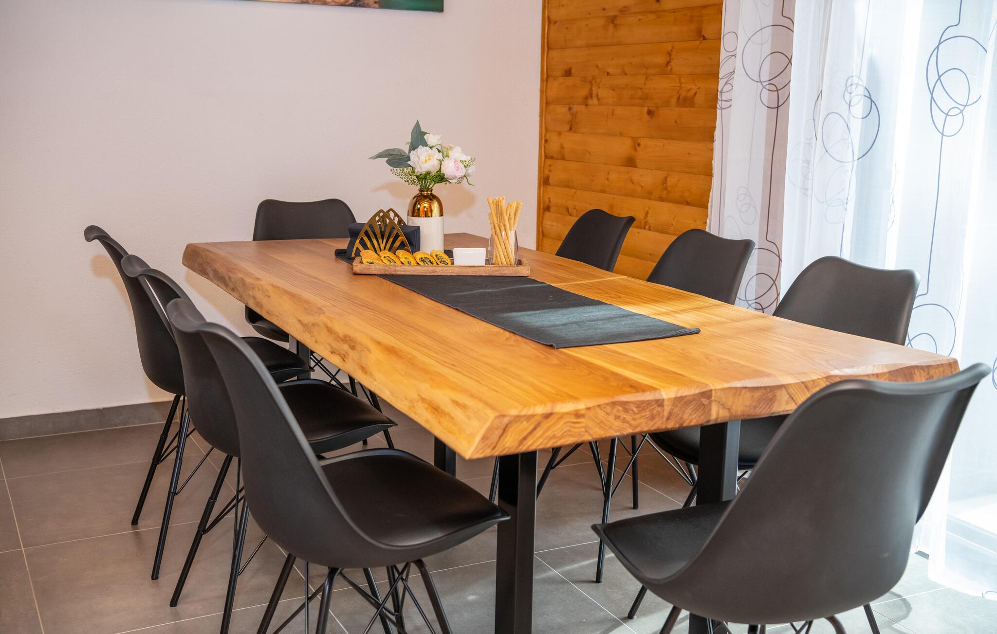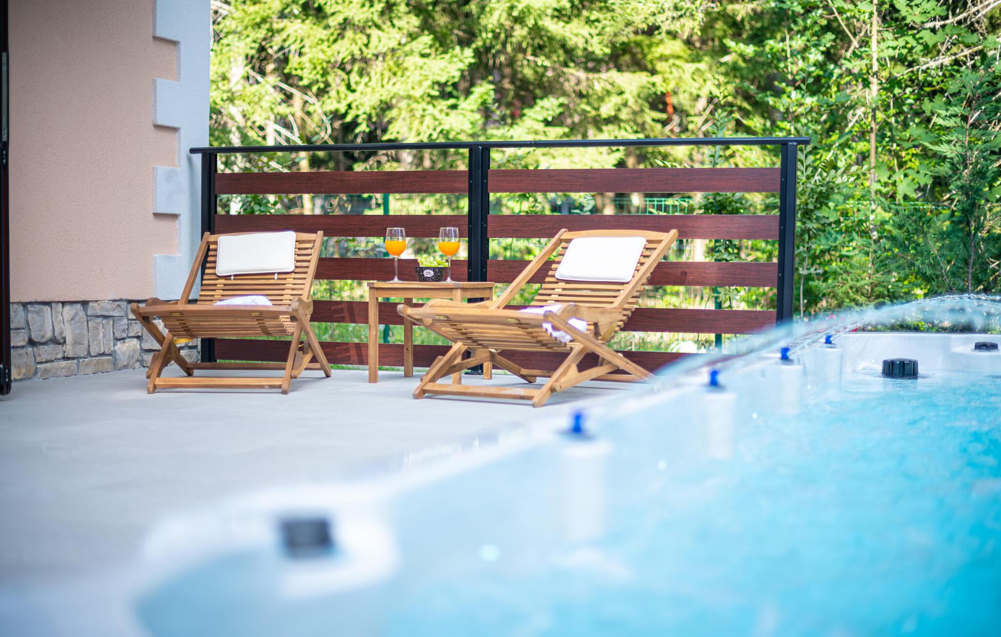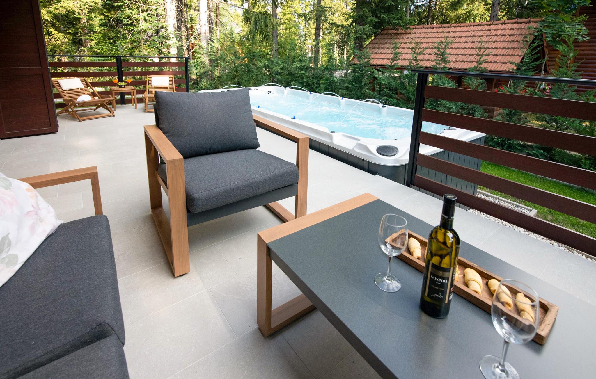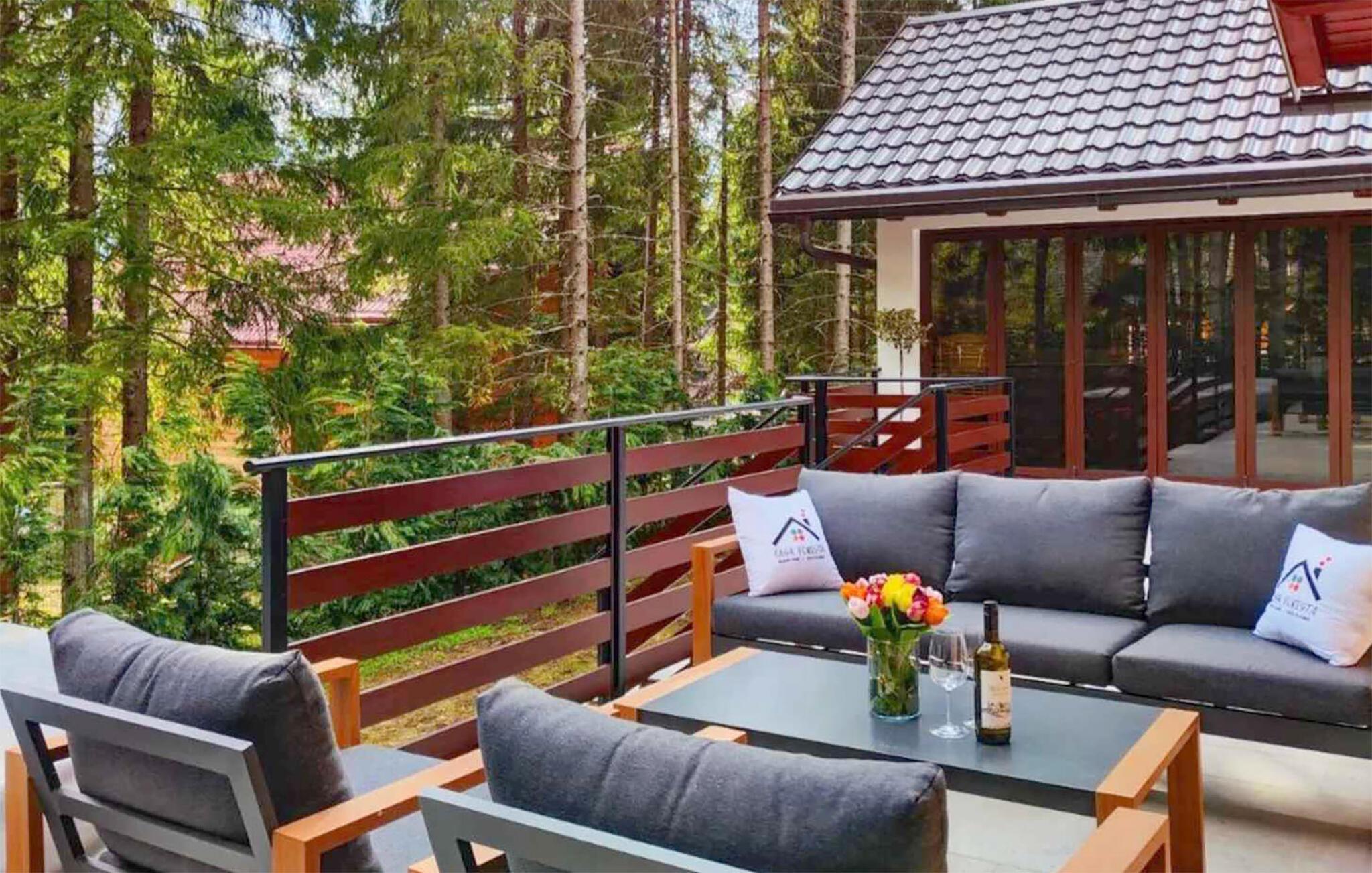 Omgivet af tårnhøje træer kombinerer dette hus på harmonisk vis rustik charme og komfort. Synlige træbjælker, natursten og træmøbler skaber en hyggelig atmosfære, hvor I hurtigt vil føle jer hjemme. Læn jer tilbage i spabadet, tilbring en filmaften på sofaen eller spil et spil dart.