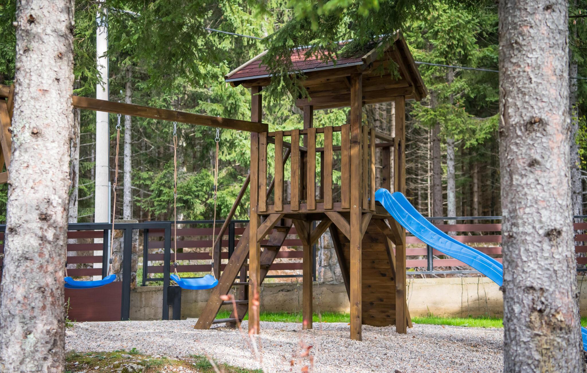 Gå udenfor om morgenen med en frisk kop kaffe og nyd naturens ro. Poolen lægger op til at tage en dukkert eller spille vandpolo når som helst. Tilbring afslappende timer på terrassen med at snakke eller fordybe jer i en god bog. I mellemtiden kan børnene klatre, rutsje og gynge i legehuset.