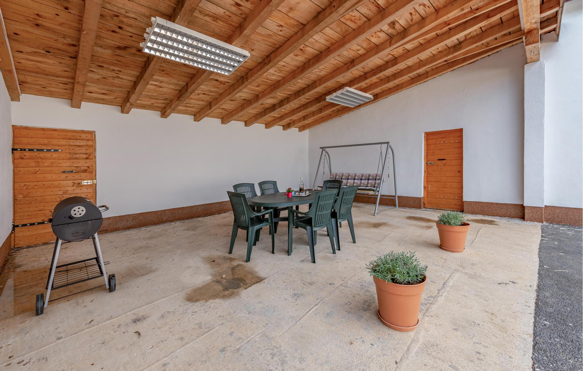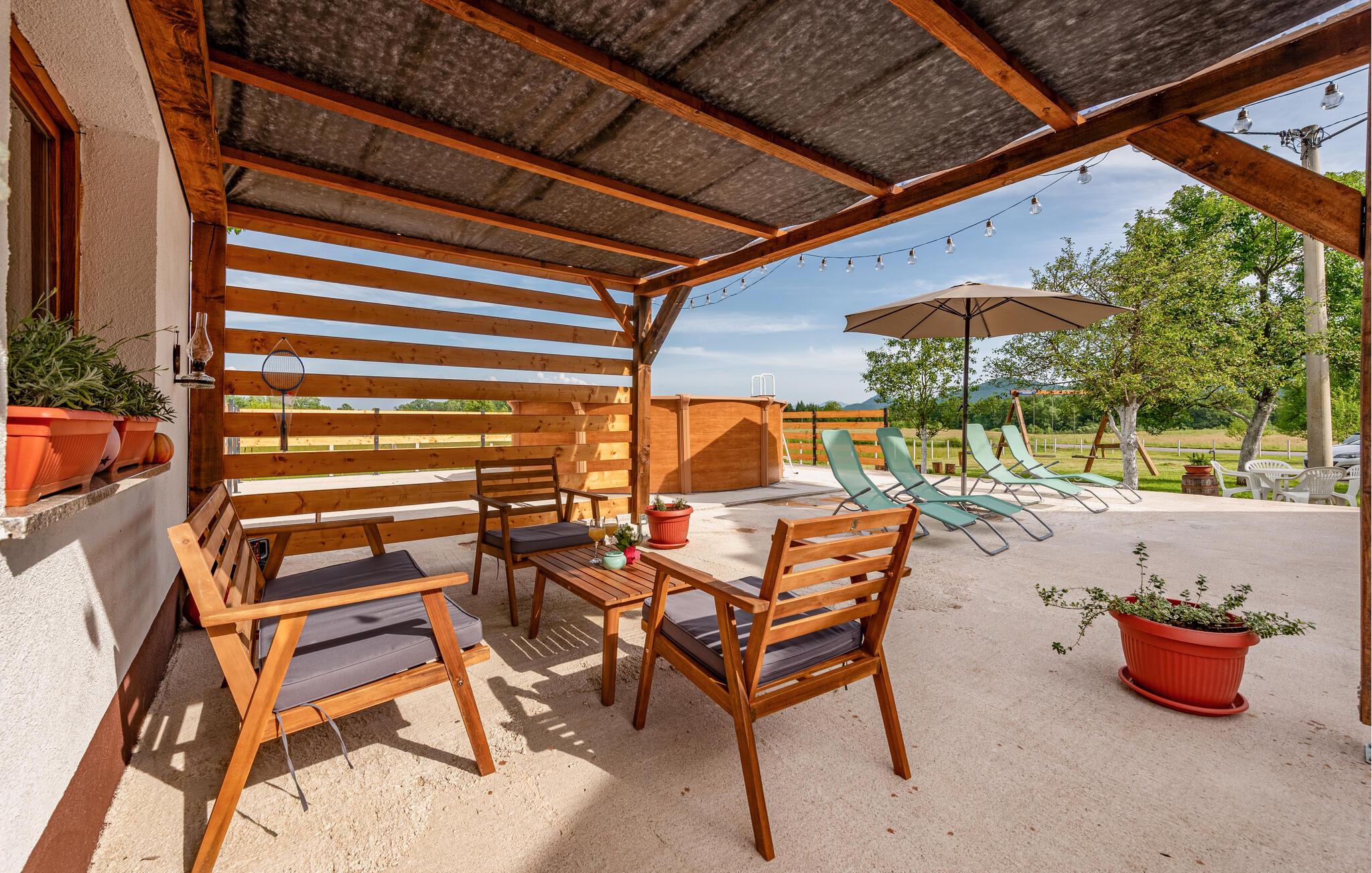 Der er to rummelige terrasseområder udenfor, hvor I kan nyde solen på de varme dage. Og dem er der mange af her! Se frem til mange afslappende timer i den smukt anlagte have med pool, nyd den grønne idyl og slap af, mens I lægger planer for de kommende dage.
