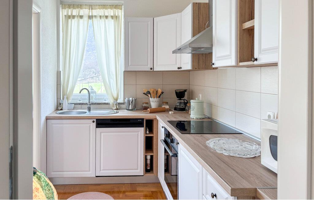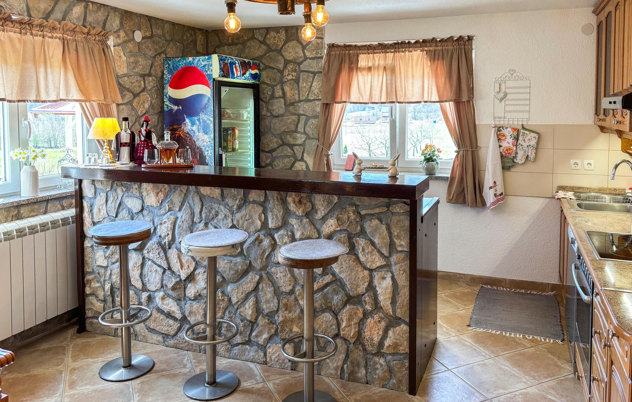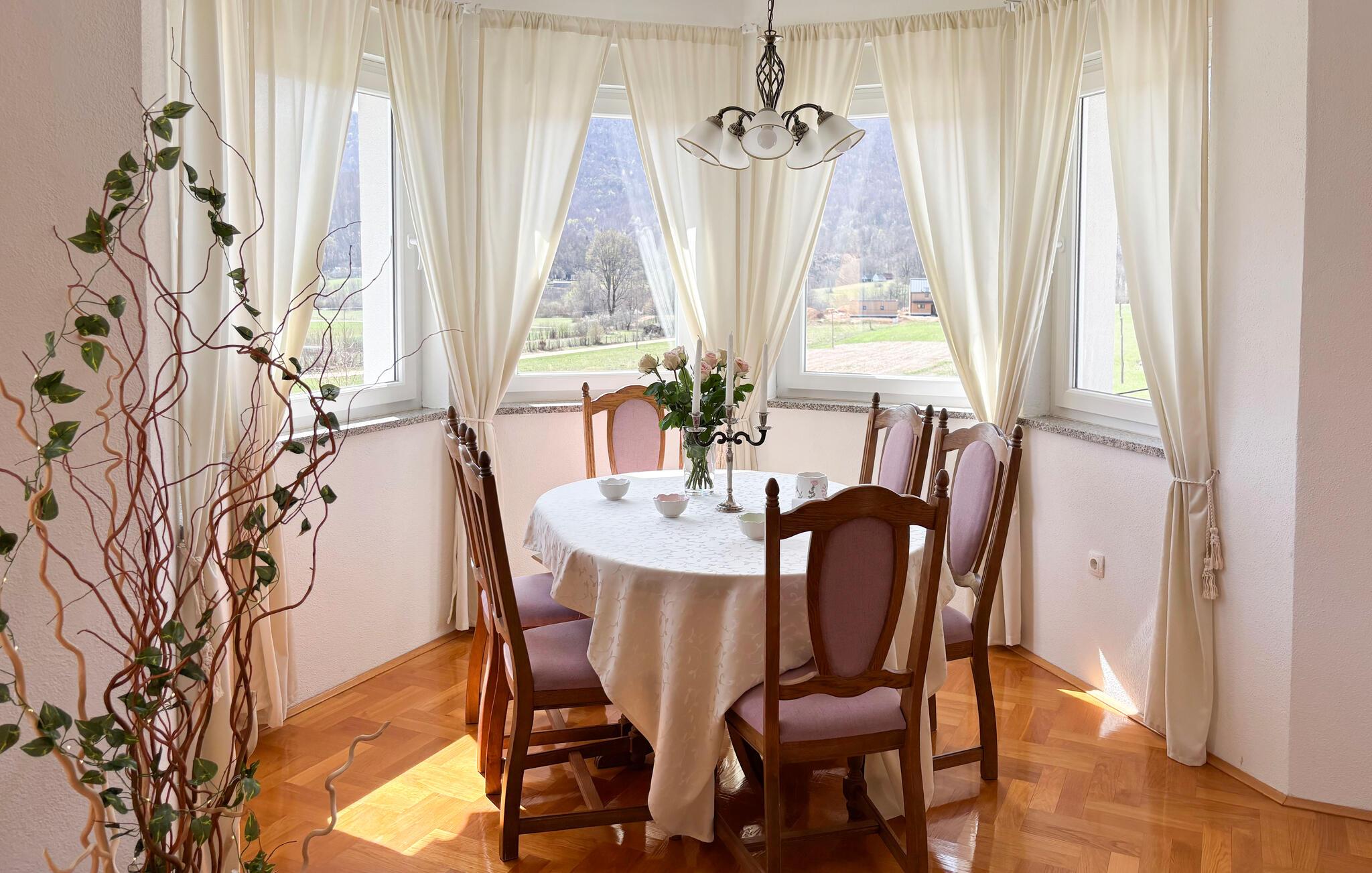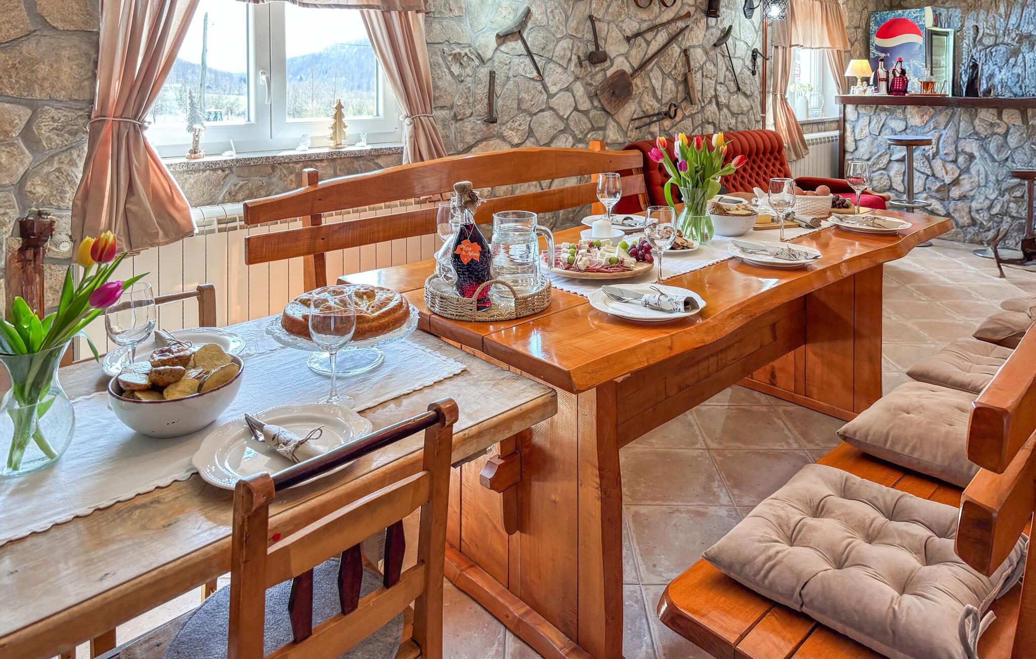 Nyd det hyggelige interiør med klassiske møbler og smukke træelementer. Tag plads i stuen med brændeovn, eller saml jer omkring det store spisebord i en rustik atmosfære. Køkkenet er funktionelt udstyret og har alt, hvad du skal bruge til fælles måltider. Lyse rum og store vinduer skaber en behagelig, afslappet atmosfære for dit ophold.