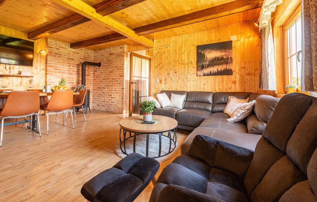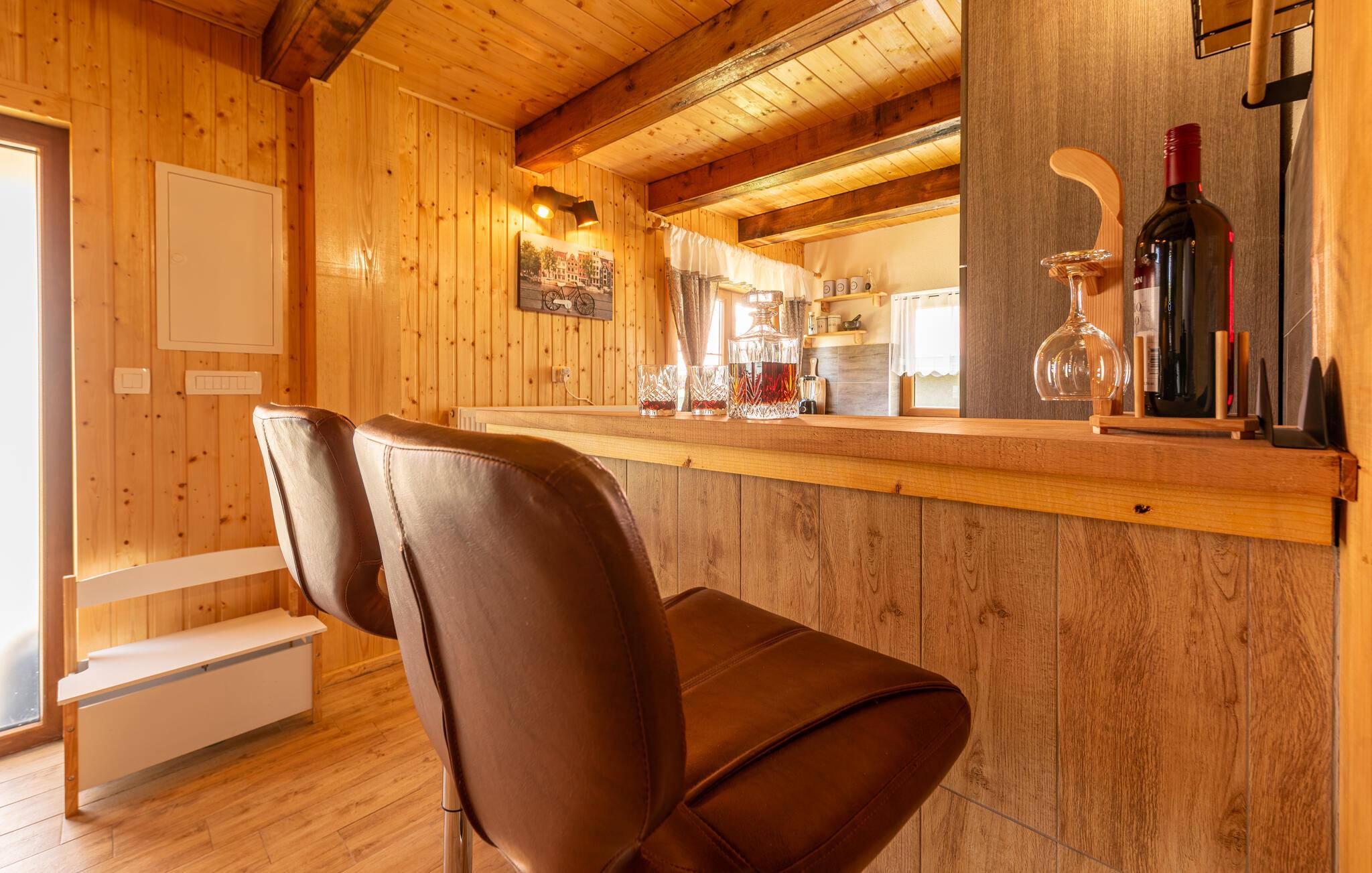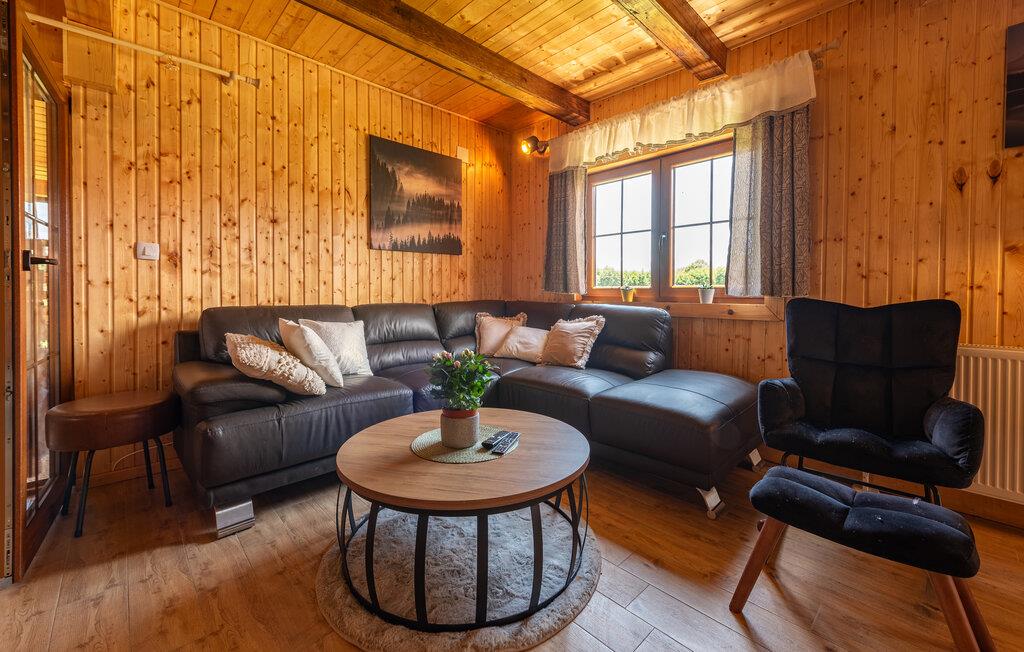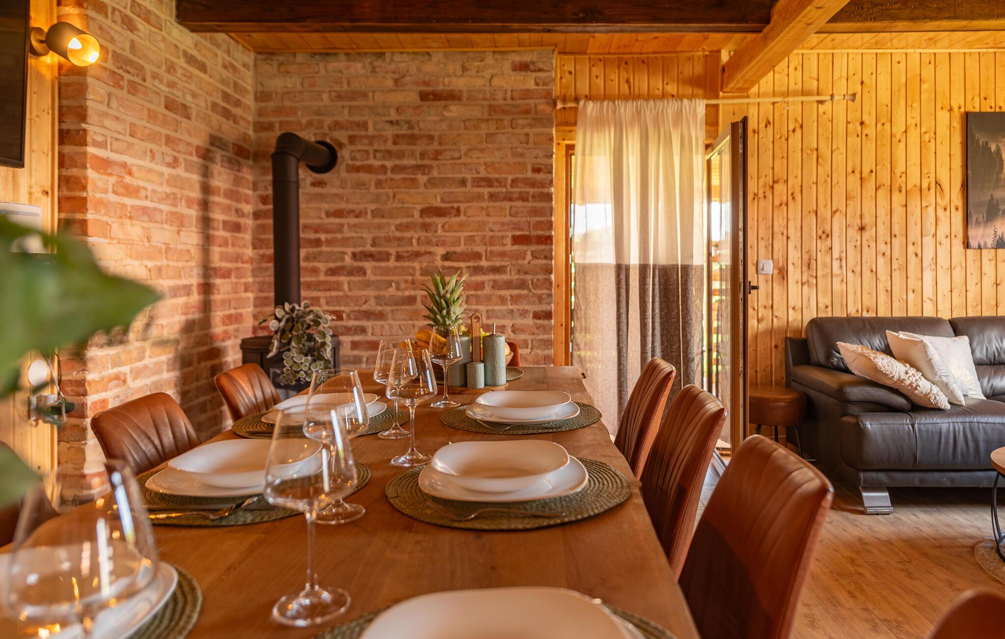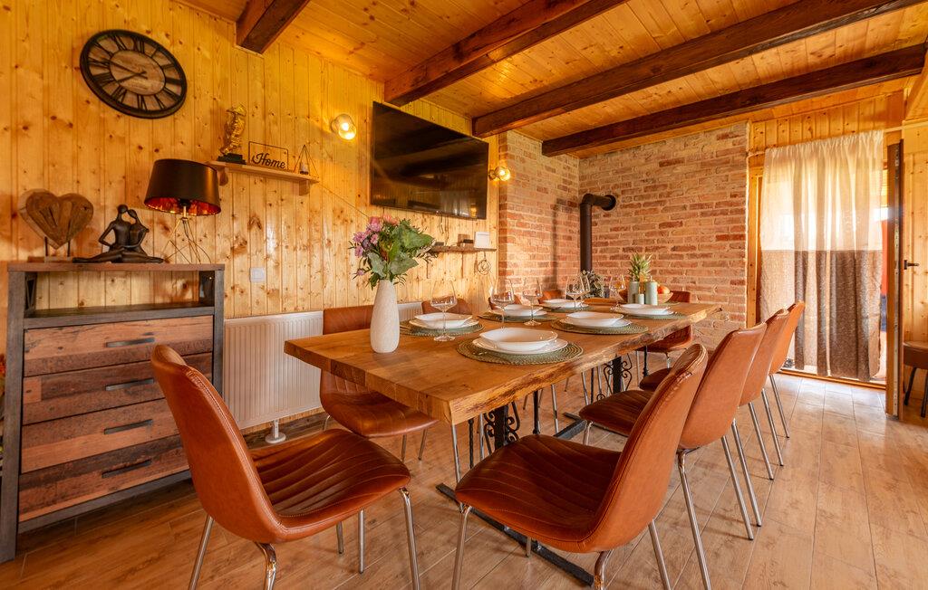 Dette fine detaljerede træhus venter på jer, gemt i det idylliske kroatiske landskab. Med moderne design, stilfulde værelser og smagfuld indretning er det det perfekte tilflugtssted. Den hyggelige stue med pejs lægger op til afslappende aftener, mens det veludstyrede køkken er ideelt til madlavningsaftener sammen.