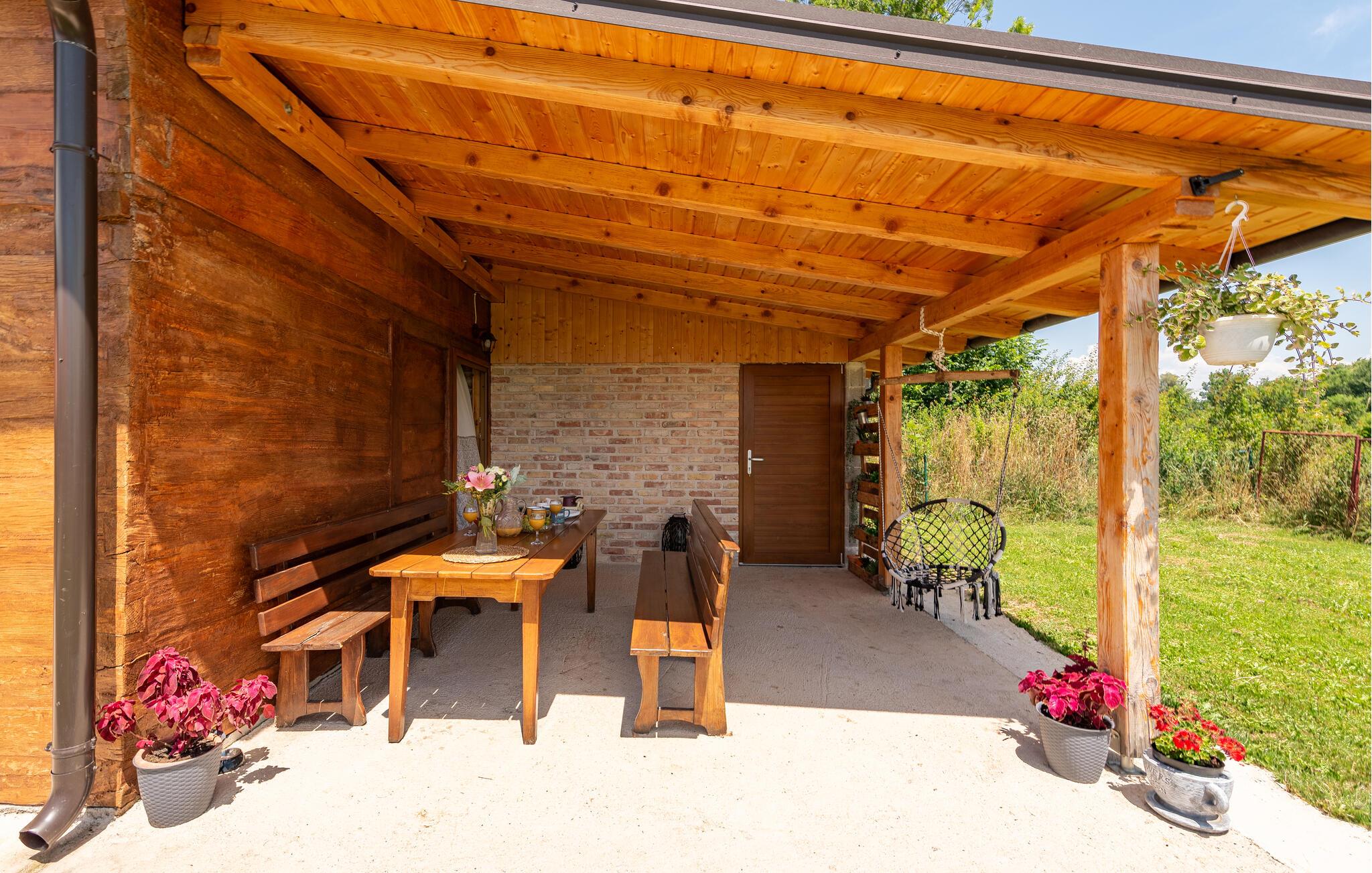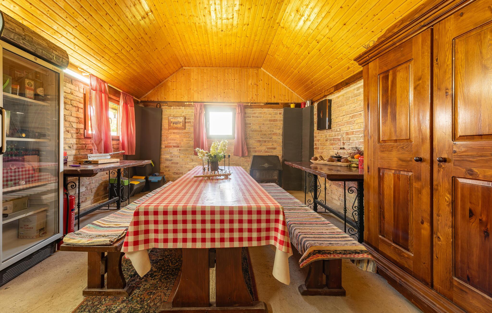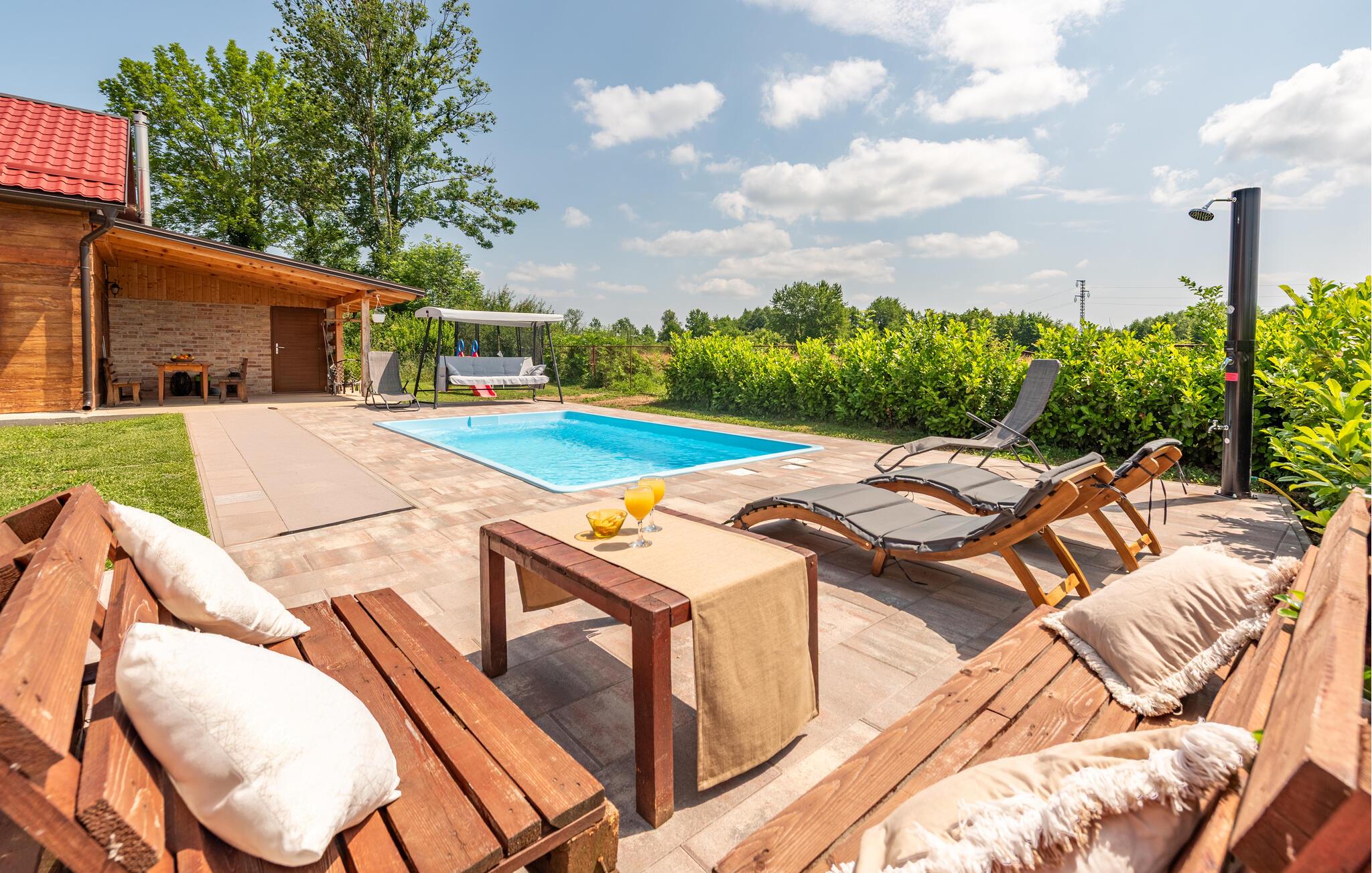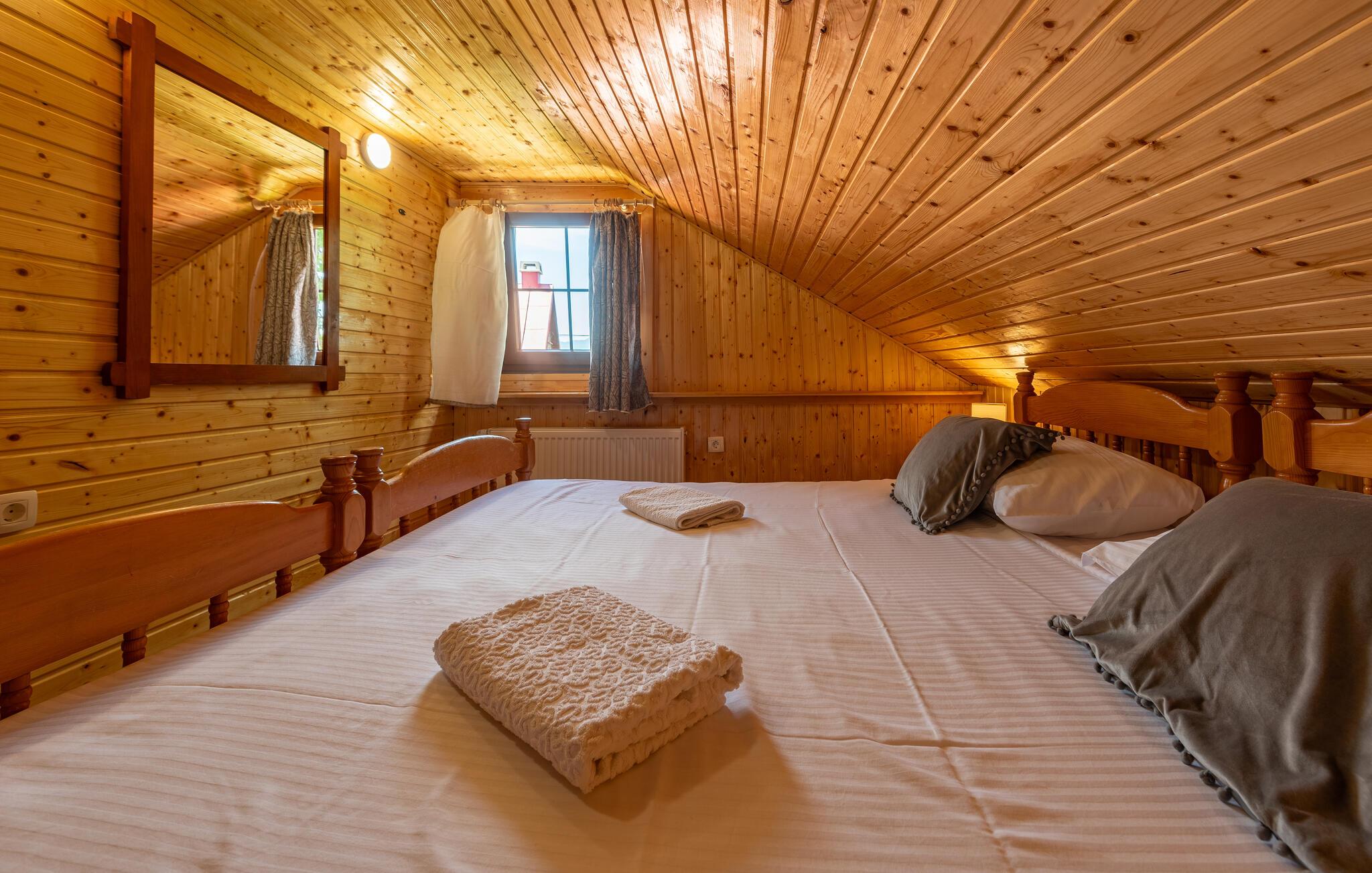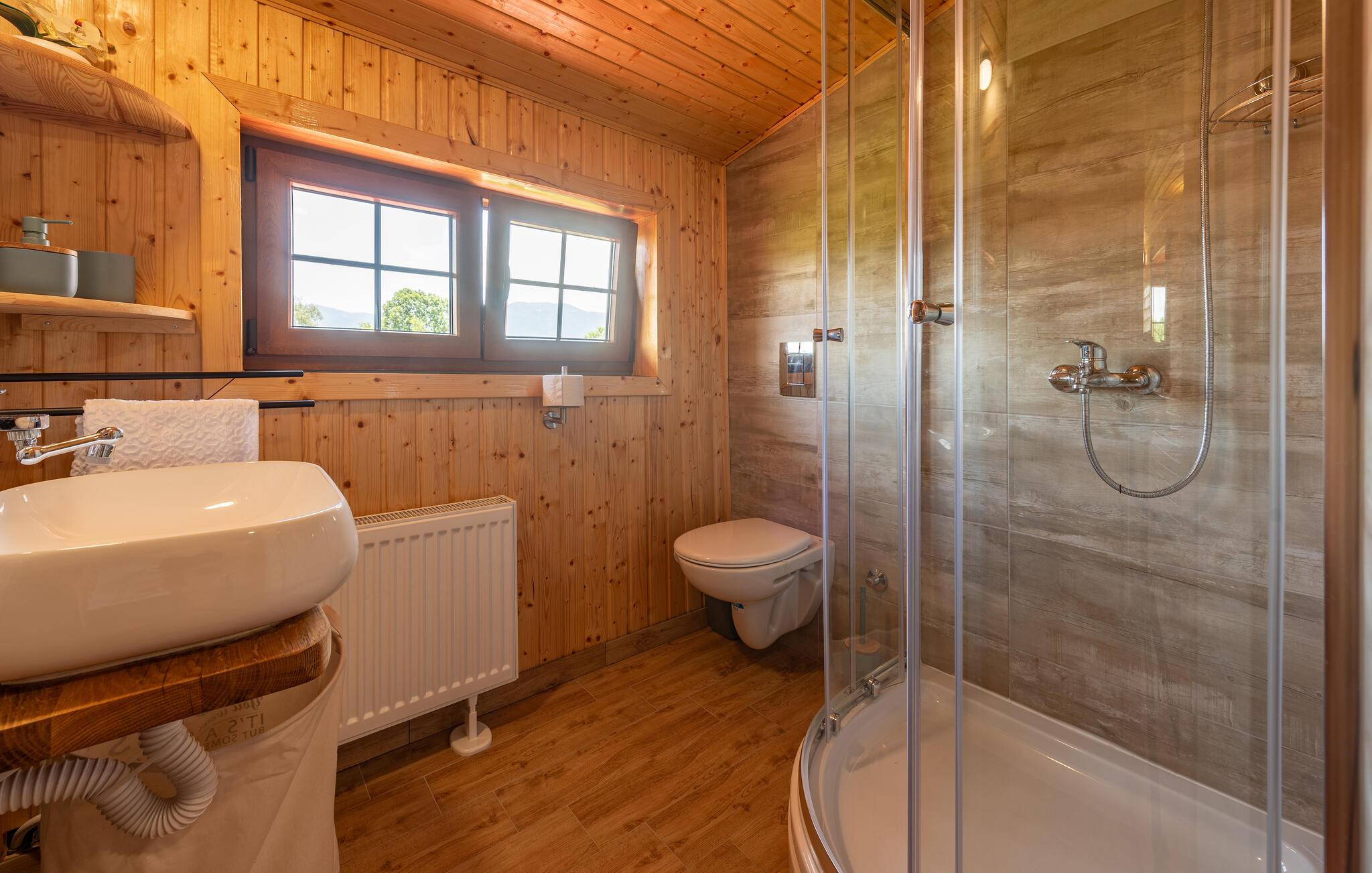 Dette fine detaljerede træhus venter på jer, gemt i det idylliske kroatiske landskab. Med moderne design, stilfulde værelser og smagfuld indretning er det det perfekte tilflugtssted. Den hyggelige stue med pejs lægger op til afslappende aftener, mens det veludstyrede køkken er ideelt til madlavningsaftener sammen.