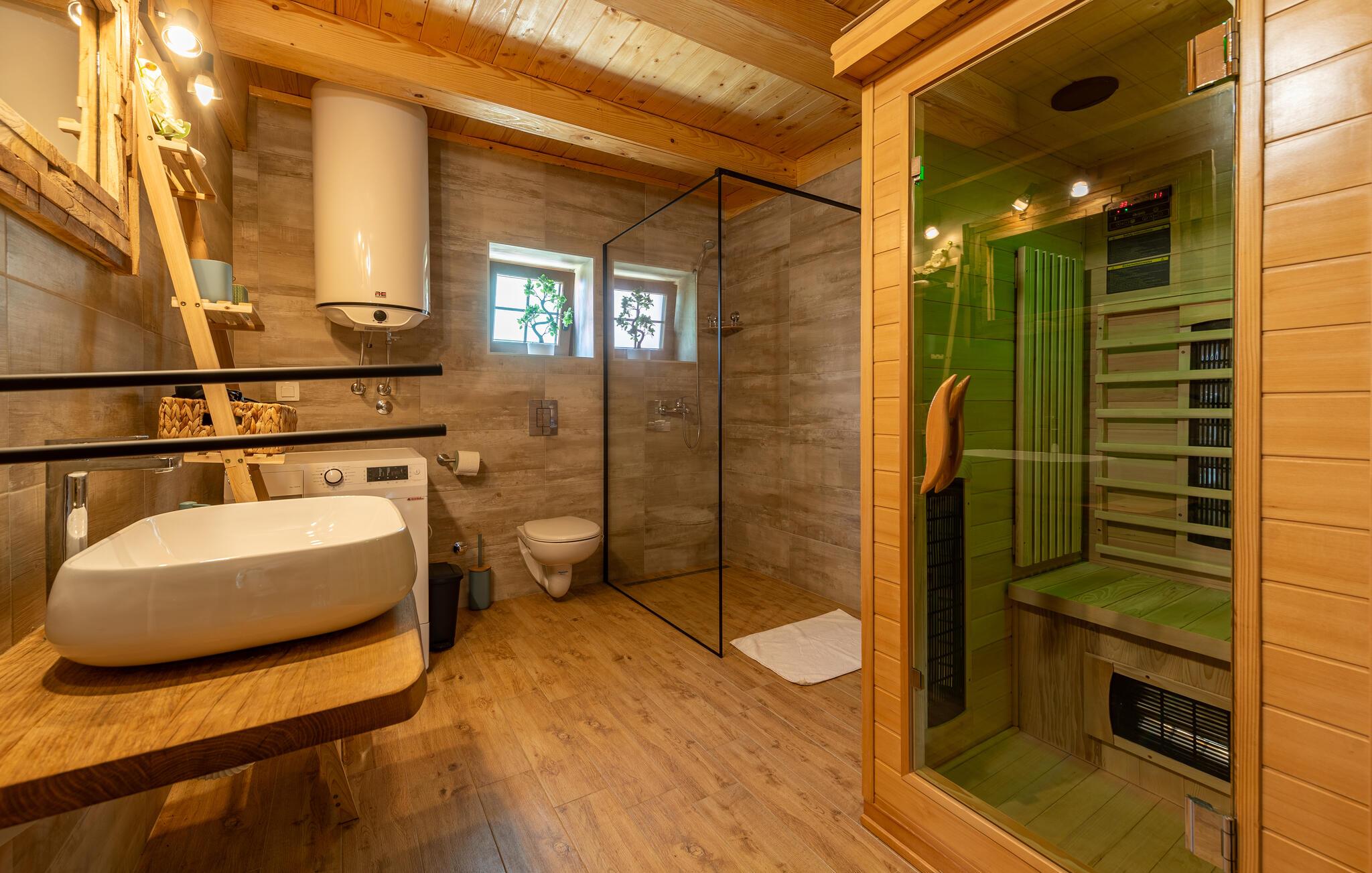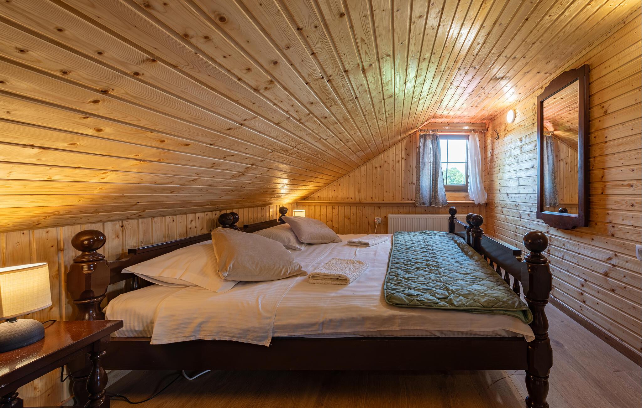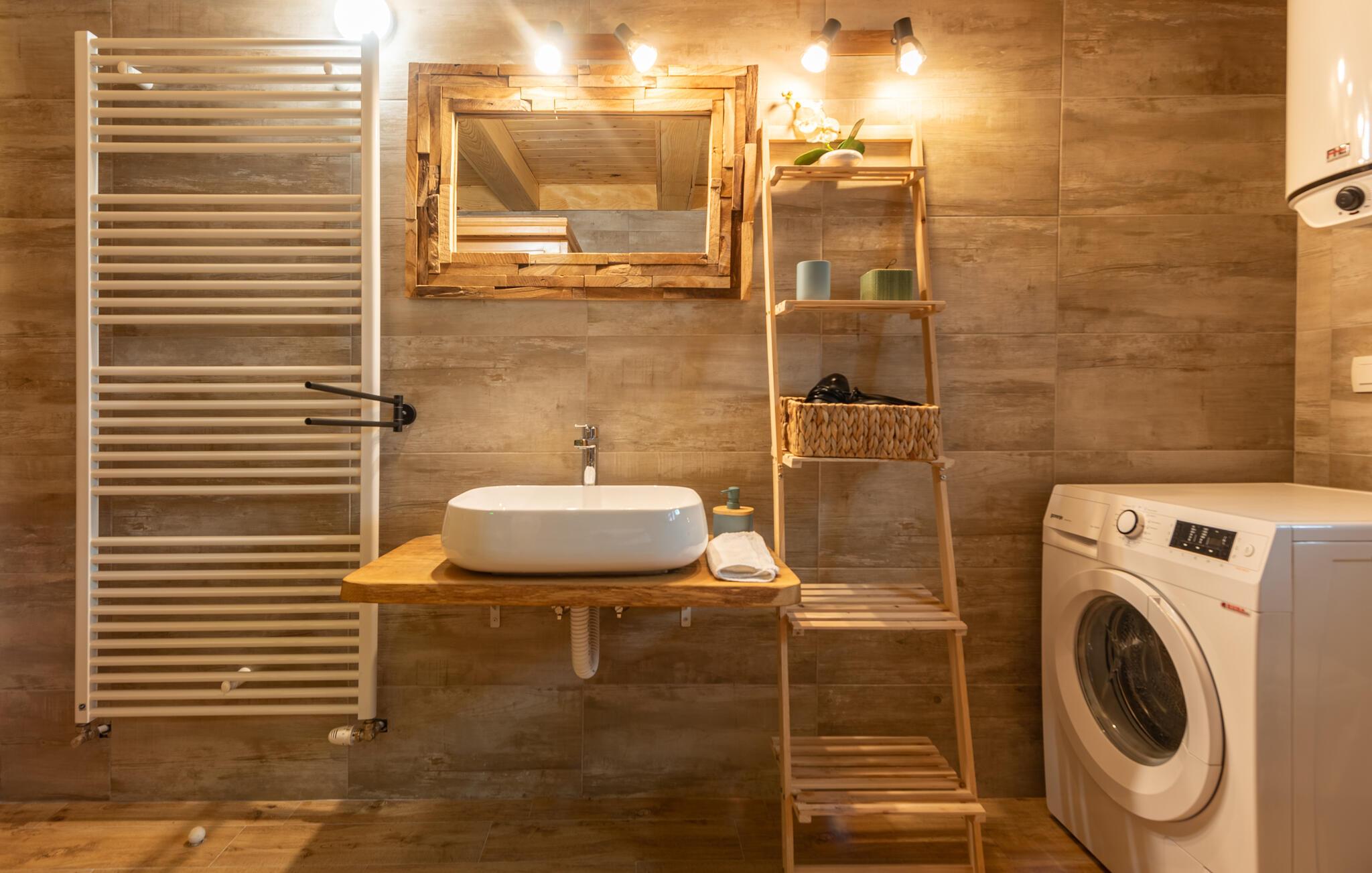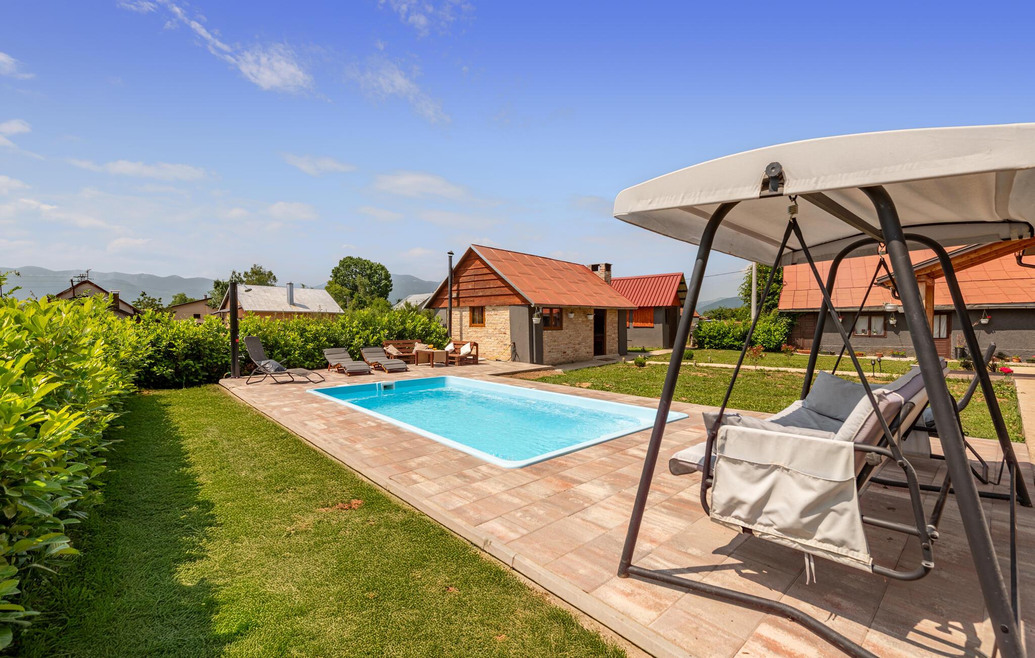 Dette fine detaljerede træhus venter på jer, gemt i det idylliske kroatiske landskab. Med moderne design, stilfulde værelser og smagfuld indretning er det det perfekte tilflugtssted. Den hyggelige stue med pejs lægger op til afslappende aftener, mens det veludstyrede køkken er ideelt til madlavningsaftener sammen.
