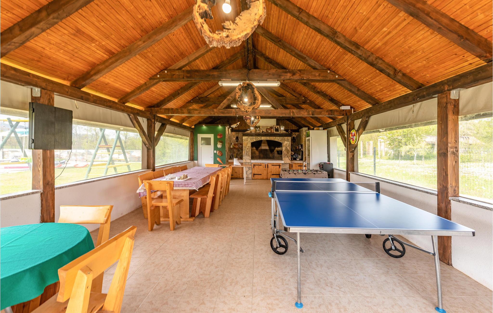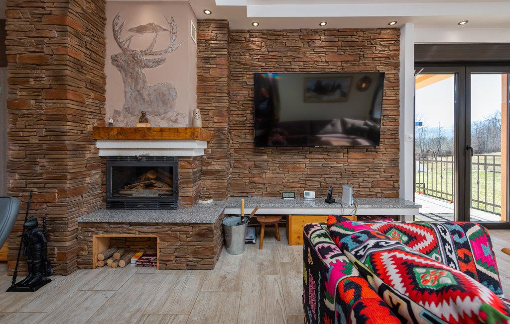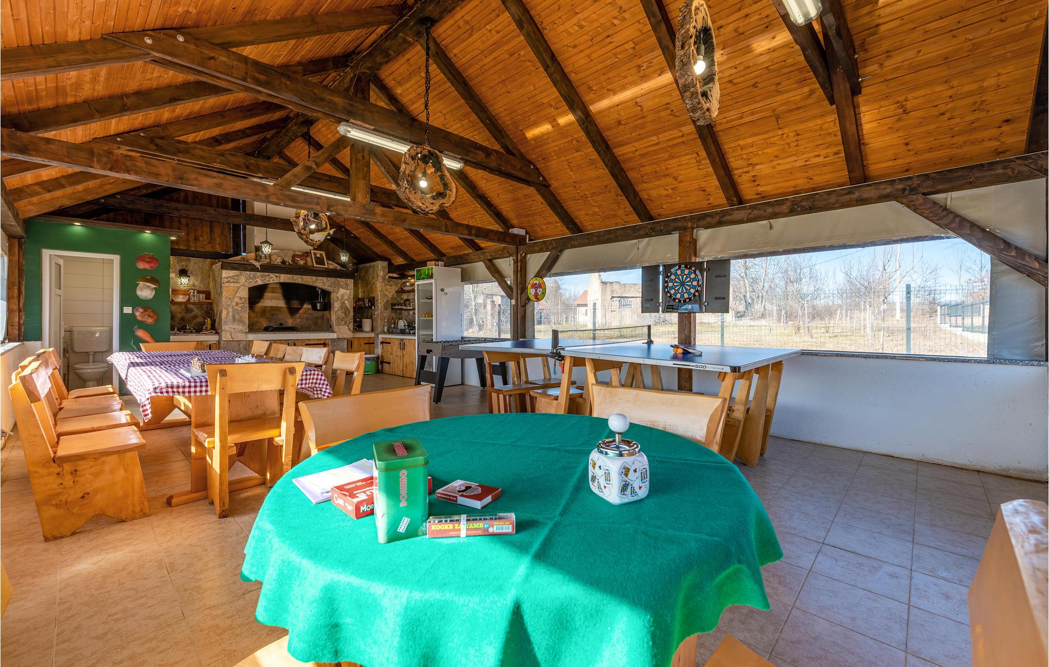 På ferie i dette feriehus vil I ikke mangle hverken underholdning eller den nødvendige komfort til en afslappende pause. Med sin smagfulde indretning i stil med et landsted med moderne møbler og nogle rustikke elementer, inviterer det jer til at slappe af her i tiltalende omgivelser. Om aftenen, efter en sprudlende leg ved bordfodboldbordet, kan I føle jer godt tilpas sammen ved pejsen, som skaber en hyggelig atmosfære med sin stille knitrende og hyggelige varme.