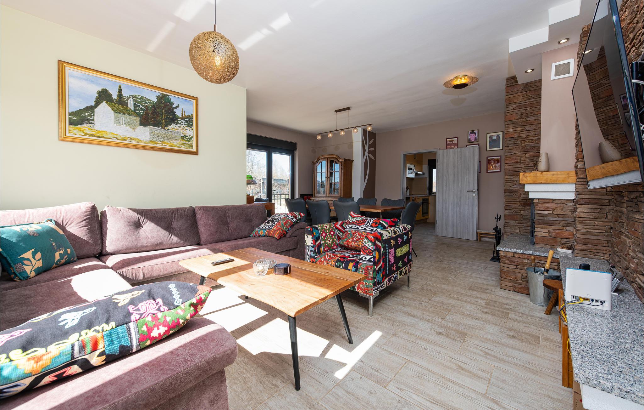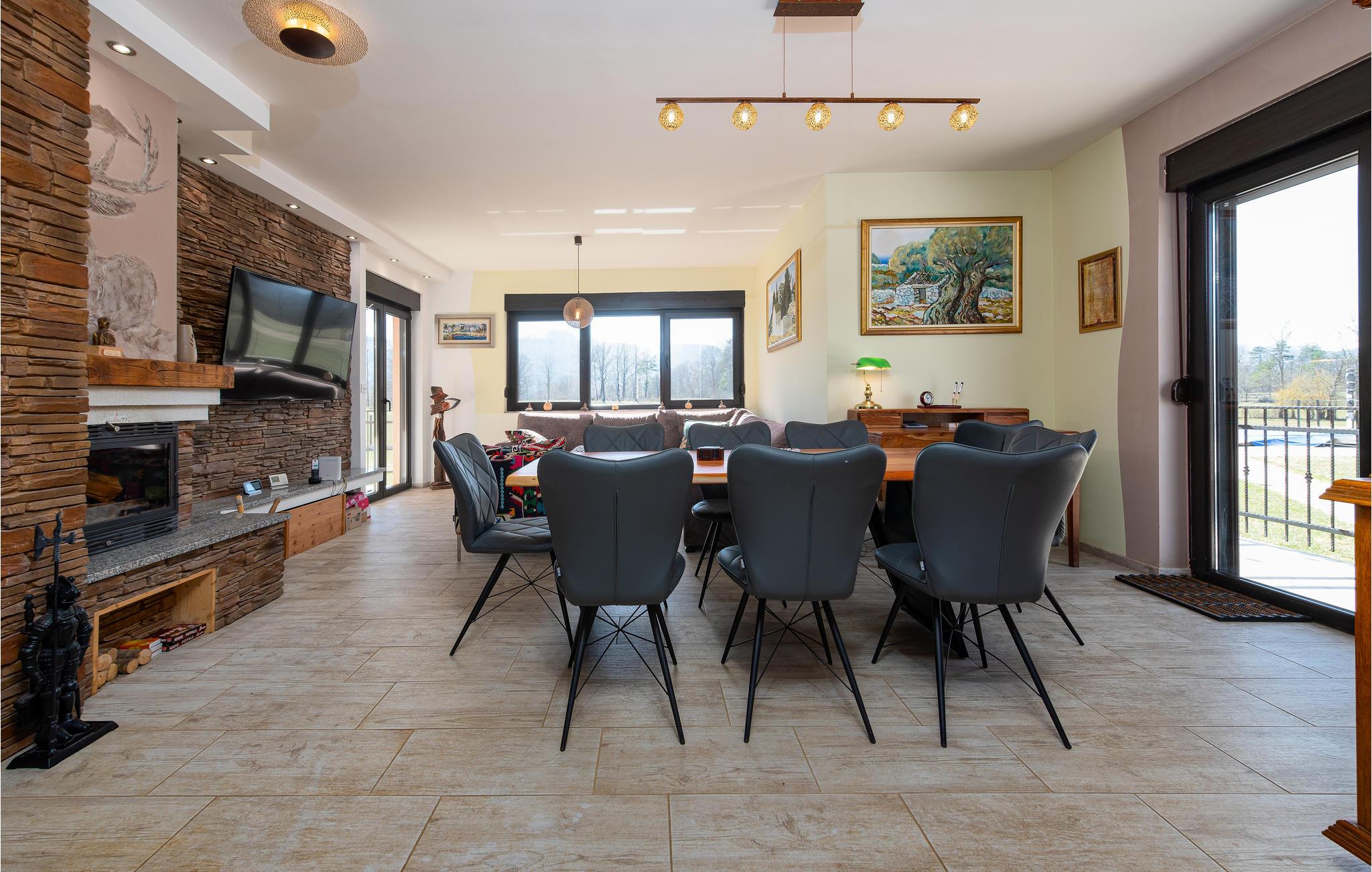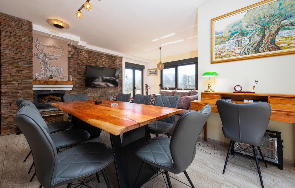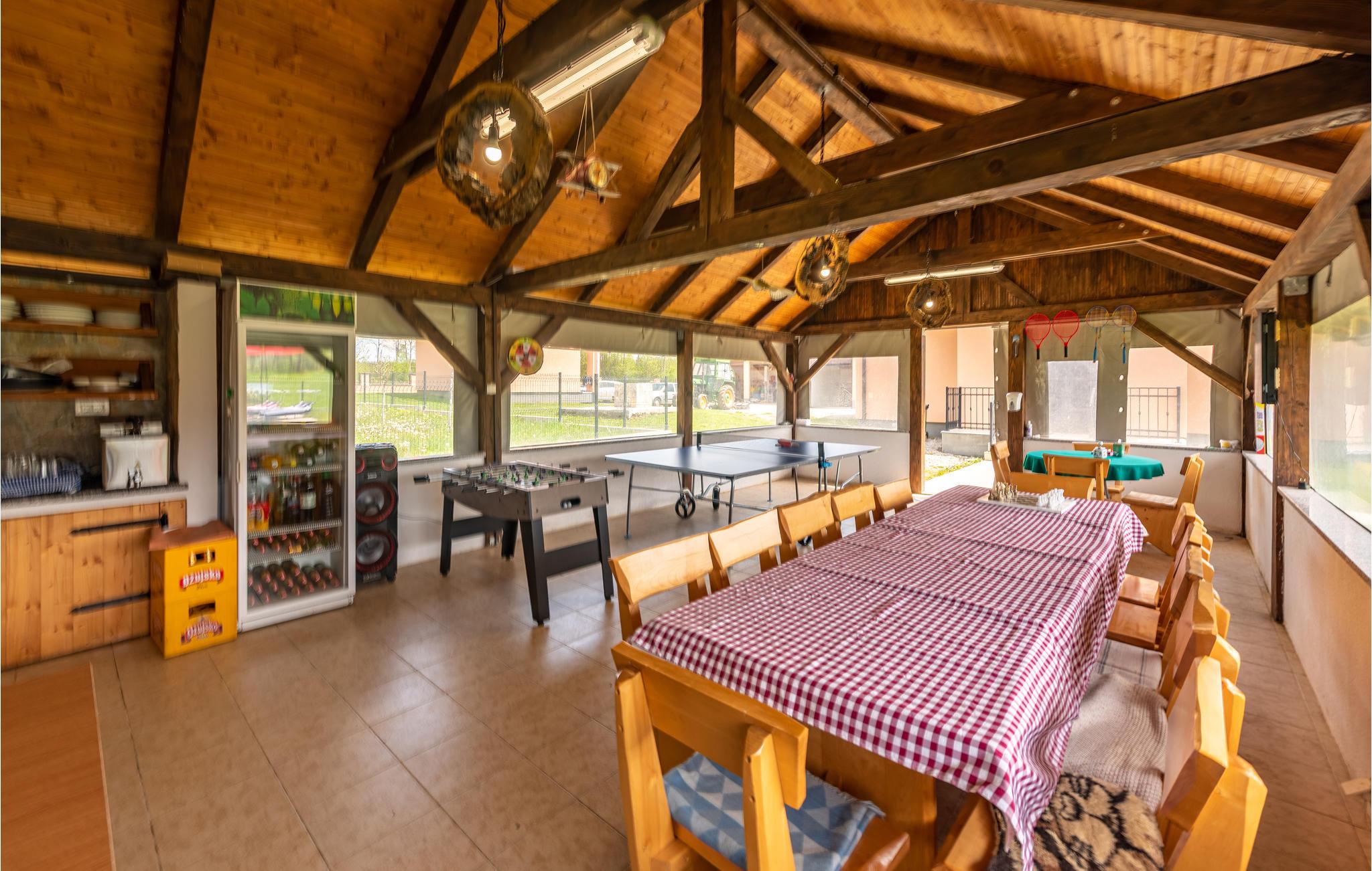 På ferie i dette feriehus vil I ikke mangle hverken underholdning eller den nødvendige komfort til en afslappende pause. Med sin smagfulde indretning i stil med et landsted med moderne møbler og nogle rustikke elementer, inviterer det jer til at slappe af her i tiltalende omgivelser. Om aftenen, efter en sprudlende leg ved bordfodboldbordet, kan I føle jer godt tilpas sammen ved pejsen, som skaber en hyggelig atmosfære med sin stille knitrende og hyggelige varme.