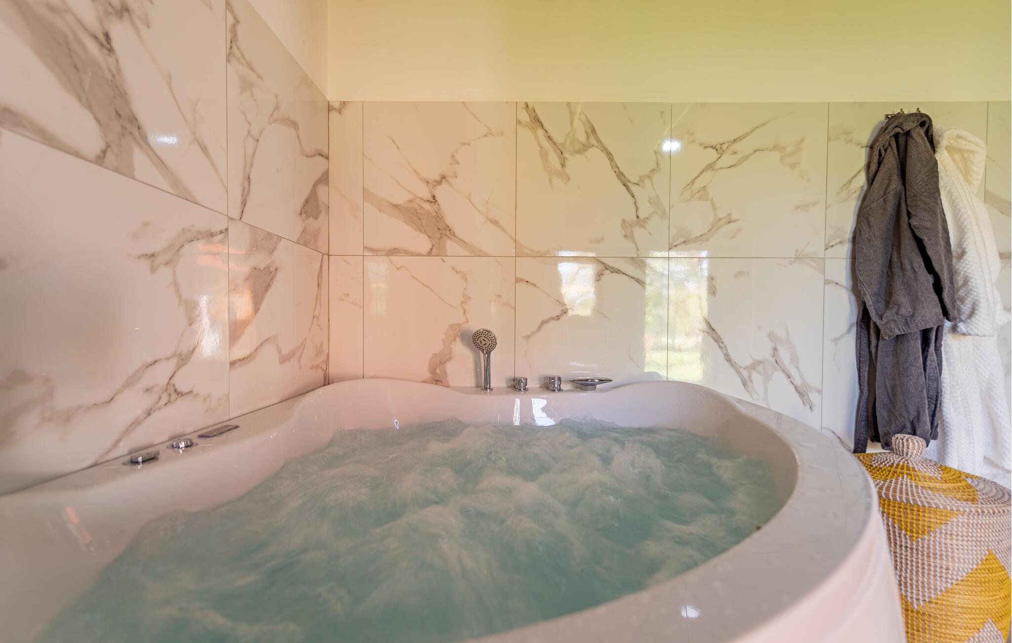 Udeområdet er minimum lige så lækkert og indbyder til mange timer i den bagende sol lige fra morgenstund. Nyd dagens første kaffe, lad solen bage jer godt igennem og hop en tur i poolen, lige som I lyster. Mens de voksne nyder solen og en god bog i liggestolene, kan børnene gå på opdagelse og brænde energi af med de fine legeredskaber på grunden. Holder vejret hele dagen, kan I fyre op i grillen og tilberede nogle saftige bøffer, lade blikket vandre over landskabet og runde aftenen af med en velfortjent tur i det udendørs spabad.