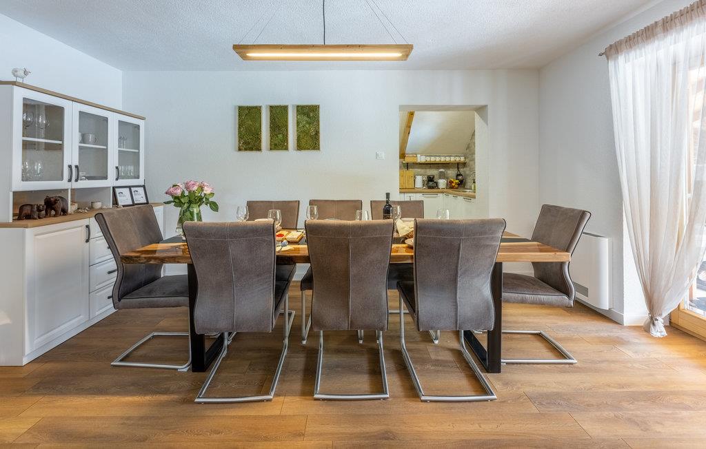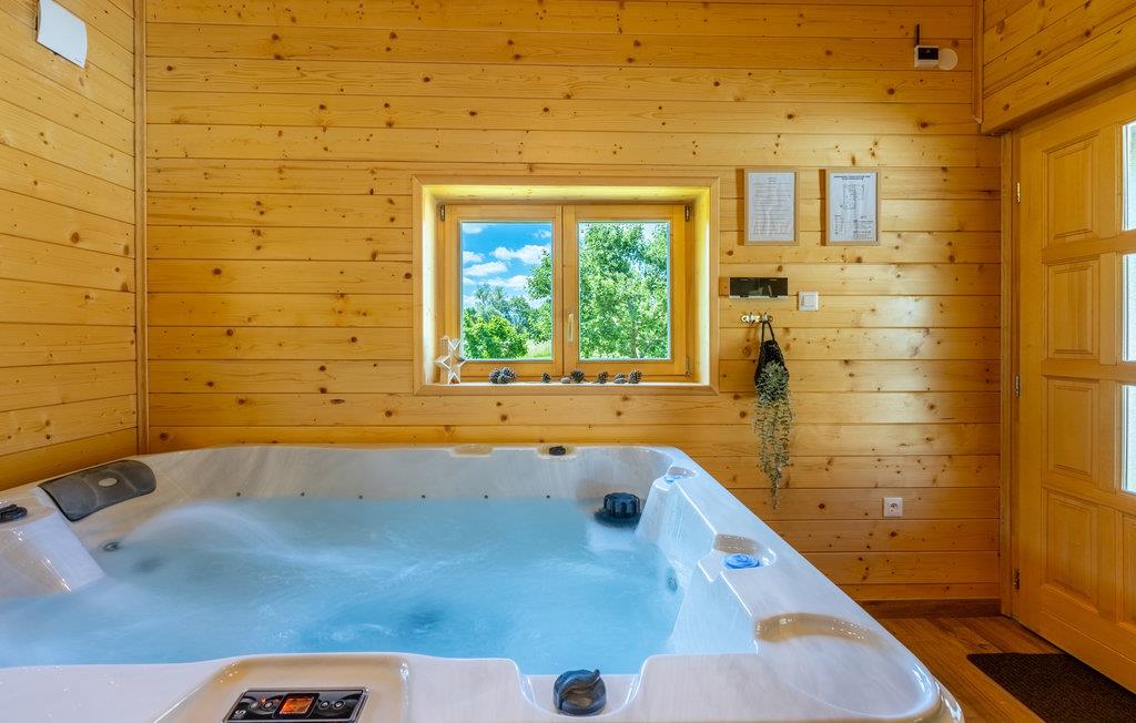 Glæd jer til en skøn ferie i dette moderne og stilfuldt indrettede feriehus, som ligger ud til et naturområde. Her finder I masser af plads og lyse, behageligt indrettede rum med bl.a. pejs og en hems. Antallet af badeværelser sørger for, at I ikke behøver vente længe i badekøen. Hvis I er til afslapning, går I ikke forgæves her - en udendørs pool, et spabad og en sauna står til rådighed.