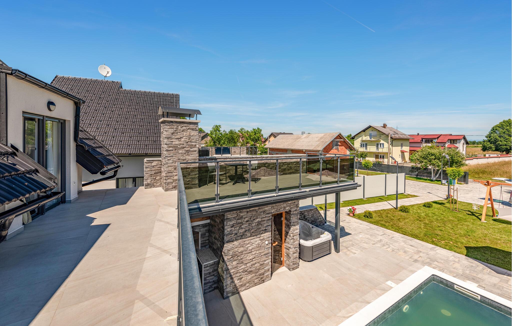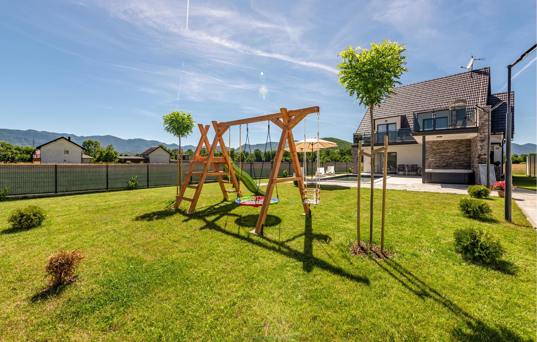 Begynd dagen med en god kop kaffe på den store terrasse, nyd den friske luft, fuglenes kvidren og lad blikkene vandre, inden I tager dagens første dukkert i poolen. Haven er et sandt slaraffenland for børnene, der får deres helt egen legeplads at boltre sig på, mens de voksne kan tage den med ro og tilberede familiens livretter på grillen. Forkæl jer selv med lidt lækker aften-wellness i spabadet eller saunaen, mens I lægger planer for de kommende dage.