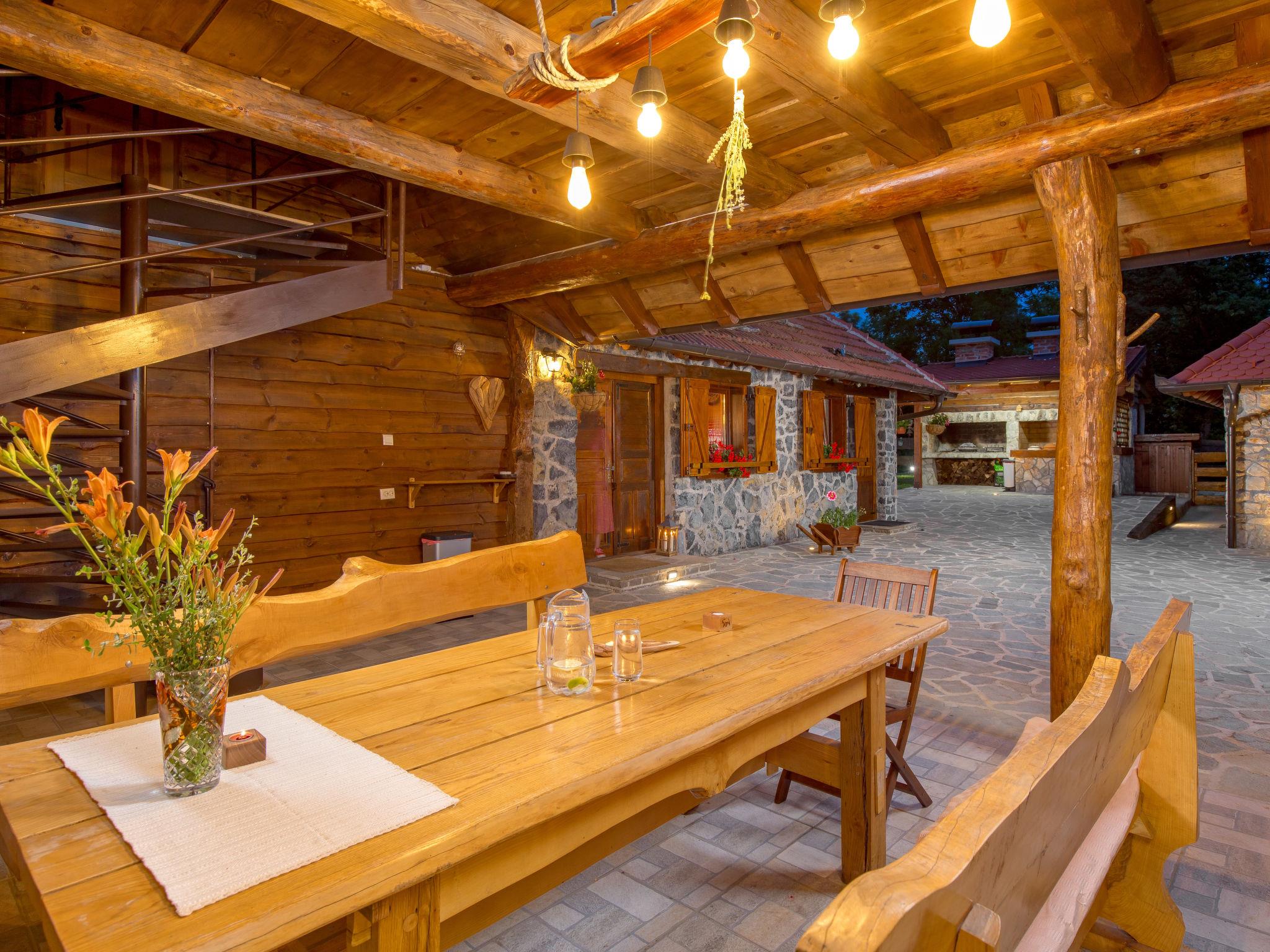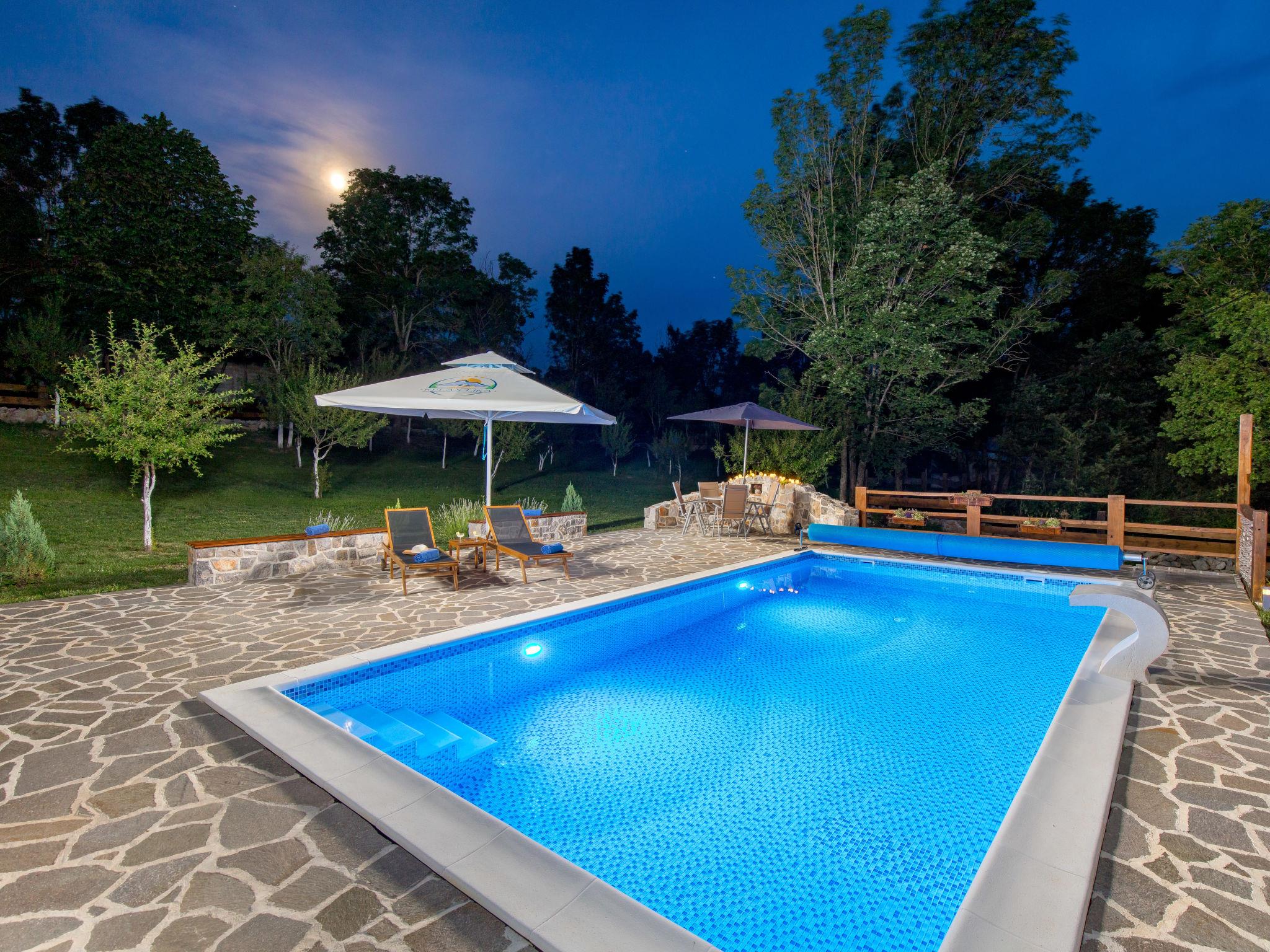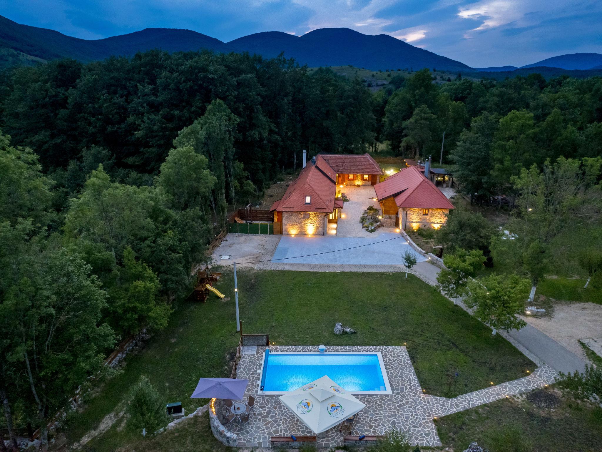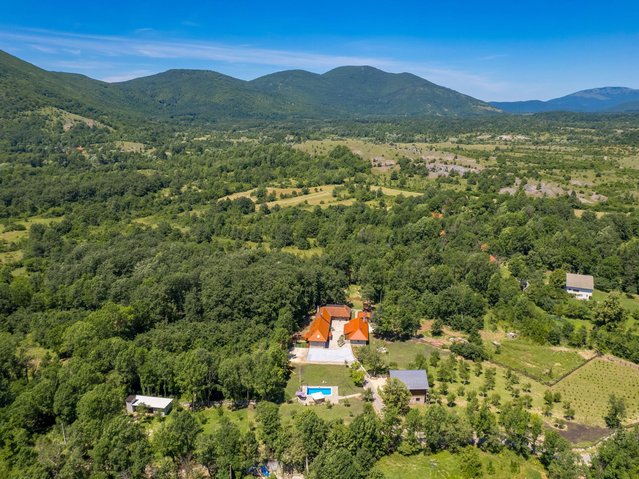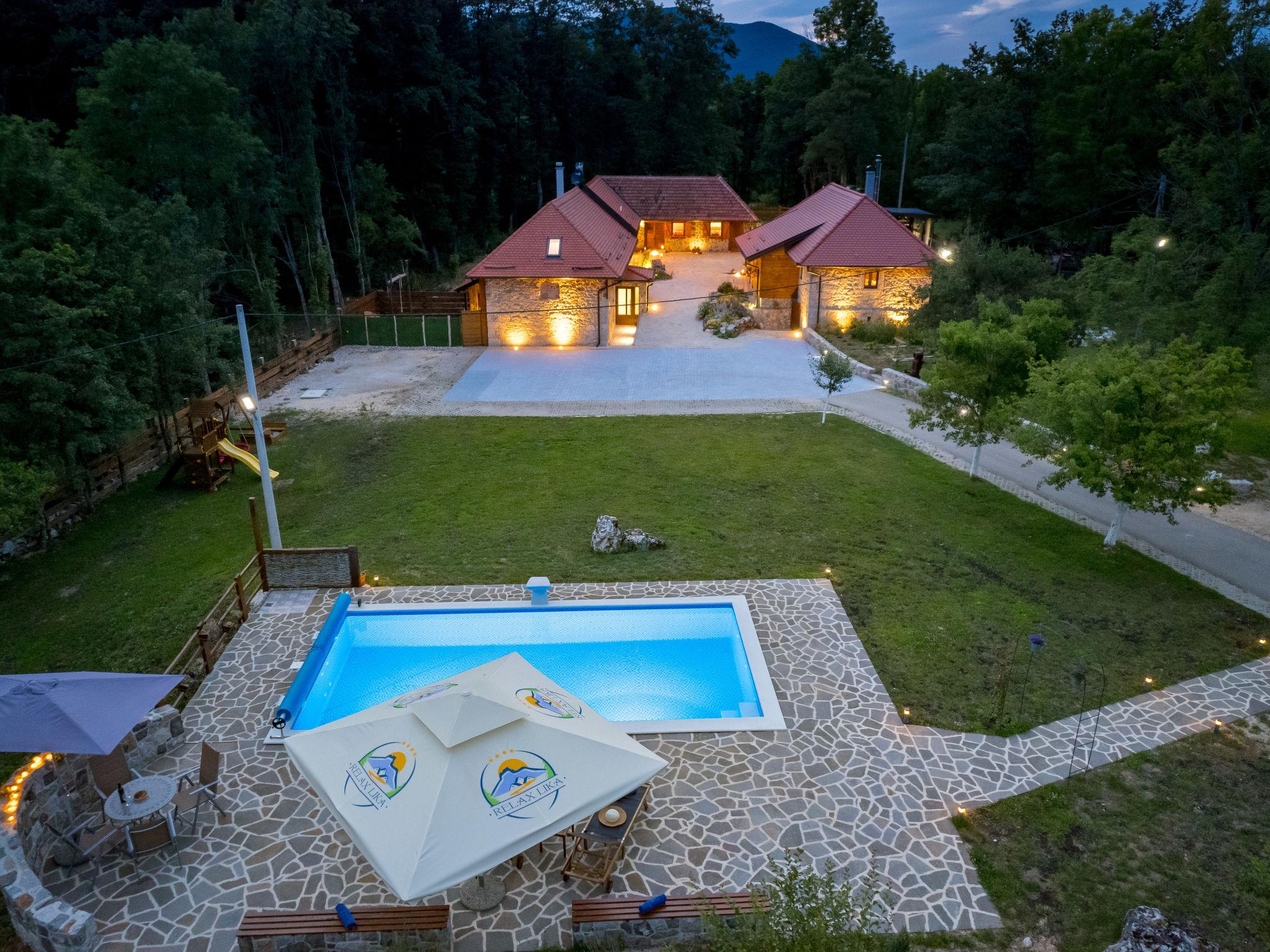 Large, comfortable country house "Relax Lika", 3 storeys, surrounded by trees and fields. In the hamlet Tomingaj 6 km from the centre of Gracac, in a secluded position, 45 km from the sea, 12 km from the lake, in the countryside, in the woods. Private: natural state property 2'000 m2, well-kept garden with wildlife garden and trees, swimming pool angular, heated (32 m2, depth 150 cm, seasonal availability: 01.May. - 01.Oct.) with internal staircase and salt-electrolysis pool-cleaning system. Outdoor shower, badminton, garden furniture, barbecue, children's playground (slide), pool maintenance by the owner/gardener. In the house: internet access, sauna, spa area, air conditioning, washing machine. Parking (for 5 cars) at the house on the premises. Shop 6 km, restaurant 5 km, bus stop 5 km, railway station 6 km, pebble beach "Rovanjska" 45 km, lake Ricica 12 km. Nearby attractions: Cerovacke Špilje 10 km, Jezero Ricice 12 km. Please note: car recommended. Groups of teenagers on request only. The owner lives on the same property. Animals in the neighbourhood. Motorway 50 km from the property. Railway line 6 km from the property. Airfield 70 km from the property. The wellness area on the ground floor consists of a steam and bio Finnish sauna, a heated hot tub for 6 people, warm benches, a cold barrel and two showers.