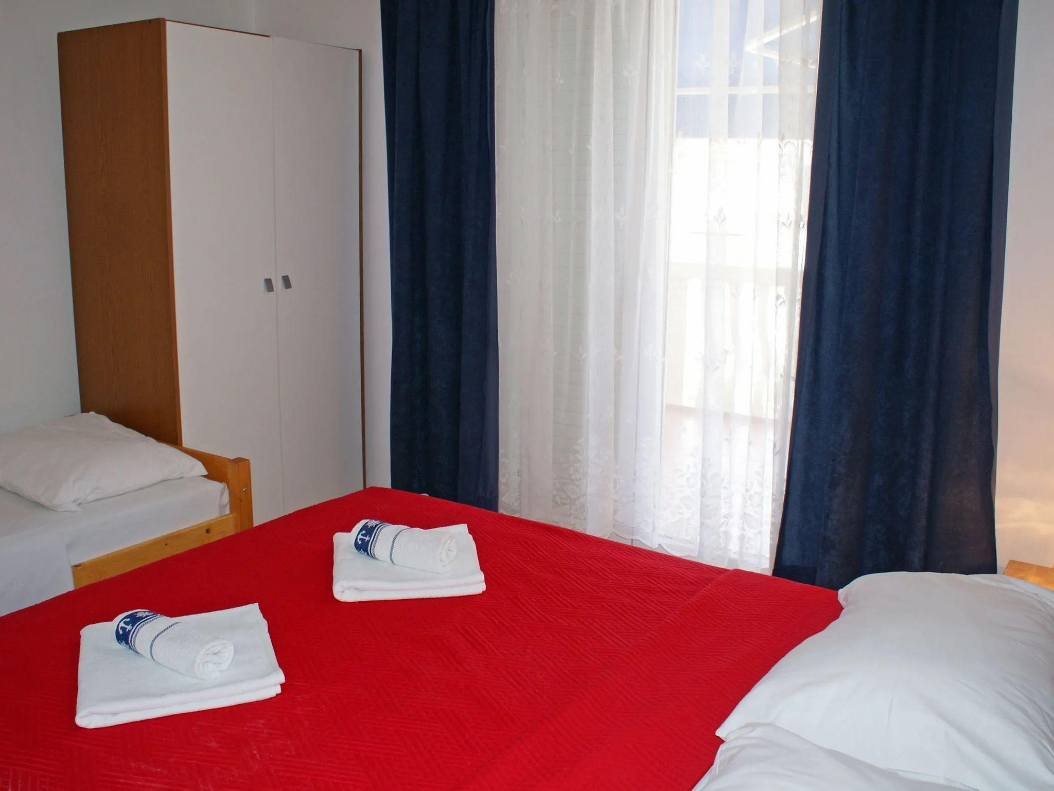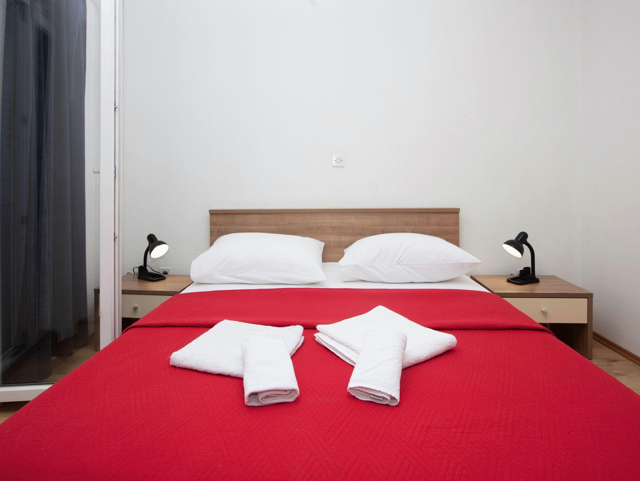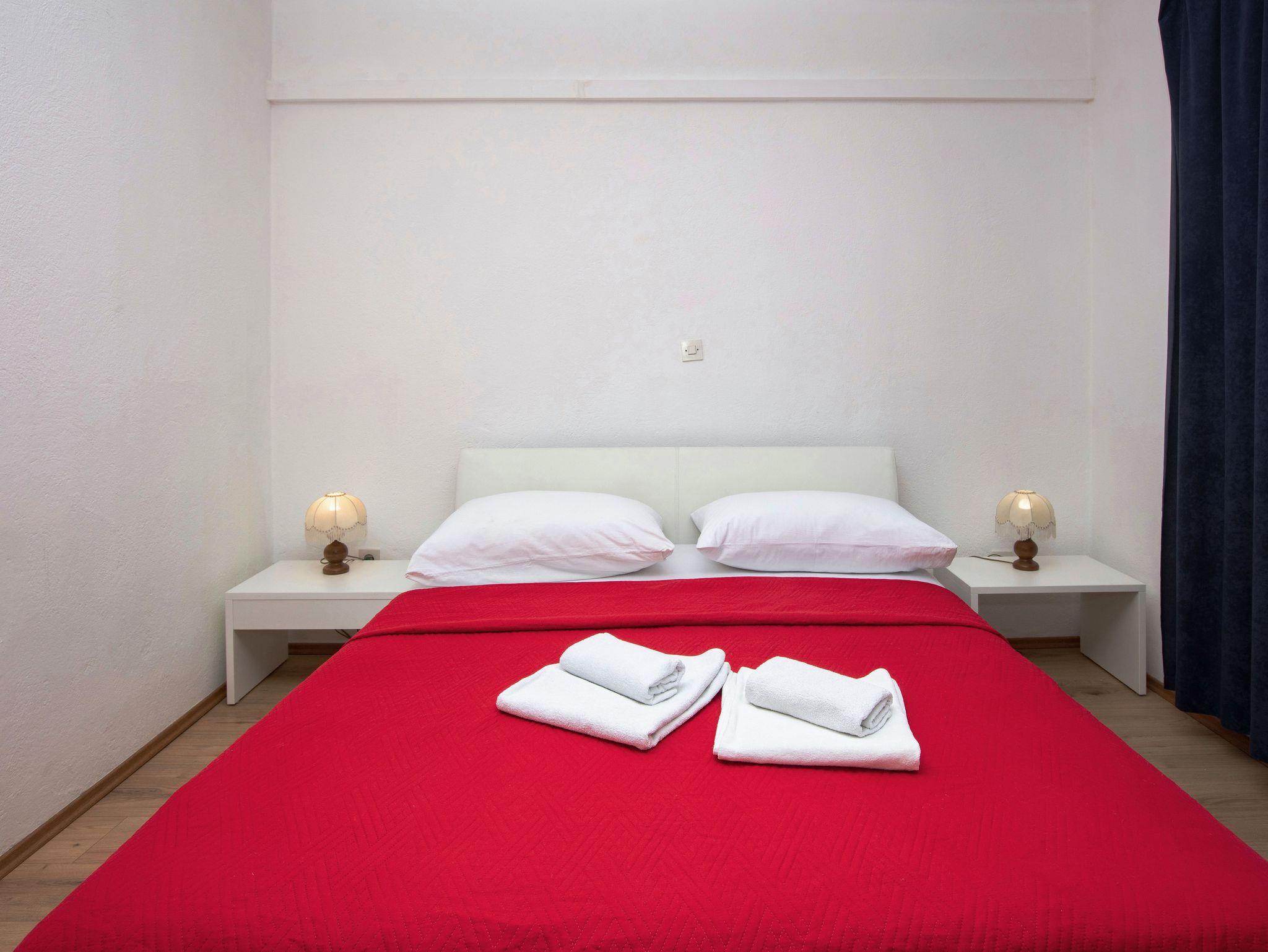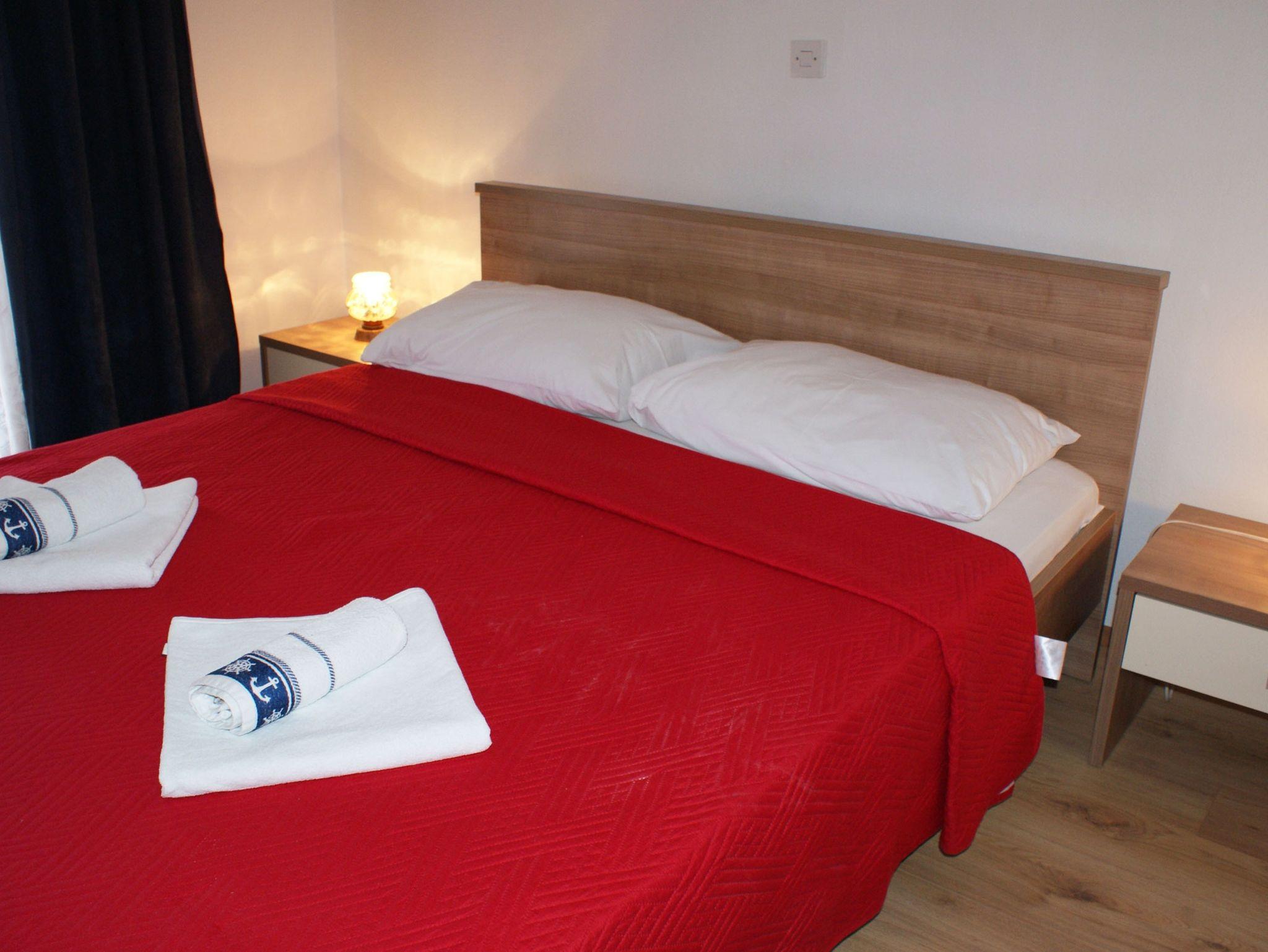 Ferienwohnung bietet Platz für 4 Gäste. Die Betten sind in Schlafzimmern, die es 2 gibt, innerhalb einer Gesamtfläche von 39m2, angeordnet. Die Gäste haben eine eigene Terrasse zur Verfügung, auf der sie in warmen Sommernächten genießen können. Das Apartment bietet Meerblick. Es ist erlaubt, Speisen auf dem Gemeinschafts-Grill vorzubereiten. IM PREIS INBEGRIFFEN: Kurtaxe, Endreinigung, Klimatisierung, Parkplatz, Internet, Wäschewaschen, Bootsanlegeplatz, Kinderbett, Bügeleisen, Bügelbrett, Föhn, tragbarer Grill. VERBINDLICHE ZUSÄTZLICHE KOSTEN: Aufzahlung für Kurzaufenthalte (prozentualer Zuschlag pro Nächtigungsanzahl: 30% - 1, 20% - 2, 10% - 3). UNVERBINDLICHE ZUSÄTZLICHE KOSTEN: Zusatzbett (8,00 € pro Nacht). Die Verfügbarkeit zusätzlicher Dienstleistungen in Ihrem reservierten Termin und die Preise derselben (falls nicht aufgeführt) müssen im Voraus überprüft werden. Zusätzliche Dienstleistungen die in der Zahlungsaufforderung nicht aufgeführt sind werden direkt beim Vermieter bezahlt, angenommen der Gast nutzt auch diese. Ermäßigung auf den Grundpreis: Gratistag 14=13 (bei einem Aufenthalt von 14 Tagen oder mehr erhalten Sie einen Gratistag für den Aufenthalt bis 31.12.26).